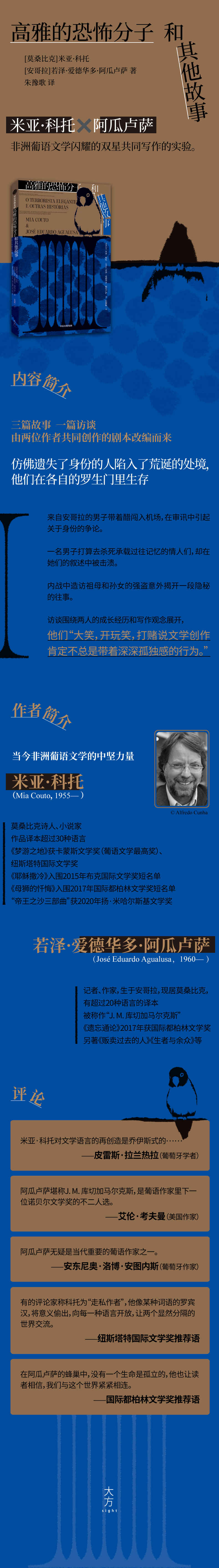 一场非洲葡语文学闪耀的双星共同写作的实验:米亚·科托曾获卡蒙斯文学奖(葡语文学高奖)、纽斯塔特国际文学奖,曾著《母狮的忏悔》《耶稣撒冷》《梦游之地》《灰烬女人》《剑与矛》《饮地平线的人》等;阿瓜卢萨曾获都柏林国际文学奖,被称作“库切+马尔克斯”,曾著《遗忘通论》《贩卖过去的人》《生者与余众》等。 三篇故事和一篇访谈。故事由两位作者共同创作的剧本改编而来,遗失身份的人陷入了荒诞的处境,他们在各自的罗生门里生存。访谈围绕两人的成长经历和写作观念展开,他们“大笑,开玩笑,打赌说文学创作肯定不总是带着深深孤独感的行为。”