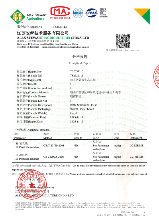 虽然声胜是绿手指的员工,是同事,但绿手指还是一贯的严谨态度,去年(2024年9月)负责选品的薛老师和农场小伙伴建兴他们一起去到了江西赣南声胜的脐橙种植基地考察和走访,并现场采摘果子送检检测农残,还对接了有机认证的老师到现场检查,现已获得有机转换认证证书,295项农残无检出。(检测报告和有机转换认证书见详情末尾)