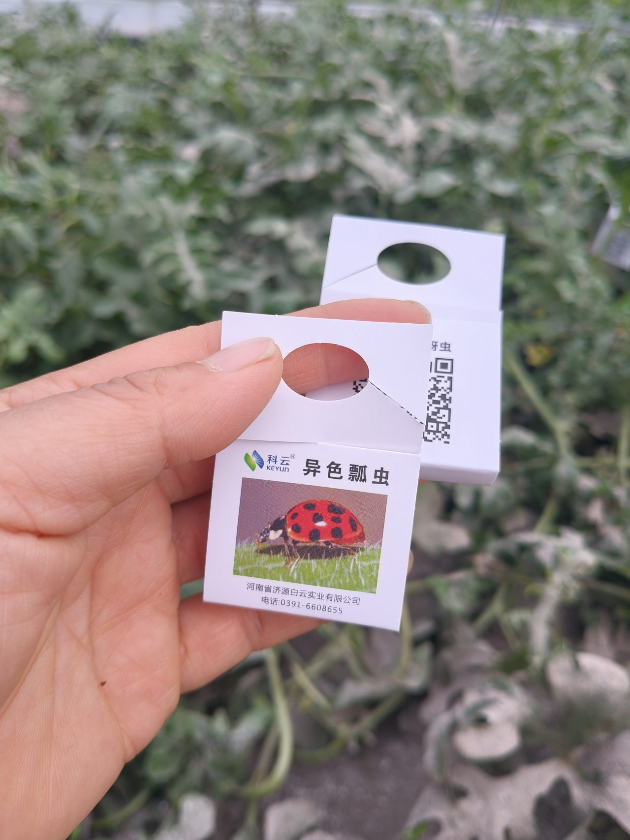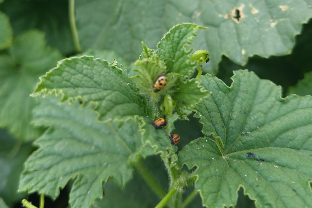 冷棚里的香瓜,蚜虫大爆发时候叶片全部是黑色的。眼看着蚜虫家族在香瓜地里繁衍,无奈之下,买了一些卵卡和瓢虫成虫来对付蚜虫,其实这么点瓢虫,和那么多蚜虫作战,有点寡不敌众,但是话说回来,有比没有强。