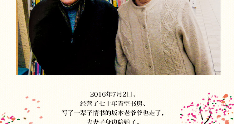坂本健一,生于一九二三年,日本大阪旧书店行业的元老。从小爱读书、善绘画,曾受教于画家黑田重太郎、田村孝之介。战后,他在黑崎町开了青空书店,与妻子和美努力经营,并因此与田边圣子、山本一力、筒井康隆等作家结为好友。坂本先生读书广博,兼具雅趣,无论是手绘店休日海报,还是写给妻子的情书,皆回味悠长、情深意重。他和青空书店的故事,被日本报纸《朝日新闻》《读卖新闻》《每日新闻》等多次报道,广受好评。二〇一六年七月二日,坂本先生安详离世,享年九十三岁。