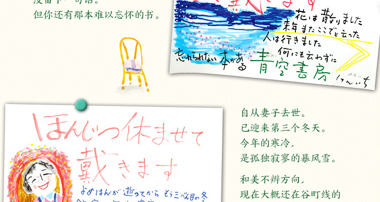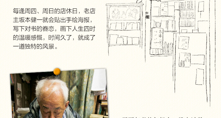 在大阪的黑崎町,有一家开了七十年的青空书房。每逢周四、周日的店休日,老店主坂本健一就会贴出手绘海报,写下对书的眷恋,画下人生四时的温暖感慨,时间久了,就成了一道独特的风景。 买不起书的年轻人、没上过学的中年人、鼎鼎大名的文学家,都喜欢到这里来。开了一辈子旧书店,坂本先生的愿望就是让好书与好人相遇,与妻子共度一生。
