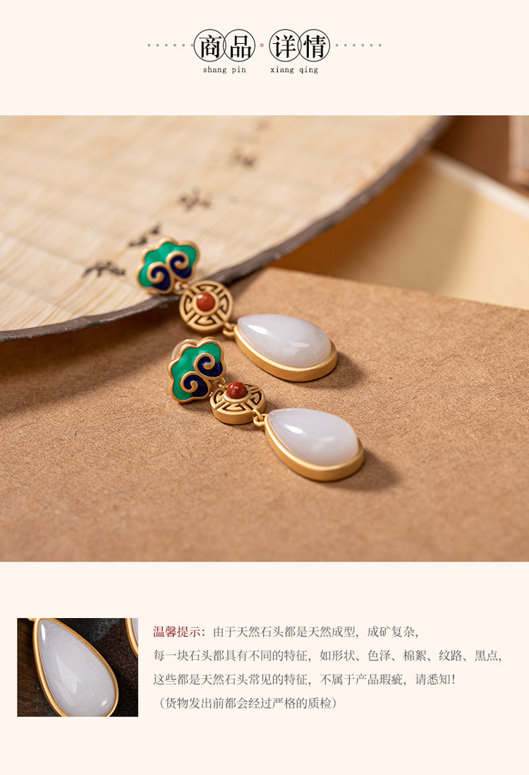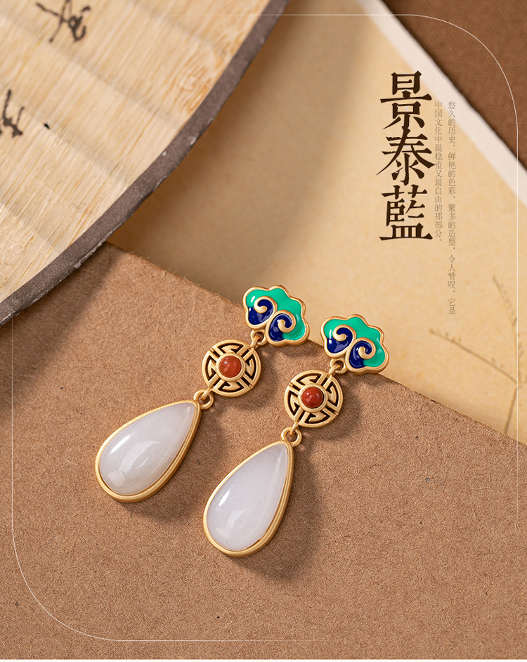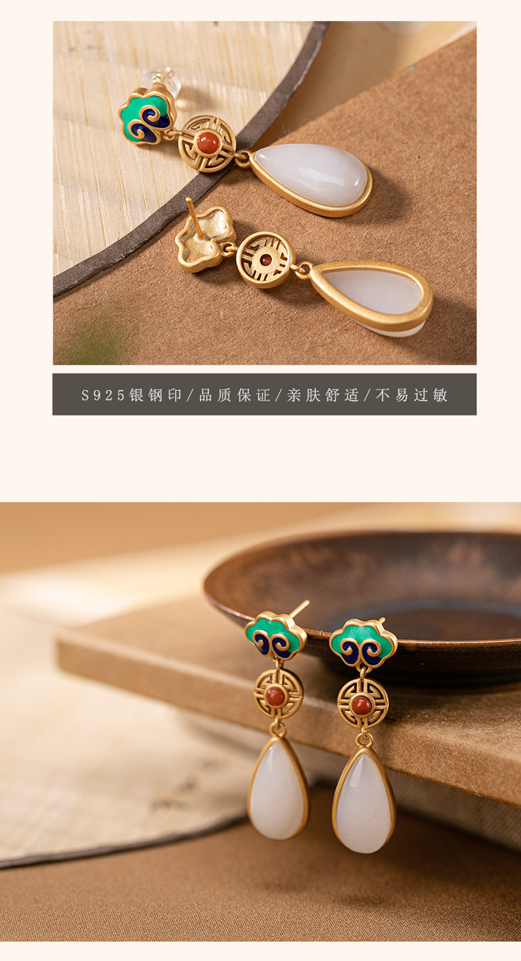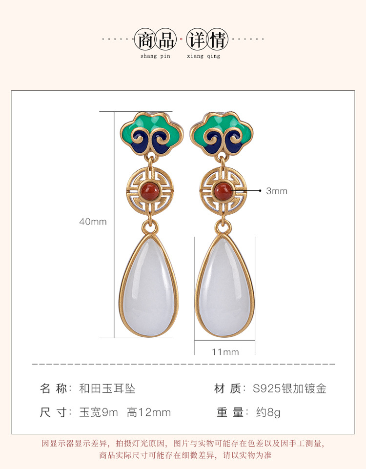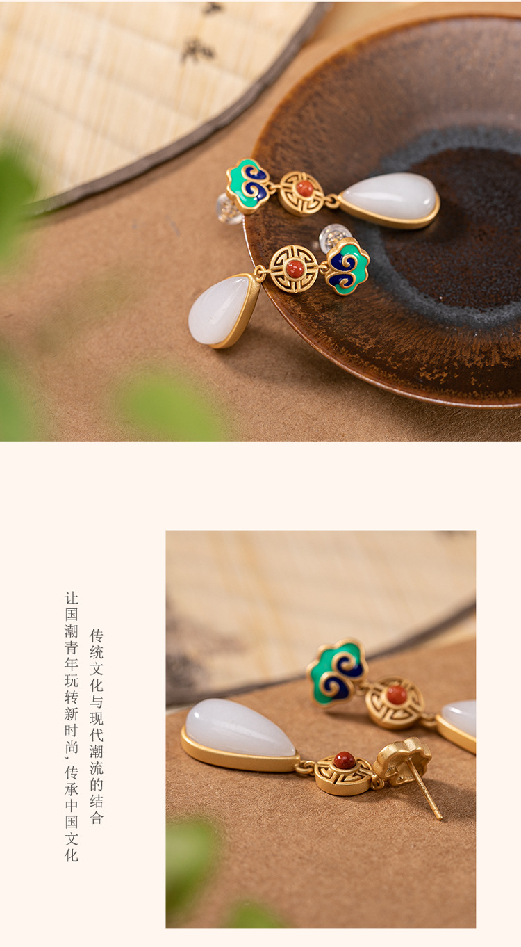 S925纯银珐琅景泰蓝镀金和田玉白玉如意气质耳钉耳坠CW
