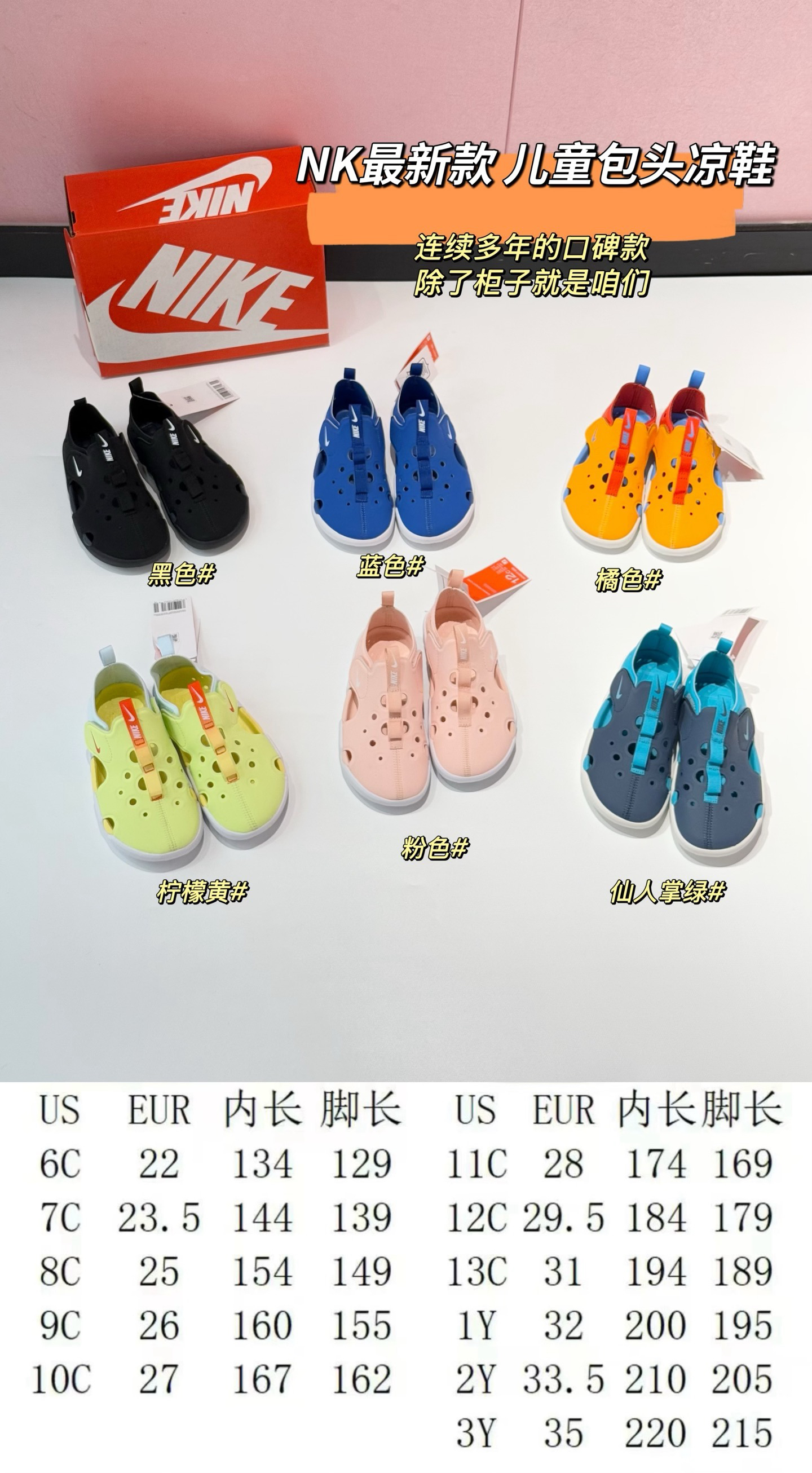 🔺NK今年新款 | NK经典款儿童包头凉鞋来了,这次有新配色,男女童同款的哈,6个颜色随便选。咱们的老渠道了,真正的原厂原料❗️大家可以柜子上随便去对比下。他家的童鞋是真的好穿,符合各种年龄段的儿童鞋子,完全按照不同年龄段儿童脚型需求设计而来的,超级专业。一整批Y厂出货,每一双都是独立包装,带鞋盒的,可以送人可以自留,非常好看又实用的儿童鞋,娃娃们夏季的小凉鞋可以备起来了~