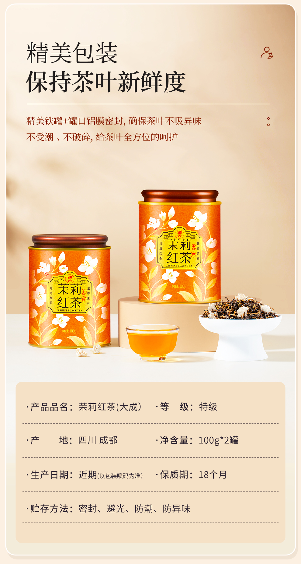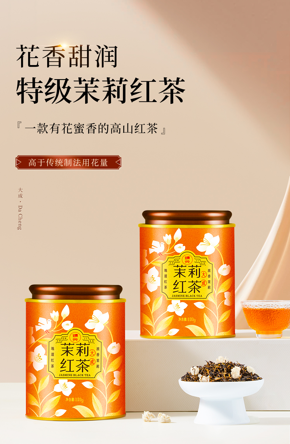 【臻尖-茉莉红茶大成】茉莉红茶特级浓香型茉莉花茶茶叶100g*2罐
