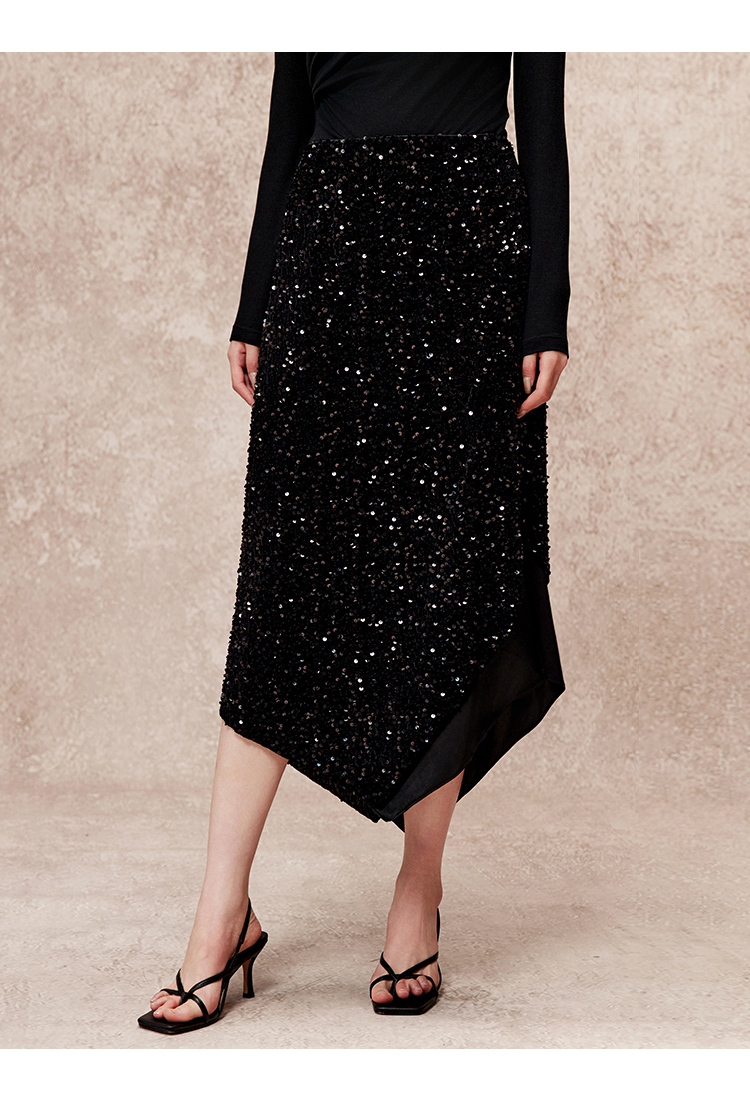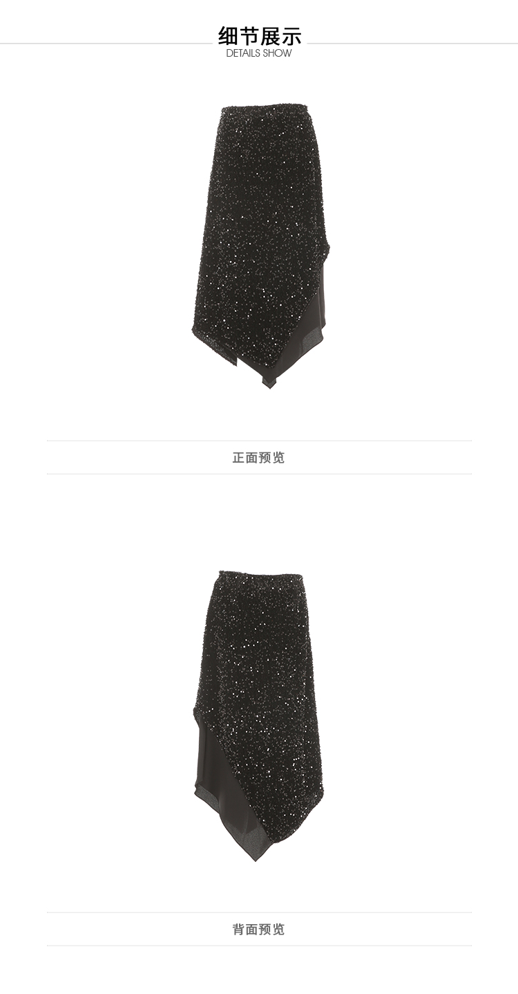 VIMAGE纬漫纪冬季新款复古时髦重工亮片显瘦百搭黑色半身裙V2206817