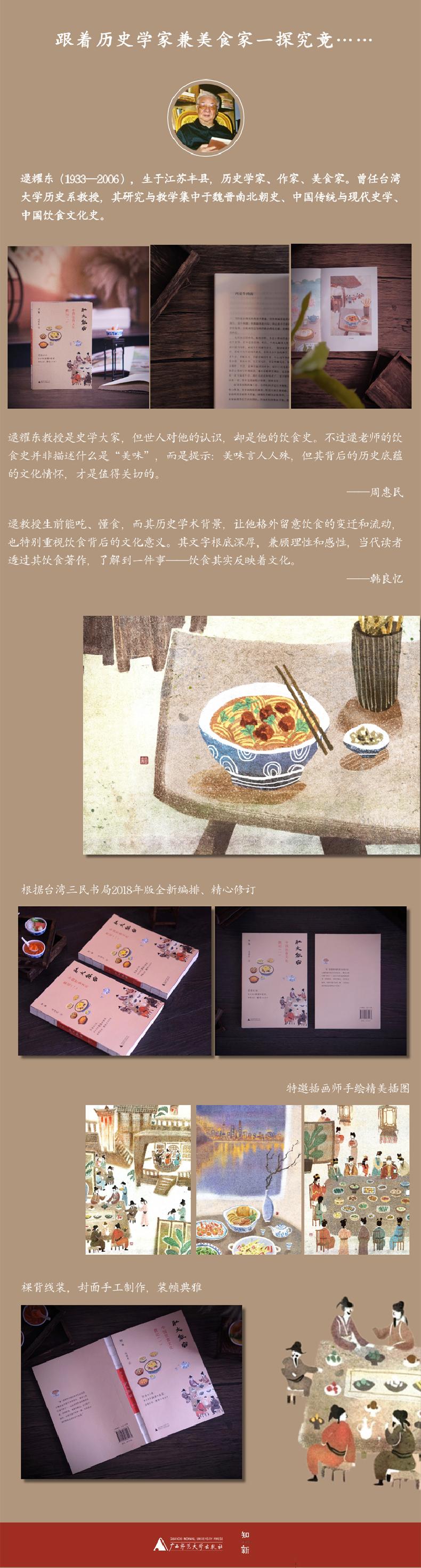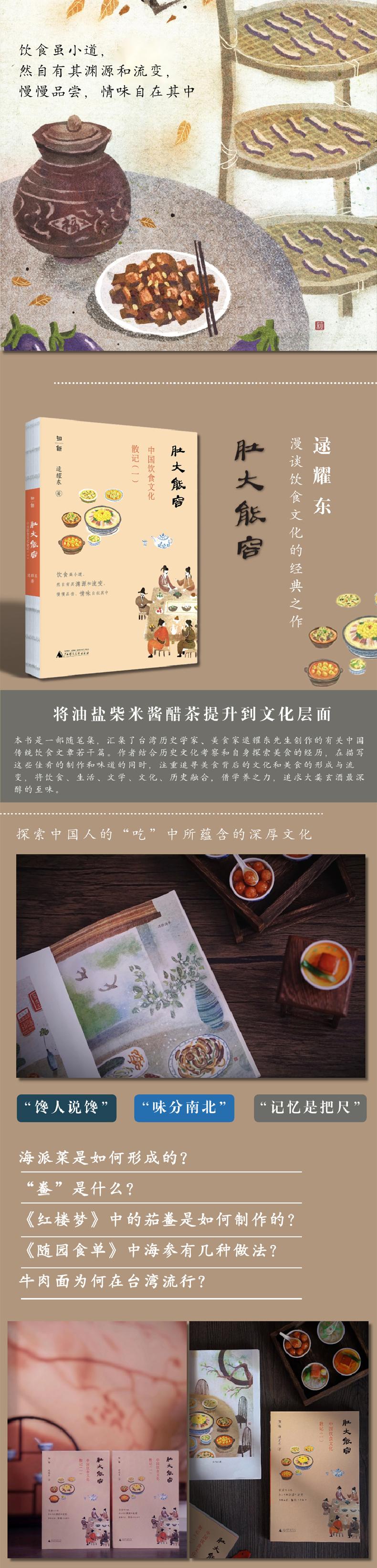 本书作者逯耀东曾是台湾大学历史系教授,但其对中国饮食文化研究亦深,曾在大学开设“中国饮食史”“中国饮食与文化”“中国饮食与文学”等课程,自谦是“饮食文化工作者”。逯先生将严谨的史学考察、生动的文学笔调与丰富的生活体验相结合,创作了一系列探讨中国饮食文化的文章,于2001年由台湾三民书局次集结出版,取名《肚大能容》。其后于2007年、2018年两度修订再版,一直以来,深受各界好评。此次出版,以三民书局2018年版为基础进行修订,将全书分为“馋人说馋”“味分南北”“记忆是把尺”三辑,并配以优美的插图,其中第三辑是2001后作者陆续发表的九篇作品。在此,诚邀广大读者朋友,再次品尝逯先生的笔下的“美味佳肴”,享一场饮食文化的盛宴。