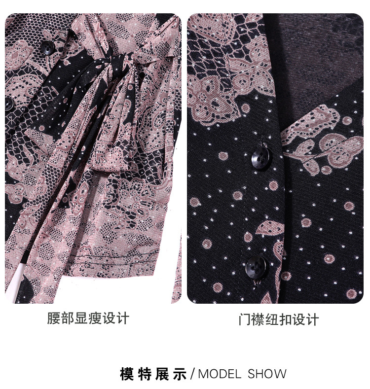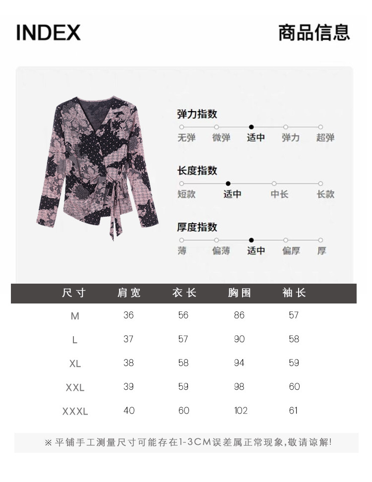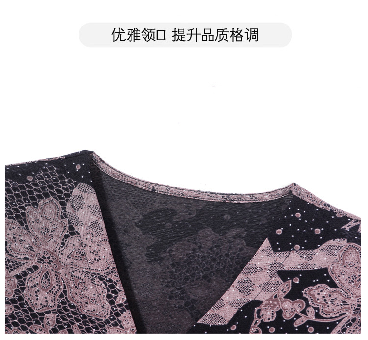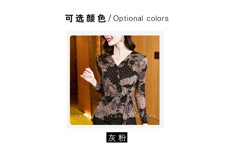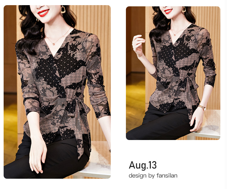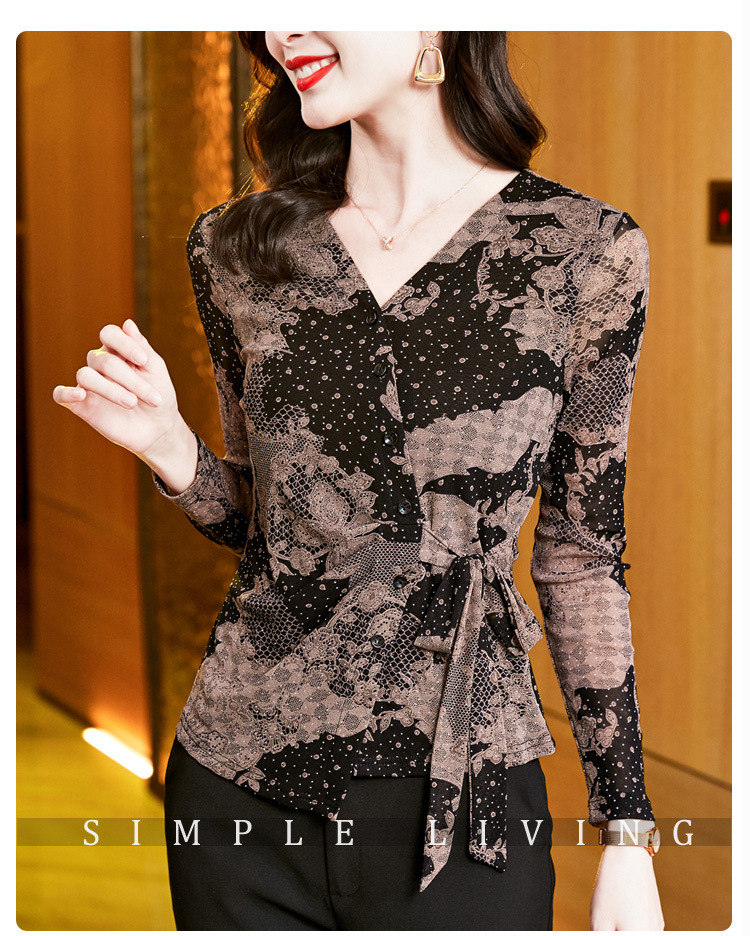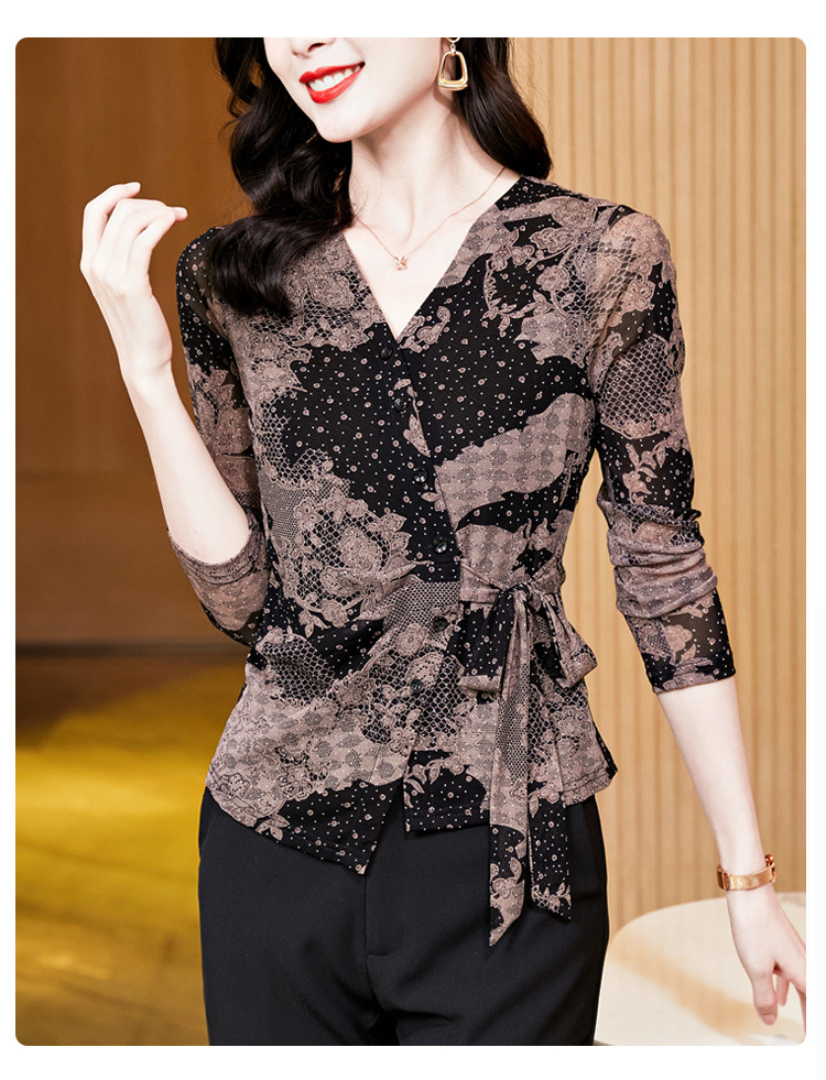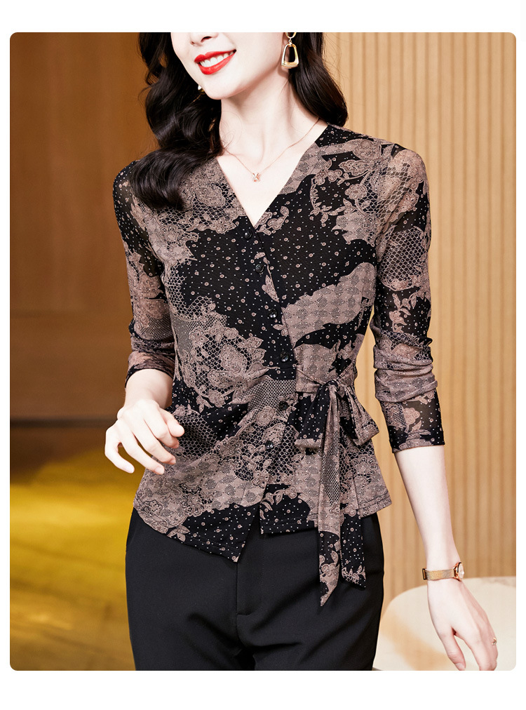 KQL E37M2952气质百搭V领印花网纱长袖系带打底衫大码t恤
