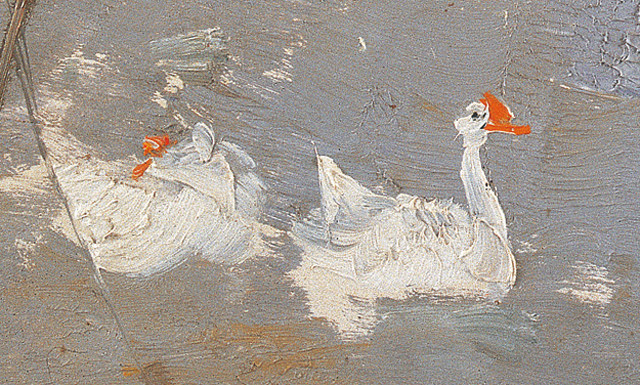 乌黑的渔舟是杠杆,是秤锤,压住了画面的平稳;红点更是点白成鹅的关键之笔,虽点时匆匆,实落笔干钧。画成,如一气攀登了海拔三千公尺的高峰,累极,作者以紧张的艰辛营造观众的轻松欢愉。