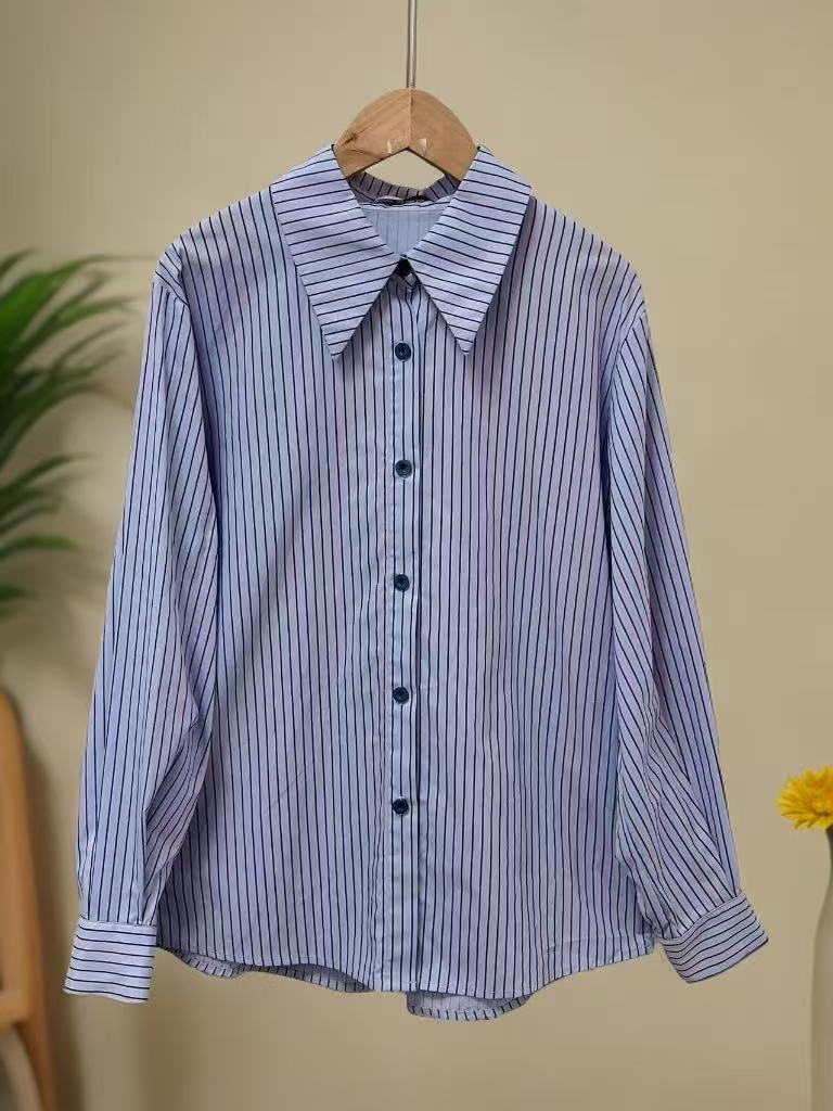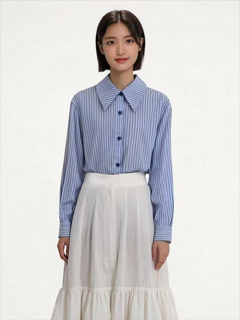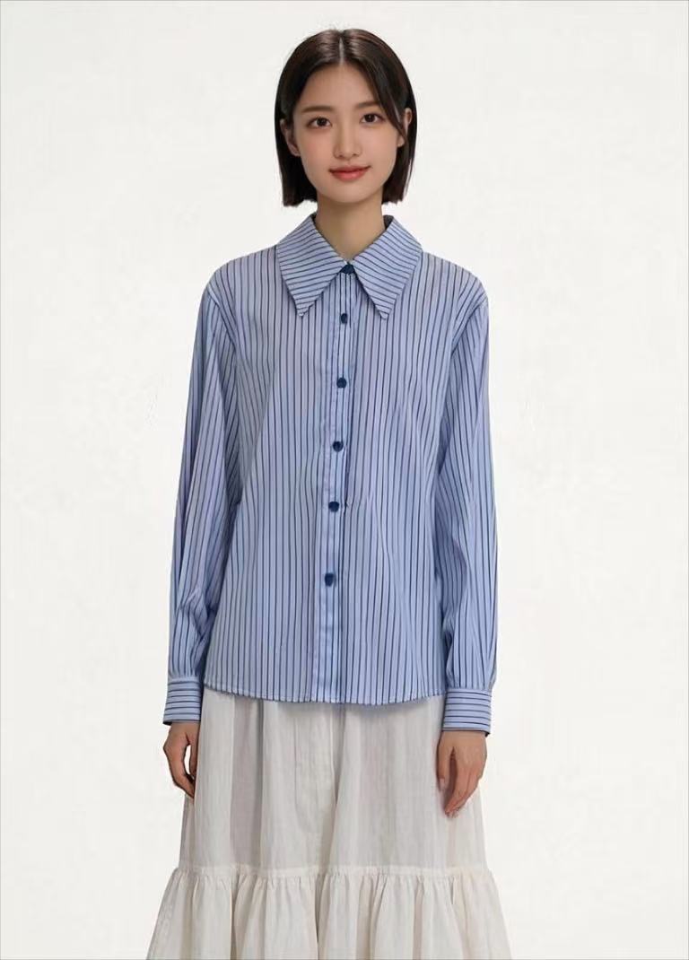 赠送披肩【早秋特卖】6201蓝色100%棉条纹长袖衬衫-喜出