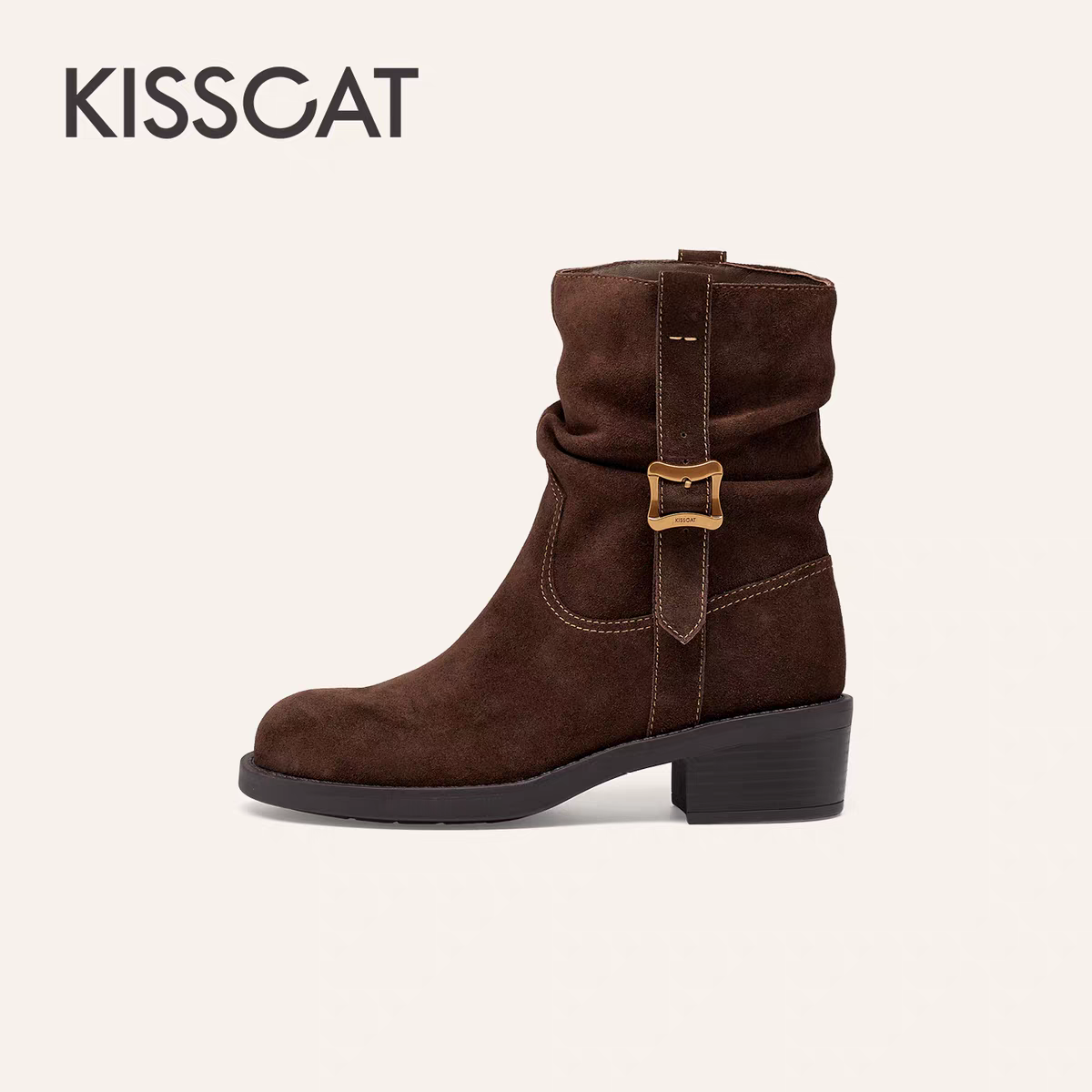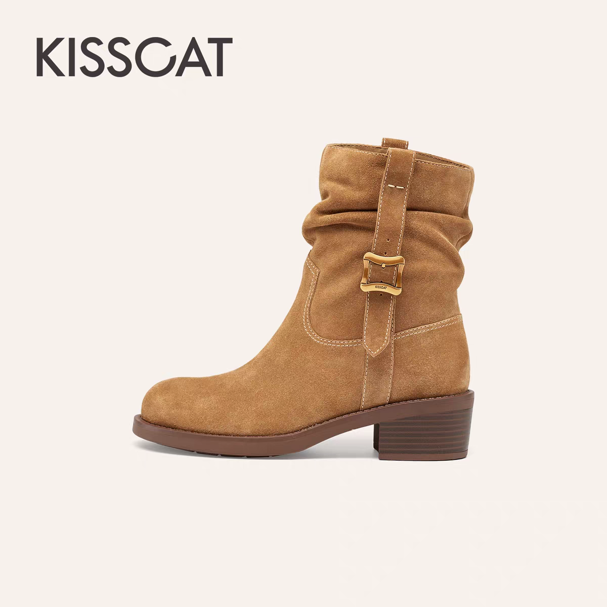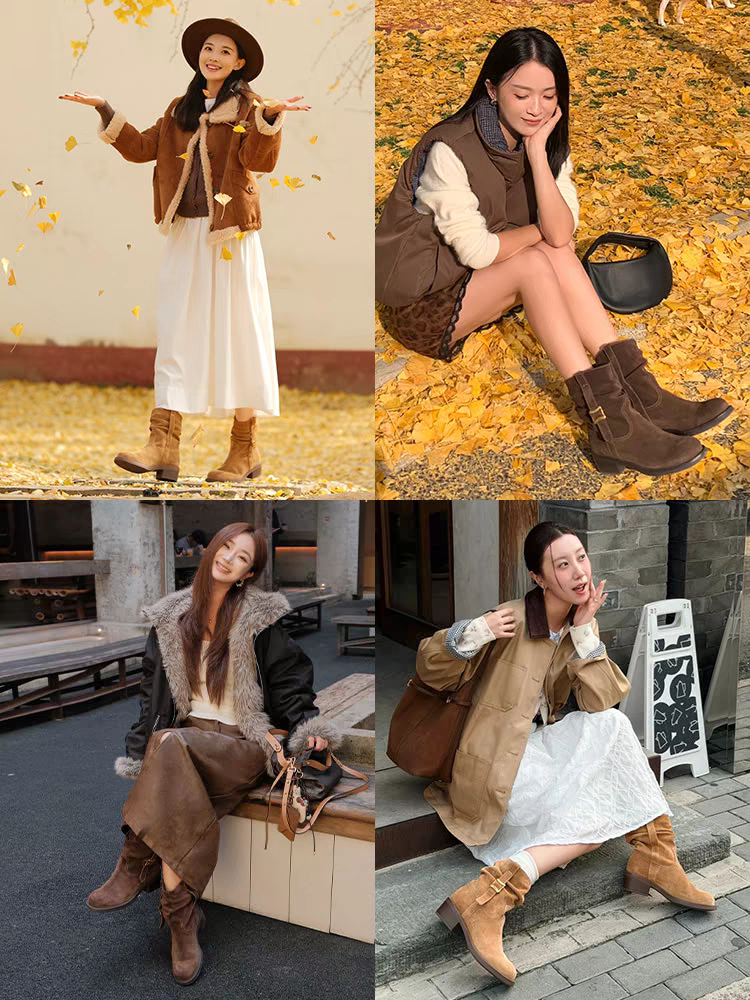 「李兰迪/美洋同款接吻猫[落日大道]麂皮筒靴西部堆堆靴牛仔靴加绒」