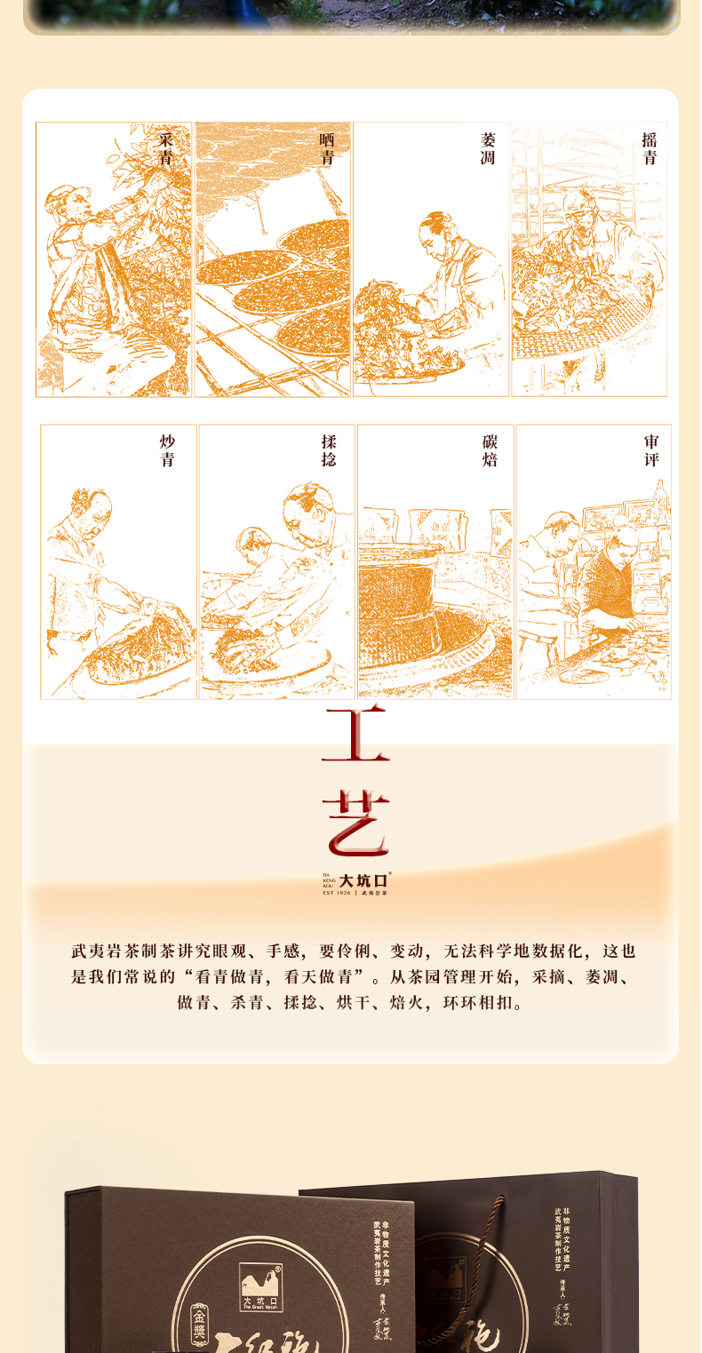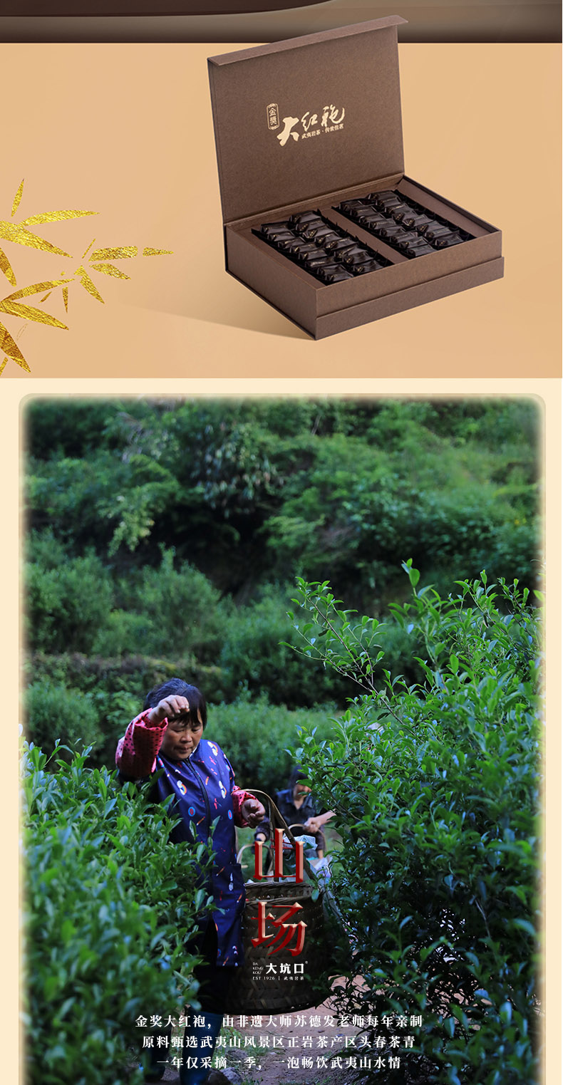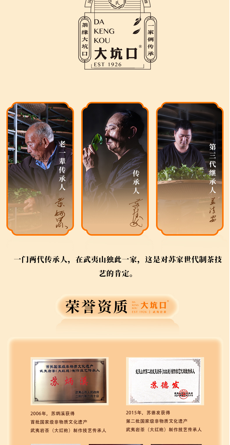 大坑口岩茶有限公司,位于武夷山市-天心村,茶山分布于正岩产区的“三坑、两涧”,由首批非物质文化遗产武夷岩茶制作技艺传承人:苏炳溪和第二批传承人:苏德发先生的精心手工制作,造就了大坑口岩茶的独特品质