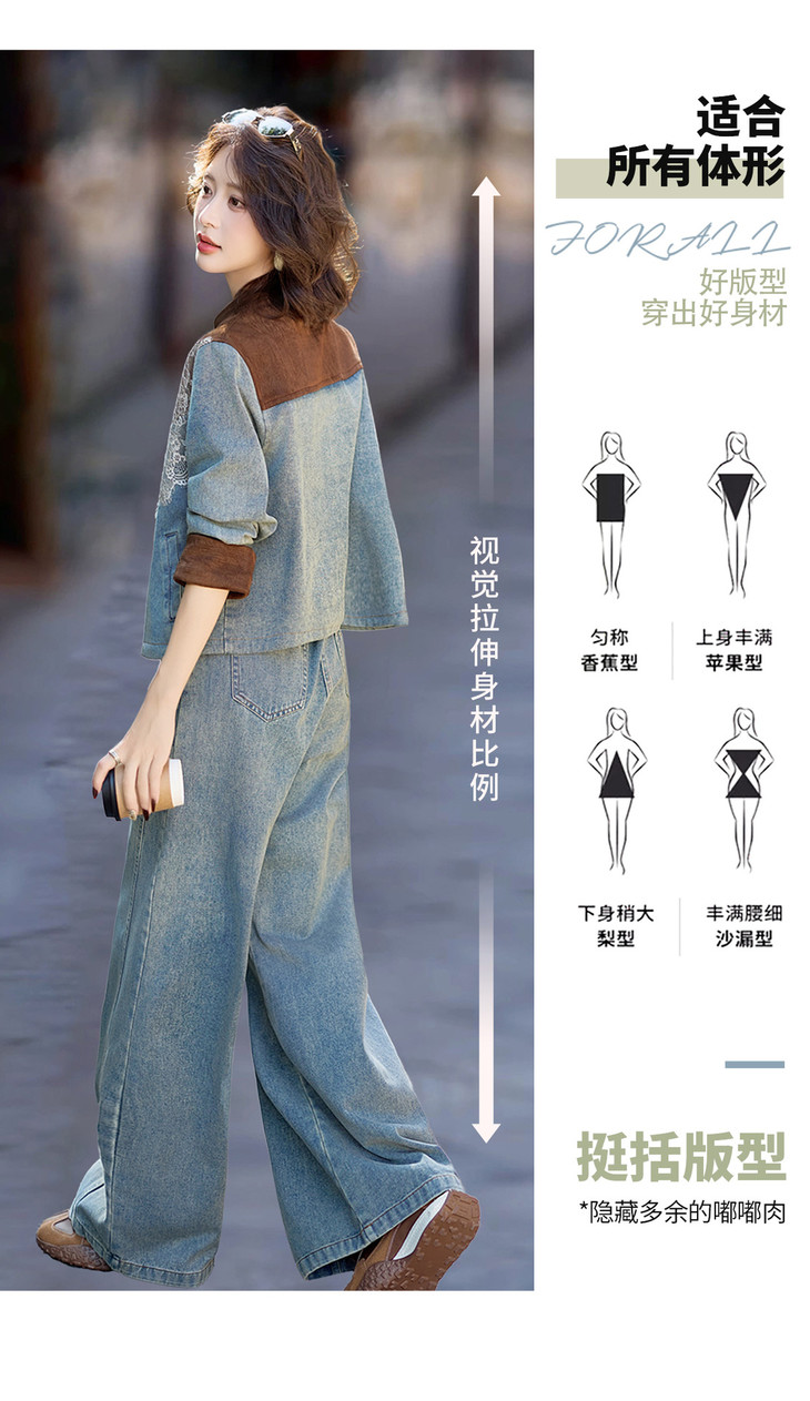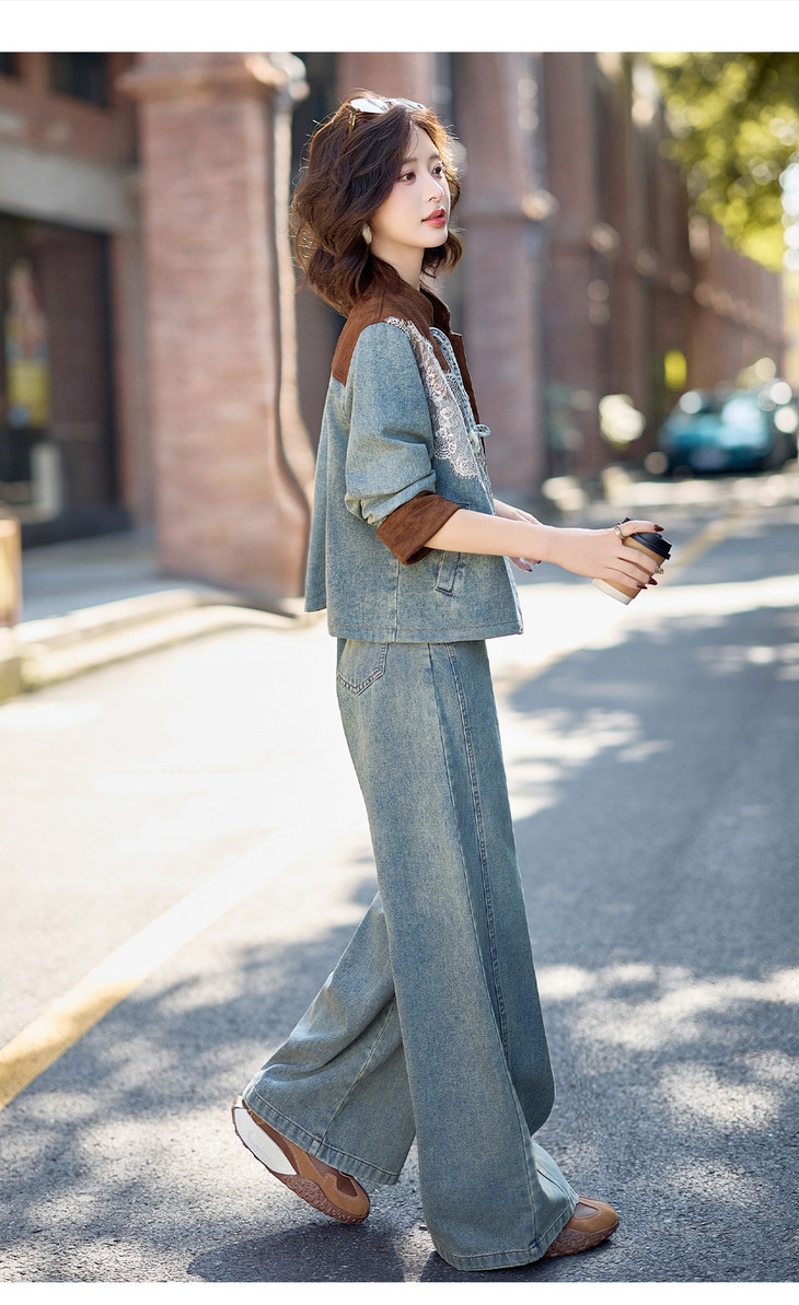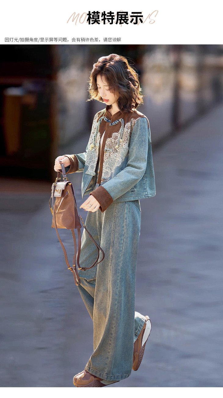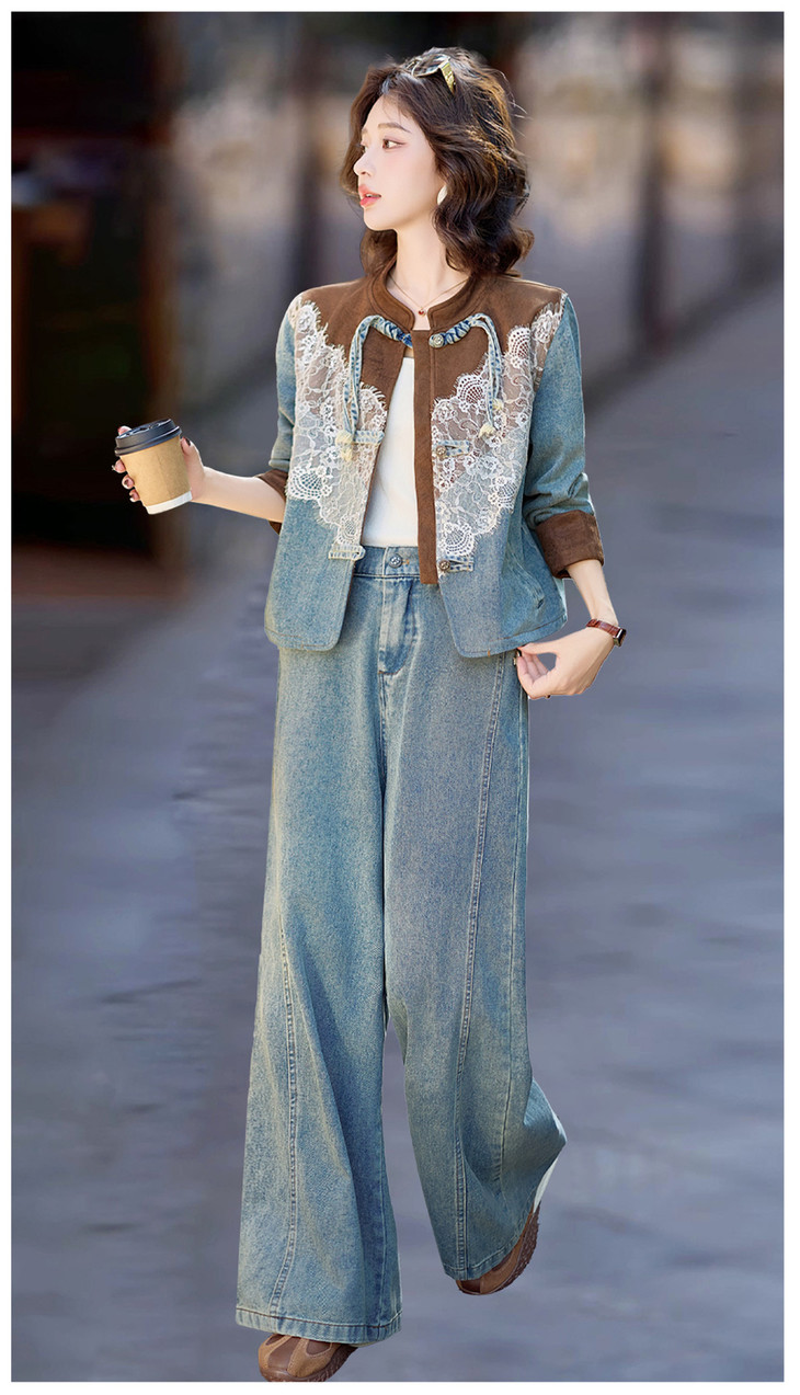 新中式牛仔套装,时尚洋气蕾丝拼接外套两件套HR-XPH5892