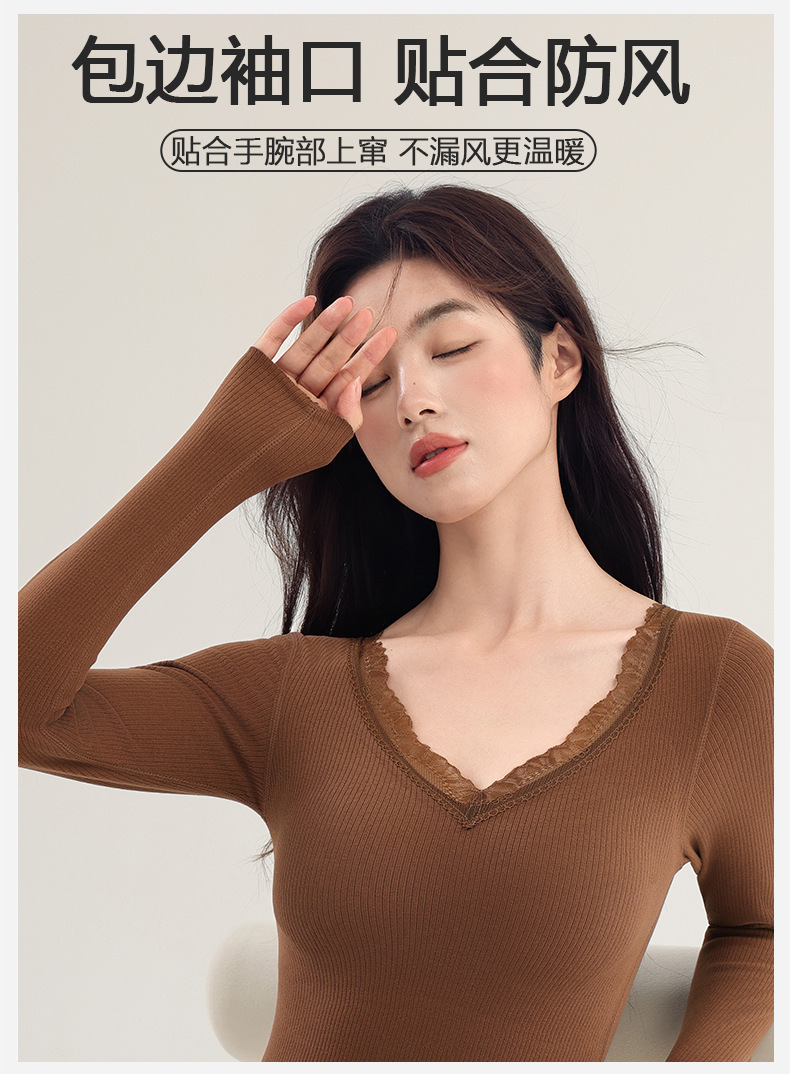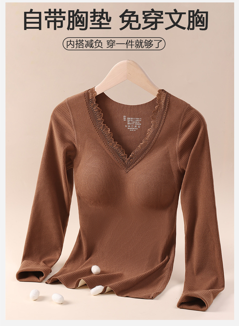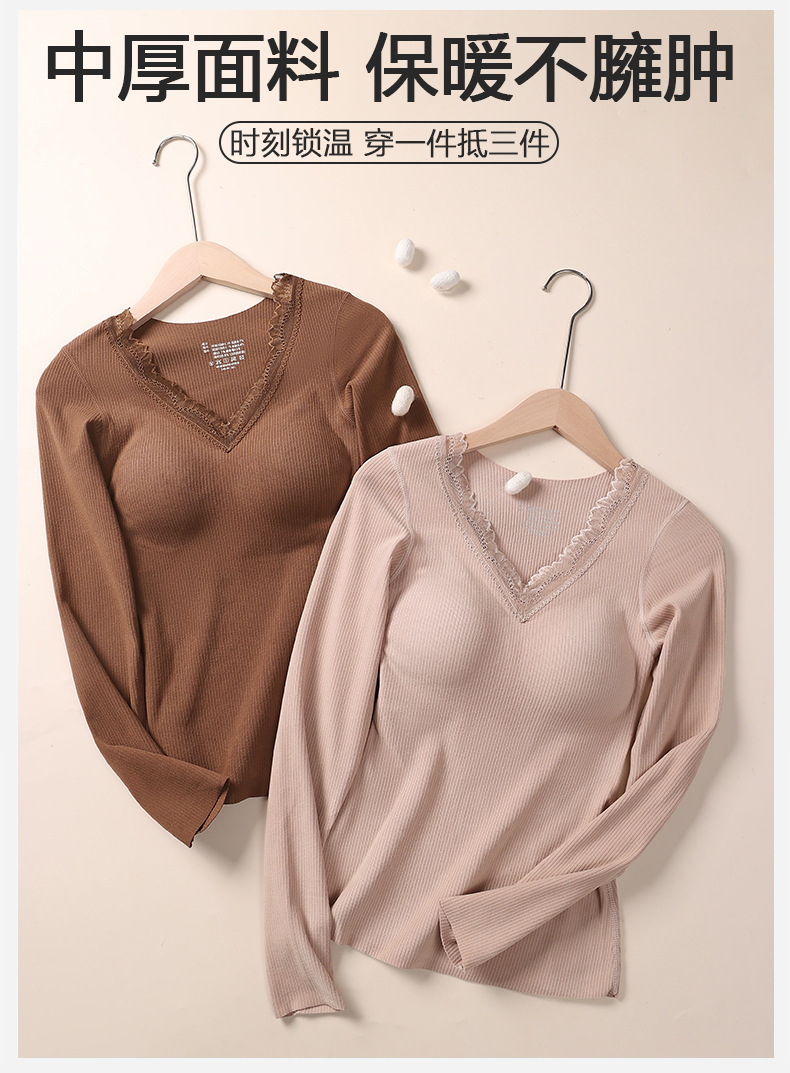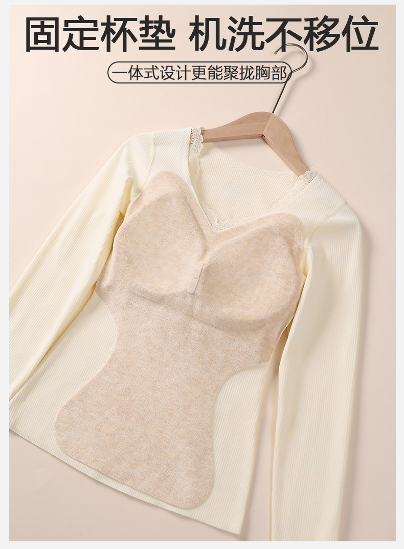 雀说 蕾丝秋冬羊绒蚕丝保暖内衣女带胸垫单件上衣