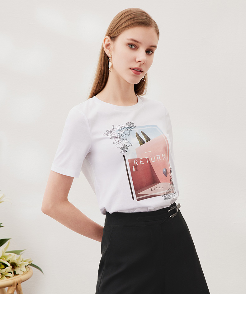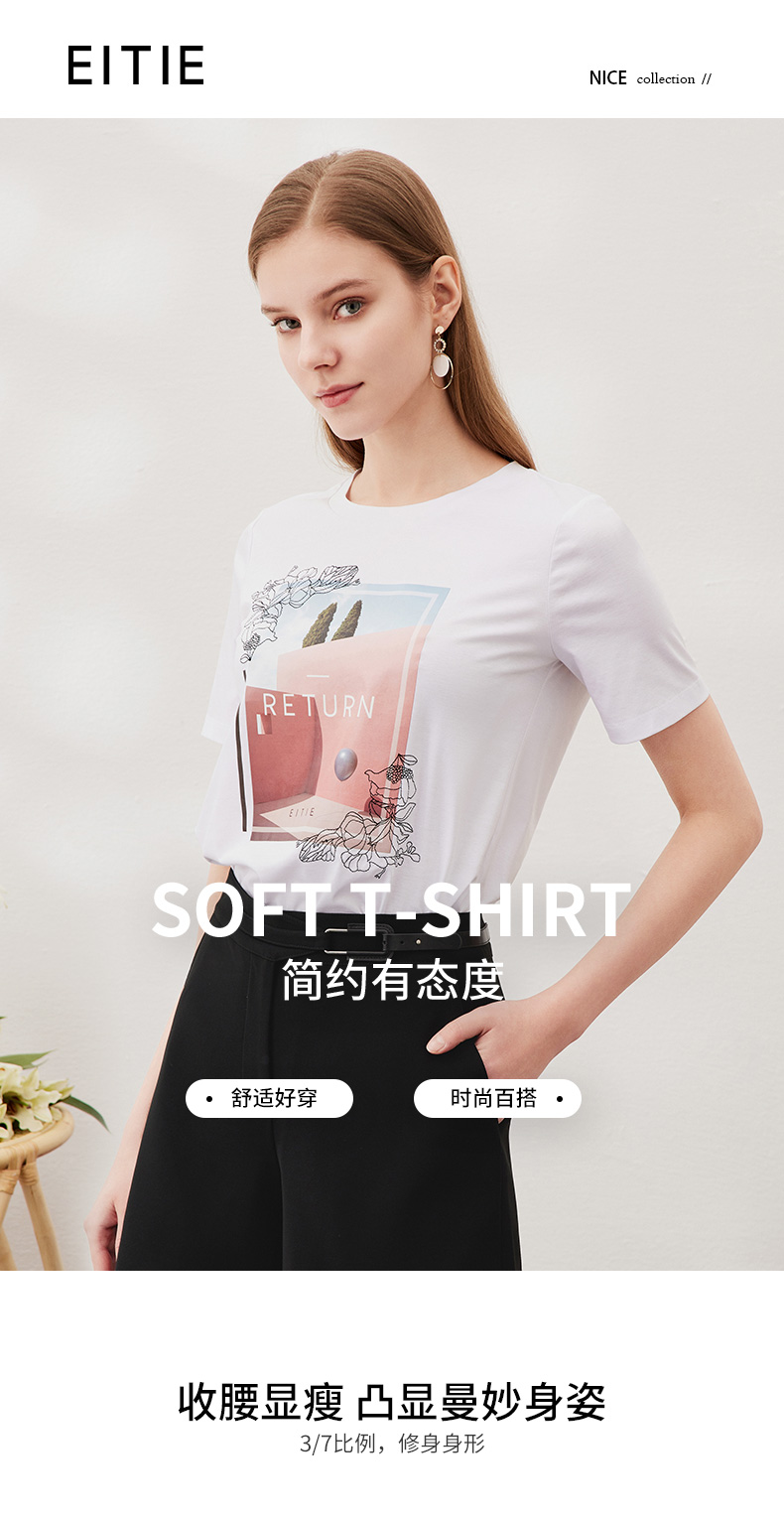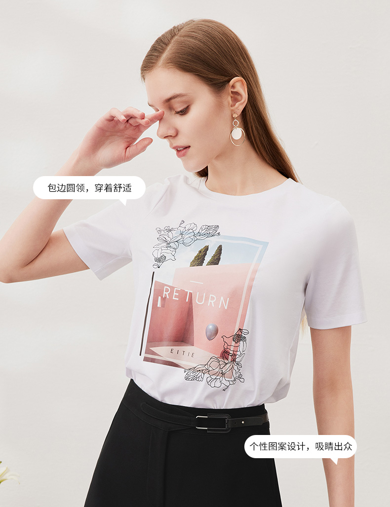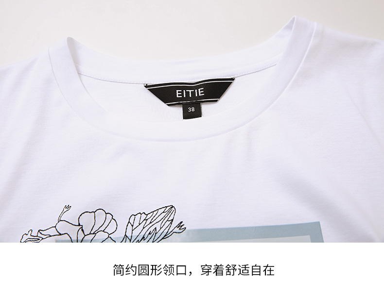 EITIE爱特爱夏季新款时尚百搭打底舒适弹力圆领印花T恤女6502202