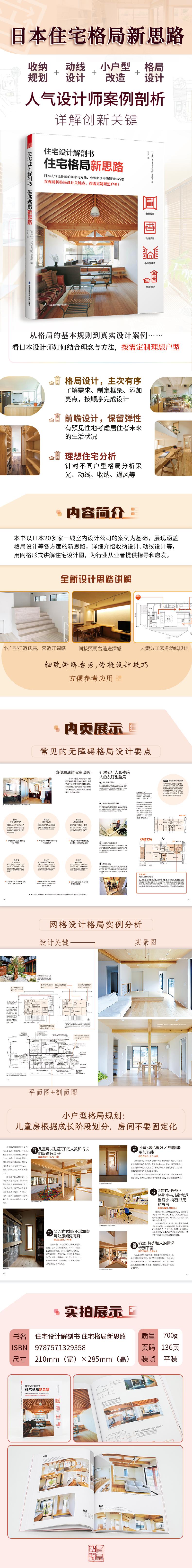 《住宅设计解剖书 住宅格局新思路》是日本X-Knowledge出版社出版的住宅设计手册。该书有多个系列,本书为格局设计篇,本书以日本20多家一线室内设计公司的案例为基础,提供涵盖格局设计各方面的新思路,将户主的生活融入设计,搭配细致的案例分析,构筑起好家格局设计的新思路。采用网格形式讲解住宅设计图,并分五章详细介绍了日式设计中收纳设计、动线设计等设计手法等。全书图文并茂,不仅有平面设计图更有实景照片,让读者一目了然领略全书魅力。