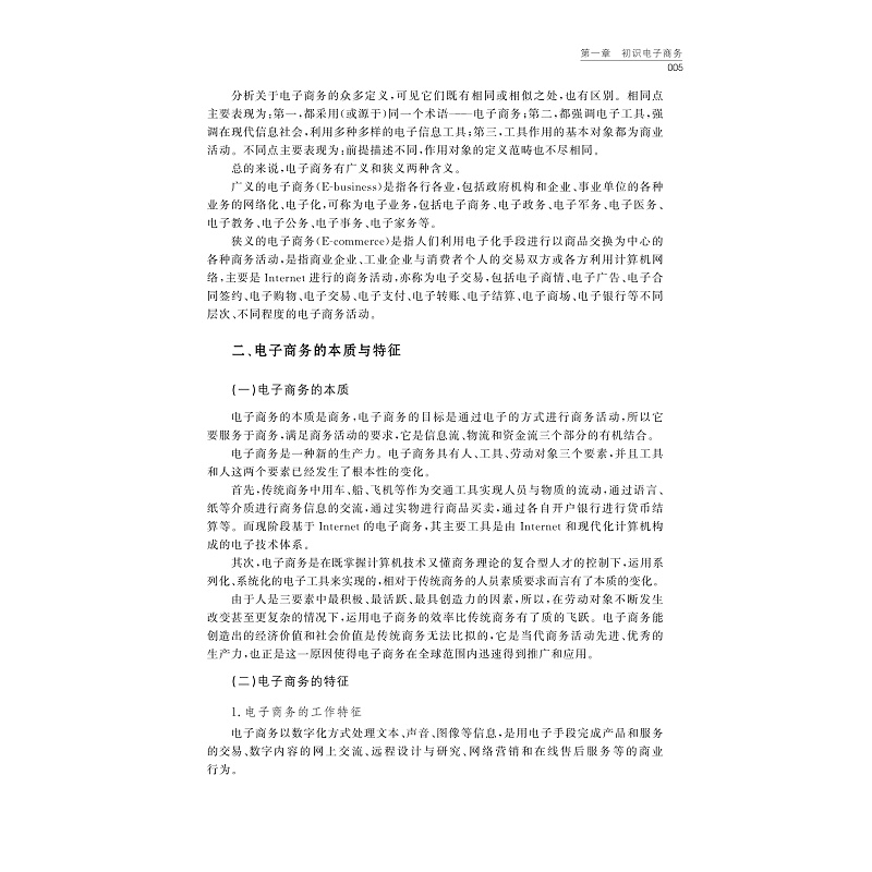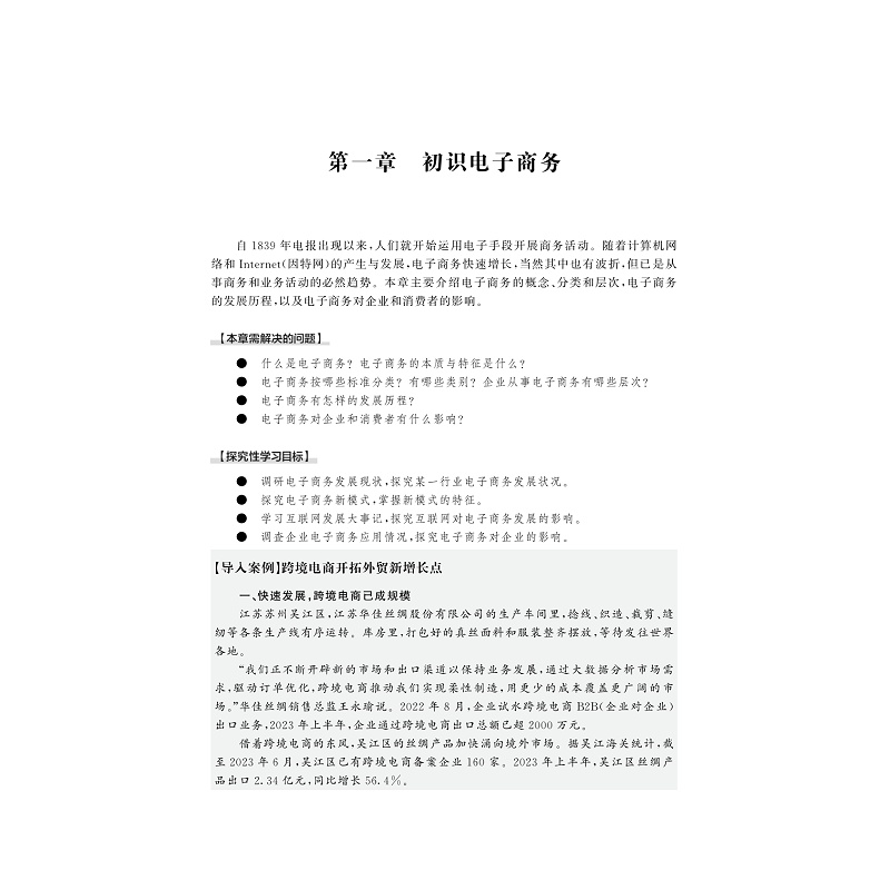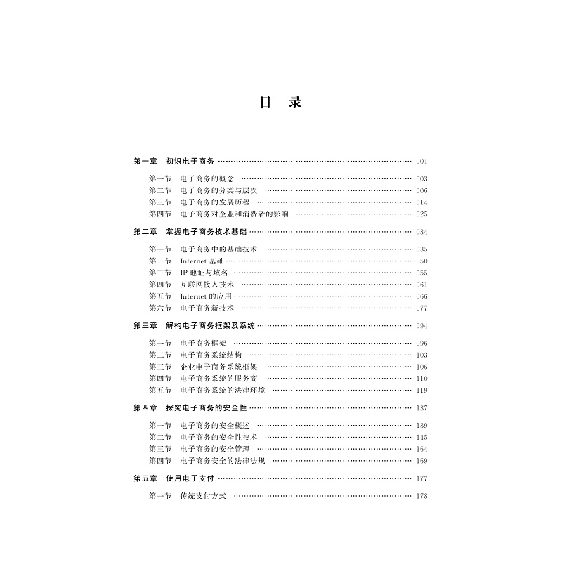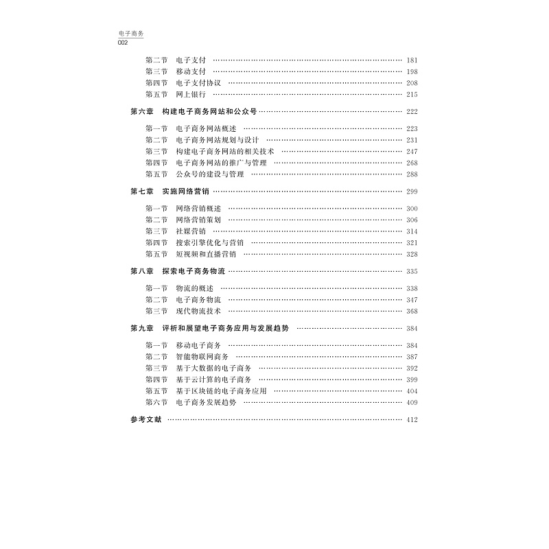本书内容包括电子商务的信息流、资金流、物流、安全性,以及完成电子商务交易的信息技术基础、商务服务与法律支持等,具体章节包括:第一章,初识电子商务;第二章,掌握电子商务技术基础;第三章,解构电子商务框架及系统;第四章,探究电子商务安全性;第五章,使用电子支付;第六章,构建电子商务网站和公众号;第七章,实施网络营销;第八章,探索电子商务物流;第九章,评析和展望电子商务应用与发展趋势。教材编排按建构性学习特征进行,按问题导向、探究性学习目标设定、情境与案例设计、社会性学习作业、内在驱动拓展学习和思政元素隐性植入的思路编排。