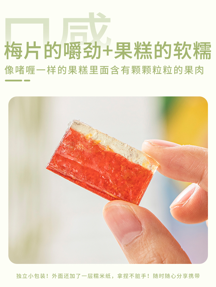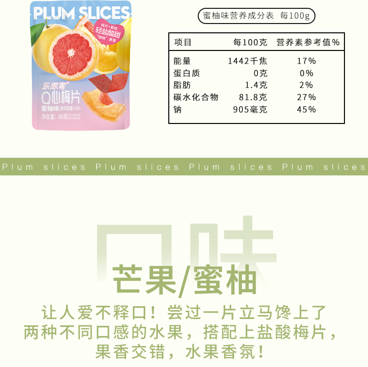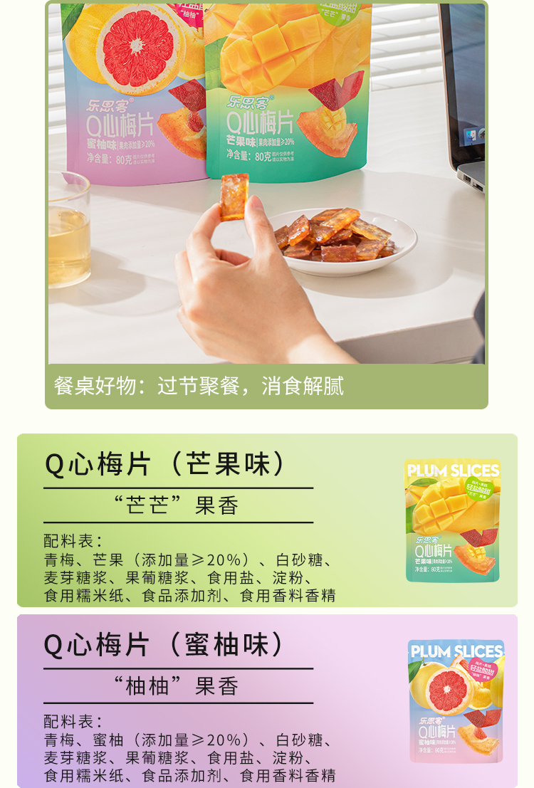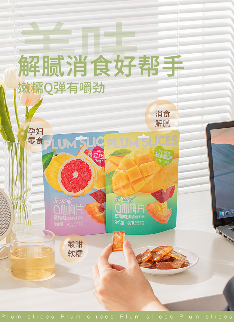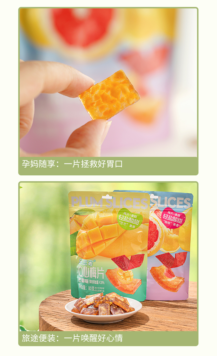 | 【品名】乐思客Q心梅片 【规格】80g/袋 【口味】芒果味、蜜柚味 【保质期】6个月 【储存条件】常温下密封保存 【产地】广东潮州 【发货地】广东潮州 【发货快递】极兔、申通、圆通、中通 【不发货地区】新疆、西藏、港澳台地区不发 【发货时效】48小时发货,节假日顺延 |