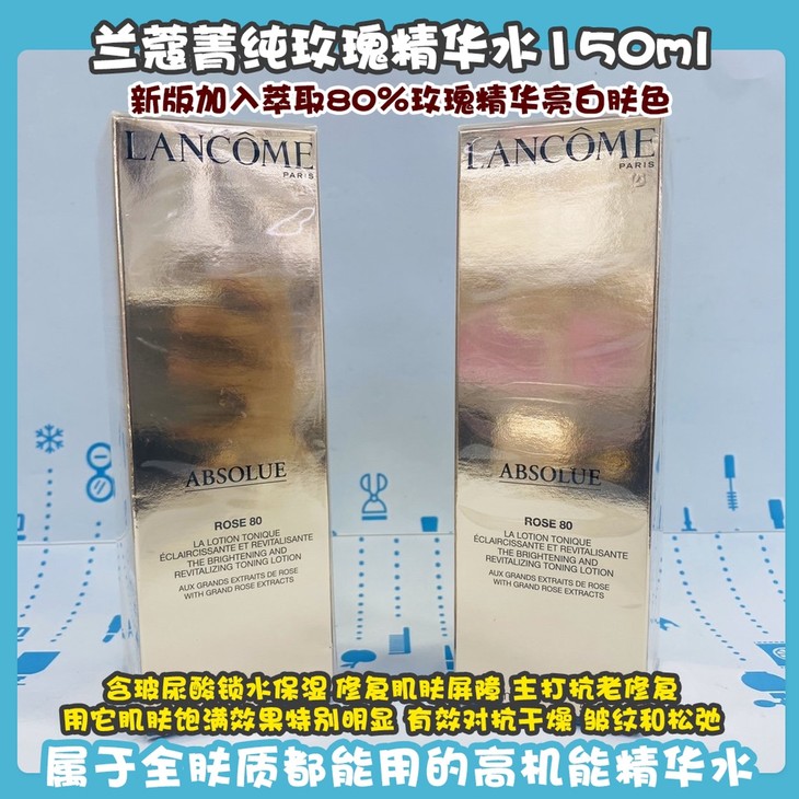 兰蔻菁纯玫瑰精华水150ml👍新版加入萃取80%玫瑰精华亮白肤色✨,含玻尿酸锁水保湿💦,修复肌肤屏障,主打抗老修复👊,用它肌肤饱满效果特别明显!有效对抗干燥,皱纹和松弛💆。质感清新水润,能瞬间渗透肌肤,溶解多余皮肤油脂,🌬疏通毛孔收敛炎症,同时解决干皮的缺水,敏感肌的泛红以及油痘肌油光痘痘问题✔,属于全肤质都能用的高机能精华水💧。