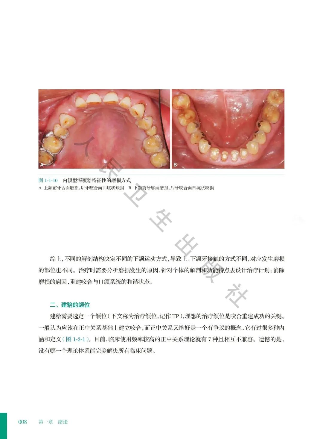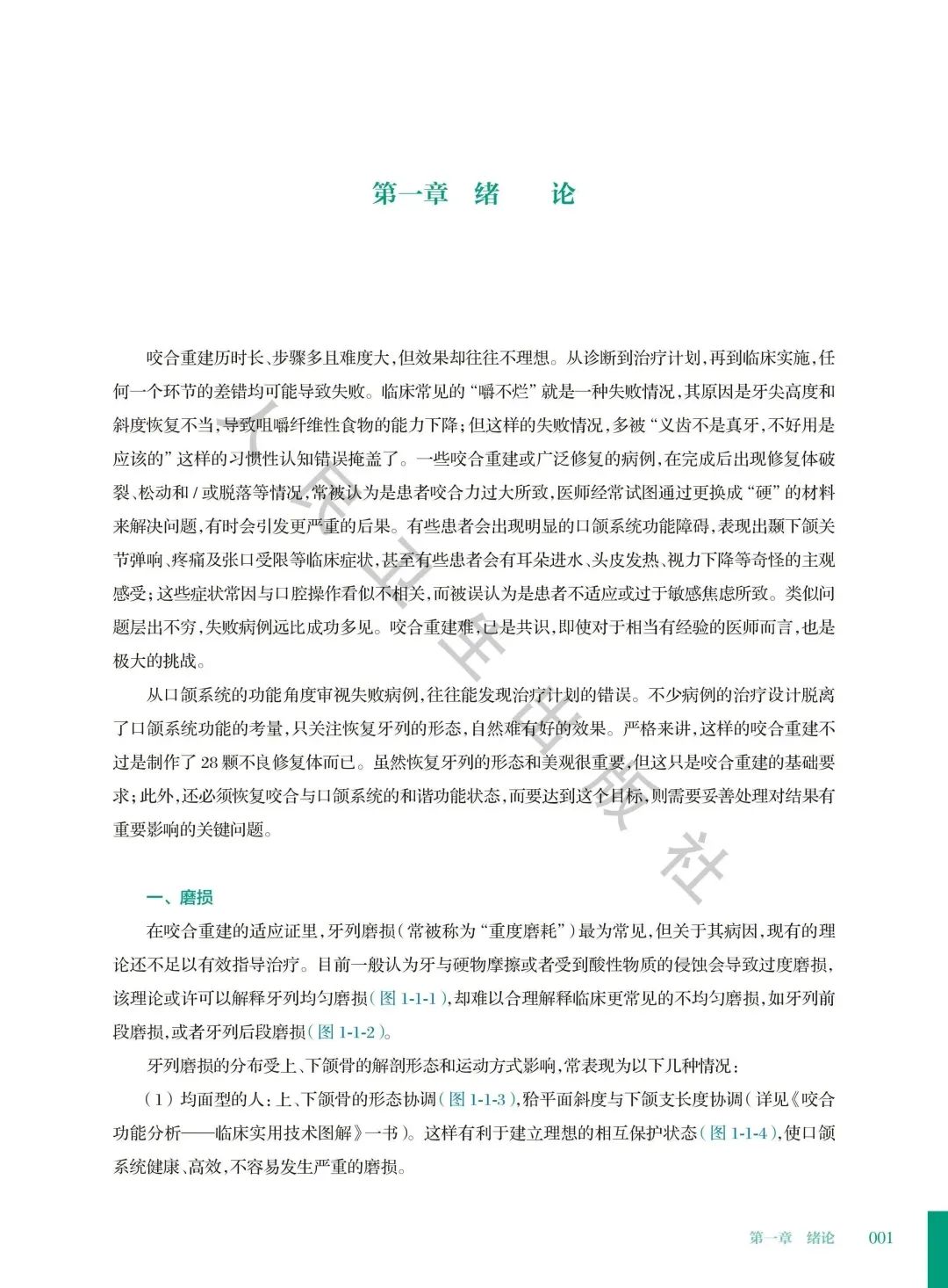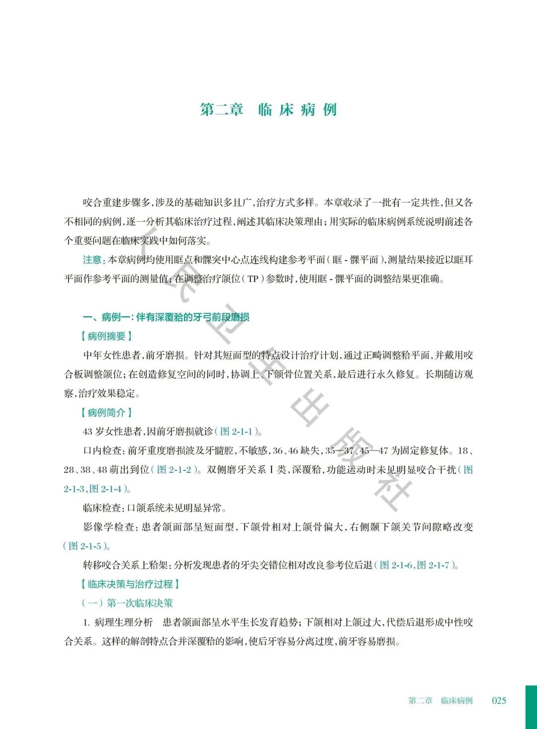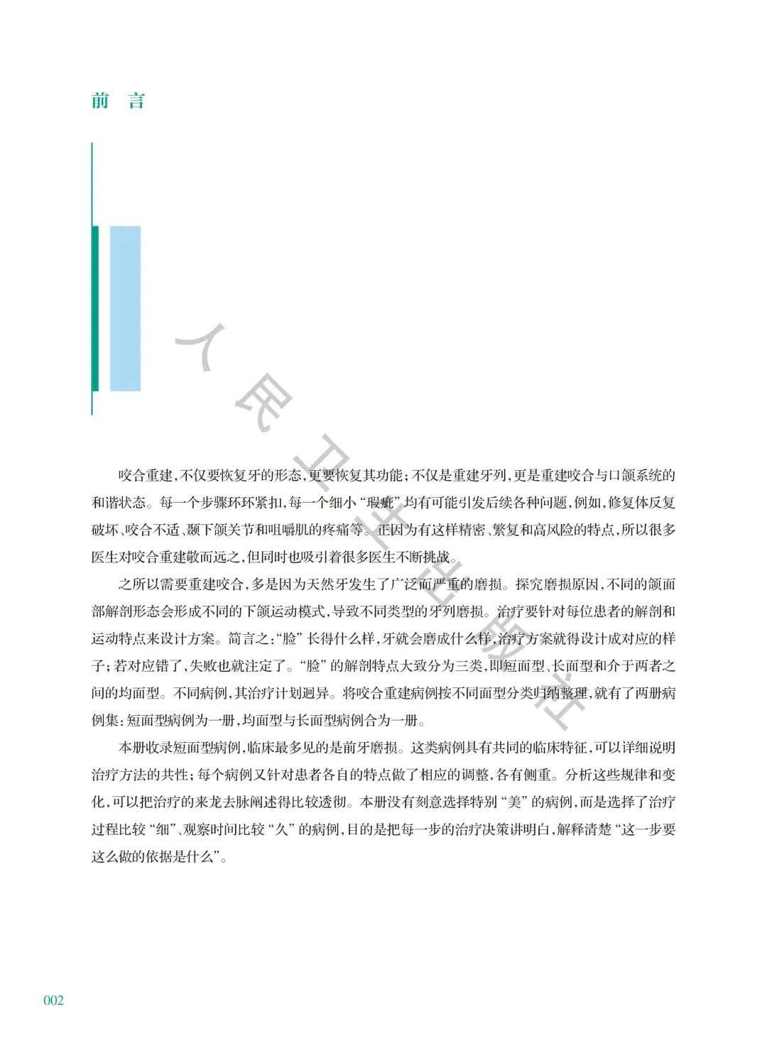 ③.书中以临床病例为载体,重点阐述临床病例的病因与病理生理分析,重点解读临床决策过程,弱化常规的基础临床操作等部分,以求为读者呈现 "从明确病因,到分析病理生理状态,再制订治疗计划,最后长期观察验证治疗计划的正确性"这样一个清晰的临床思维过程,纠正读者对于"咬合重建就是大面积修复"的认识误区,达到正本清源的目的。