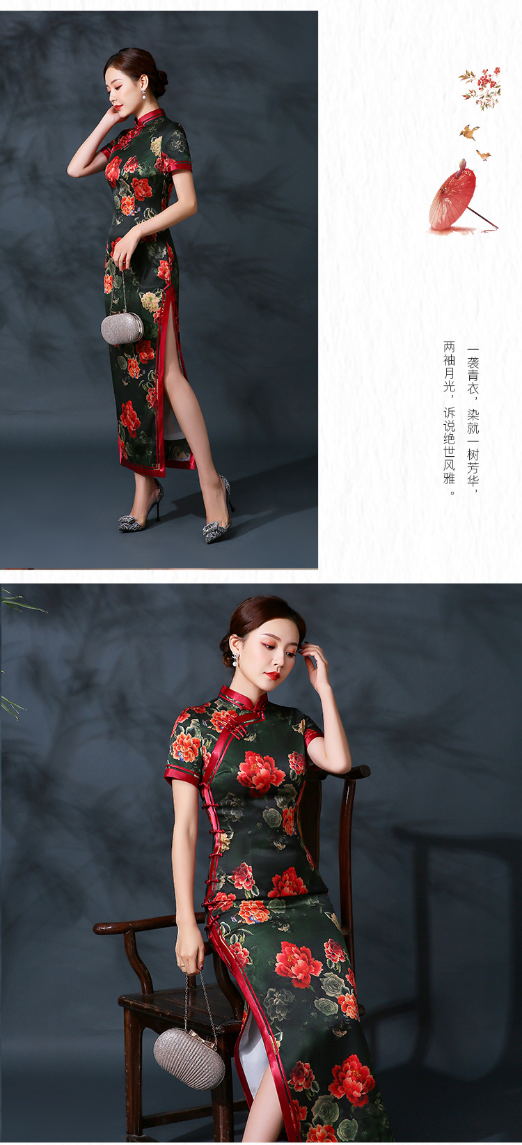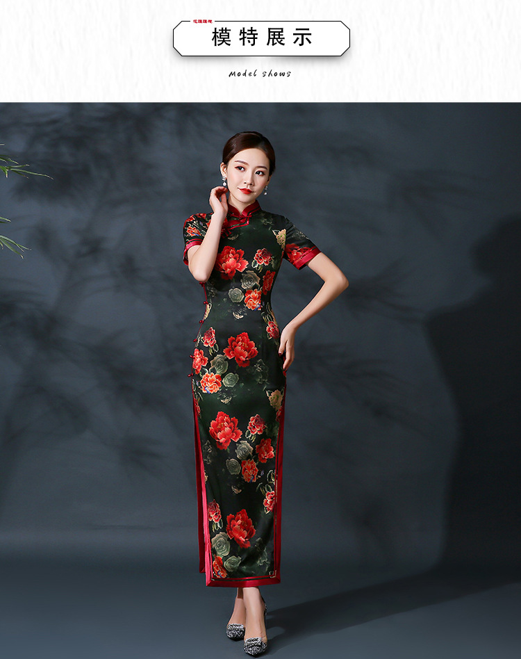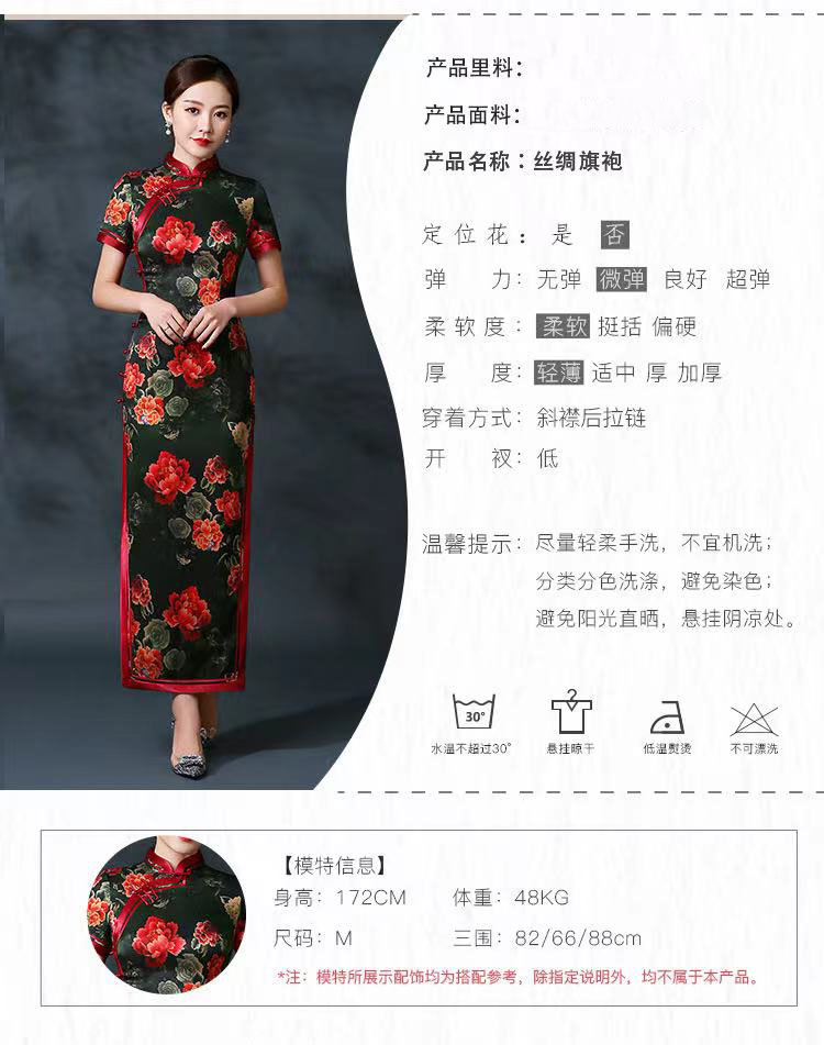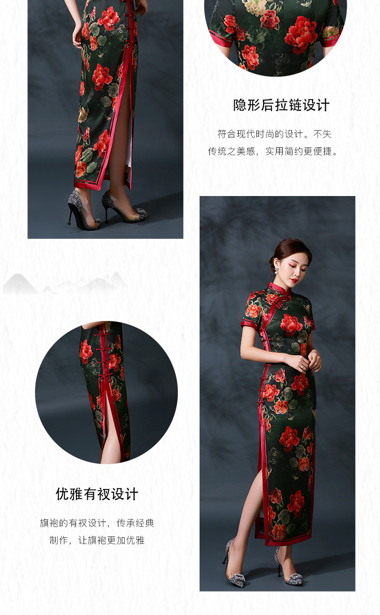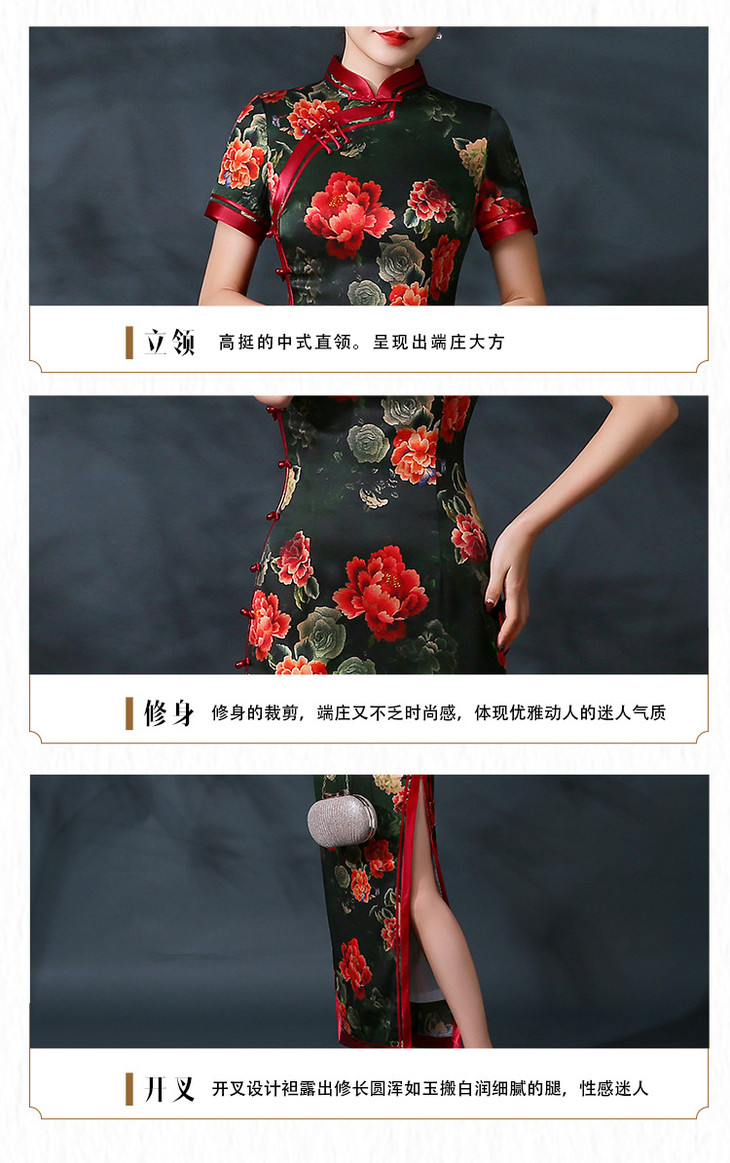 修身中国风,大红真丝长旗袍复古演出活动礼服QH-9858
