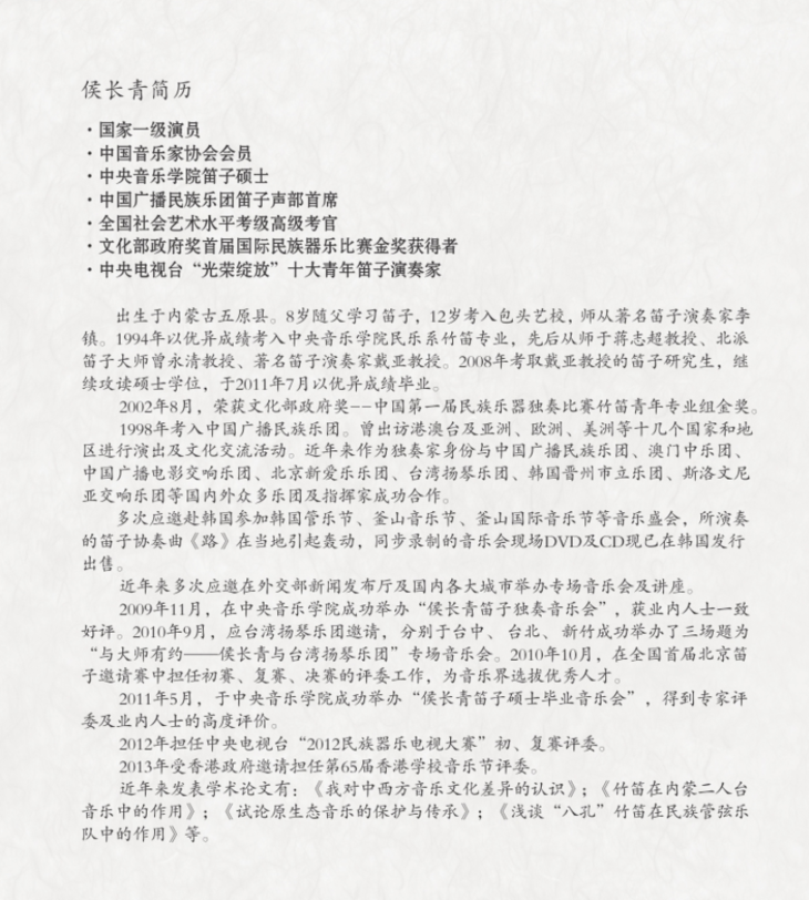 国家一级演员,中国音乐家协会会员,中央音乐学院笛子硕士,中国广播民族乐团笛子声部首席,全国社会艺术水平考级高级考官,文化部政府奖首届国际民族器乐比赛金奖获得者,中央电视台“光荣绽放”十大青年笛子演奏家。