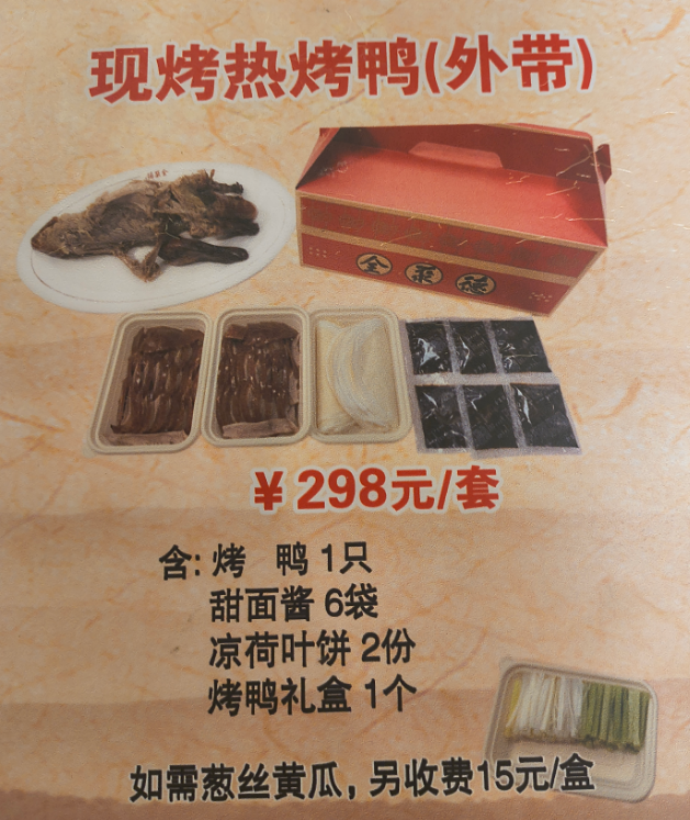 【奥运村店】现烤烤鸭(包含:烤鸭1只、甜面酱6袋、凉荷叶饼2份、烤鸭礼盒1个,如需葱丝黄瓜15元/盒)仅限到店自提