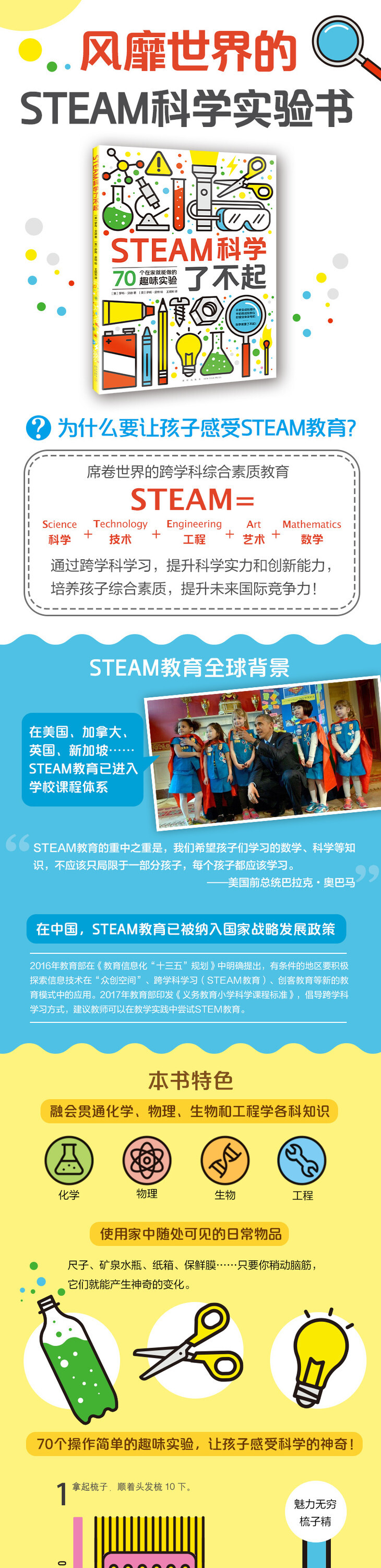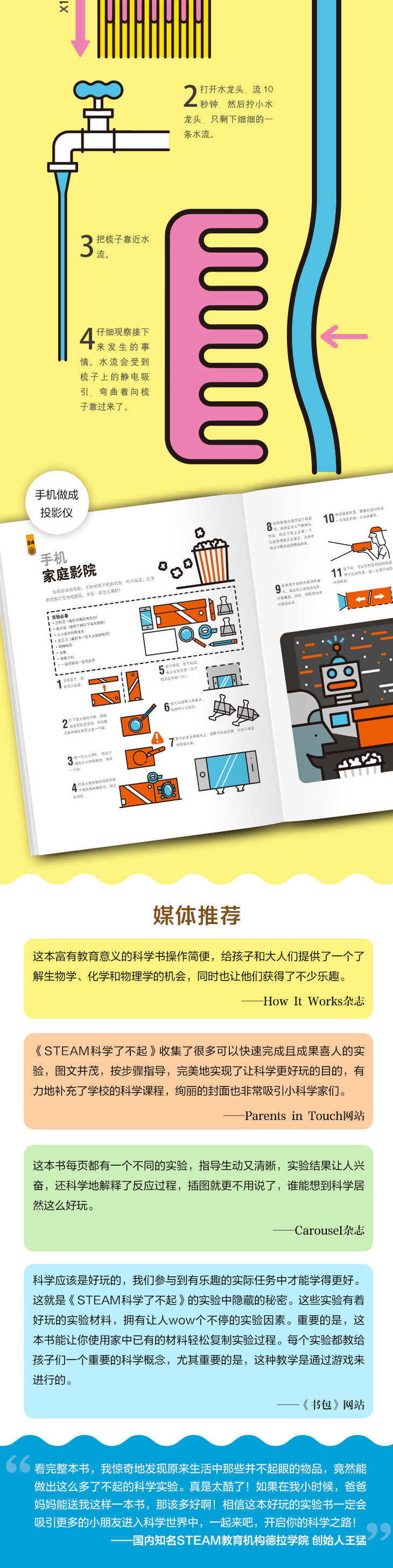风靡世界的STEAM科学书来啦,手机做成投影仪、棒棒糖棍搭大桥、柠檬变身发电机……70个在家就能做的趣味实验,利用项目探索和动手实践,融会贯通化学、物理、生物和工程学各科知识。不需要复杂的材料包,只须开动脑筋,随处可见的日常用品就能大显身手,发生神奇的变化。
