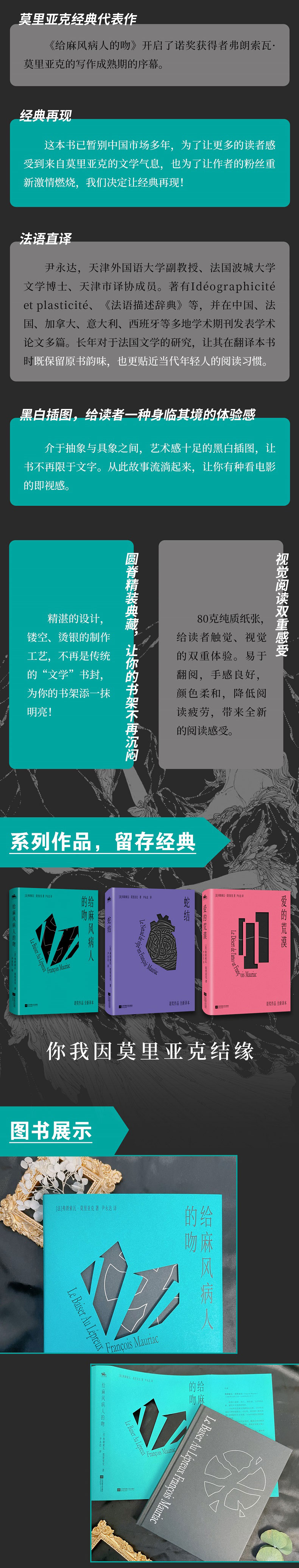 书中收录诺贝尔文学奖得主弗朗索瓦·莫里亚克的两部代表性作品《给麻风病人的吻》及《母亲大人》。