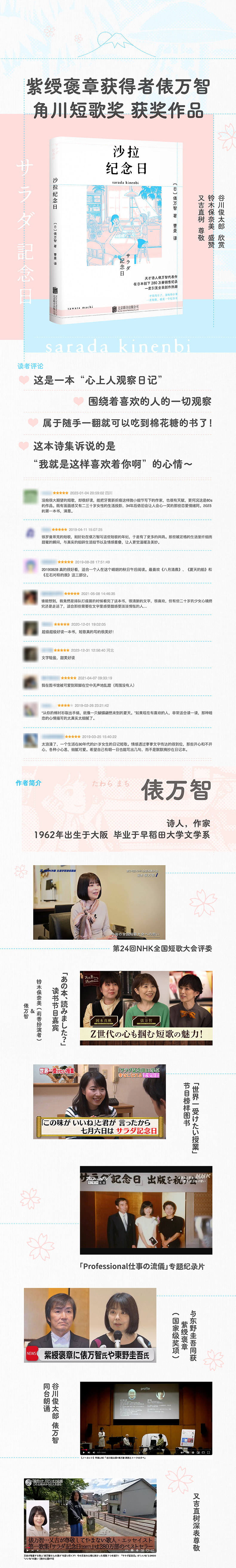 《沙拉纪念日》是天才诗人俵万智代表作,是平易的口语短歌集,也是一个年轻女性独自去东京工作、生活的内心独白。创下当年 280 万册销售的罕见纪录。