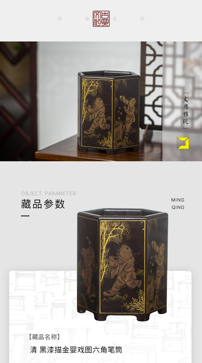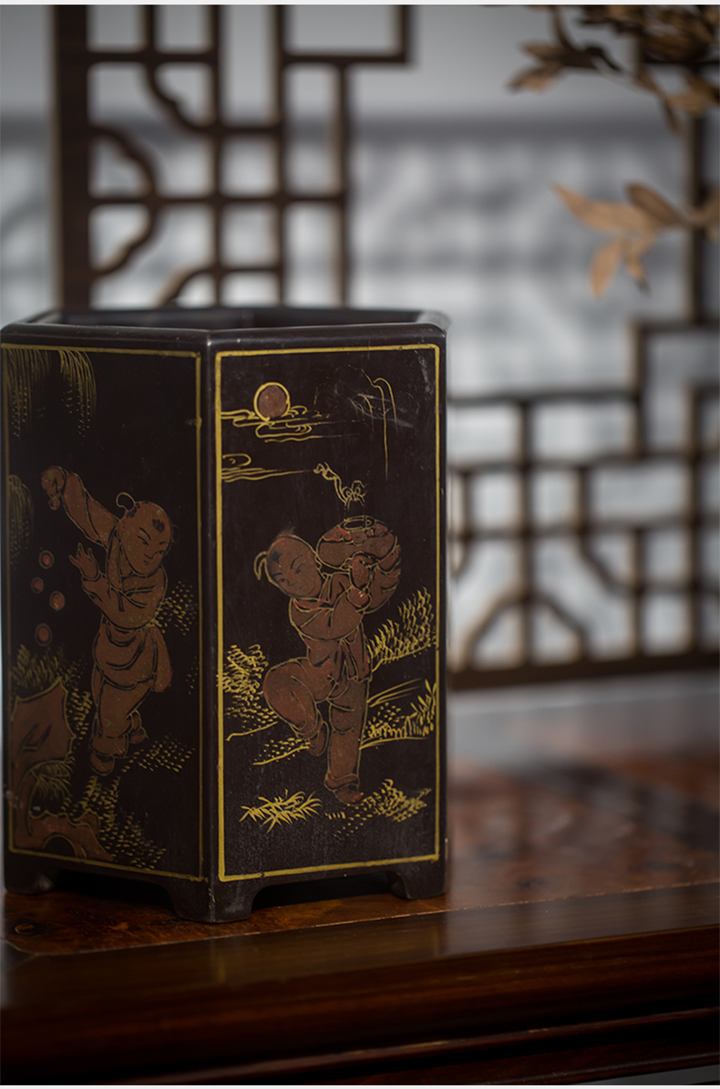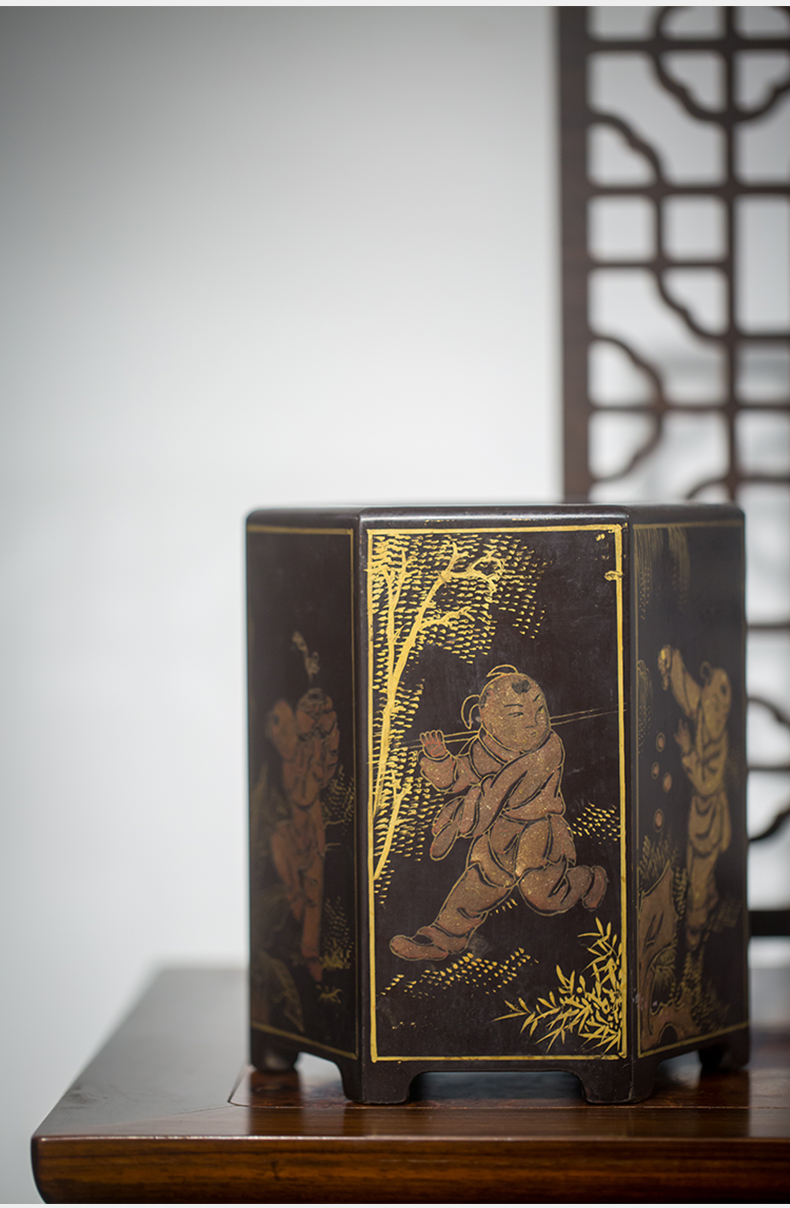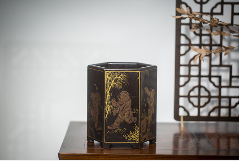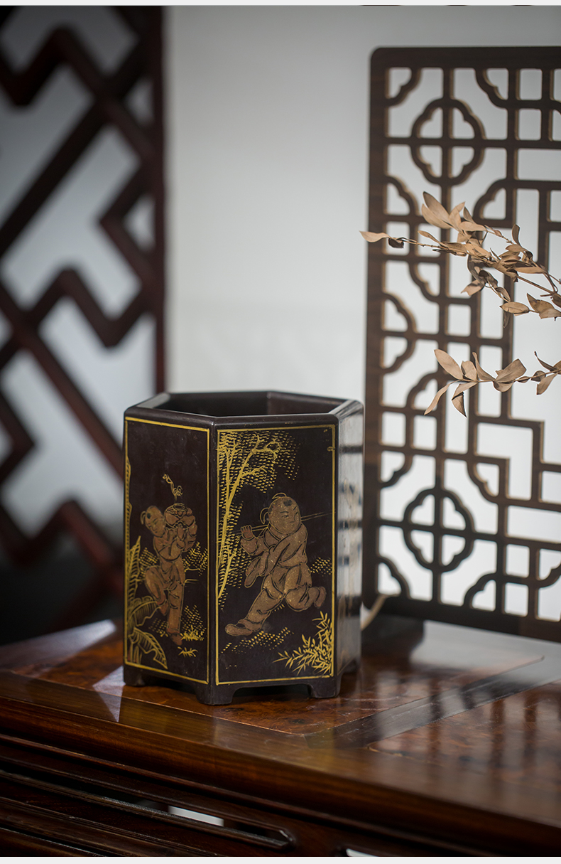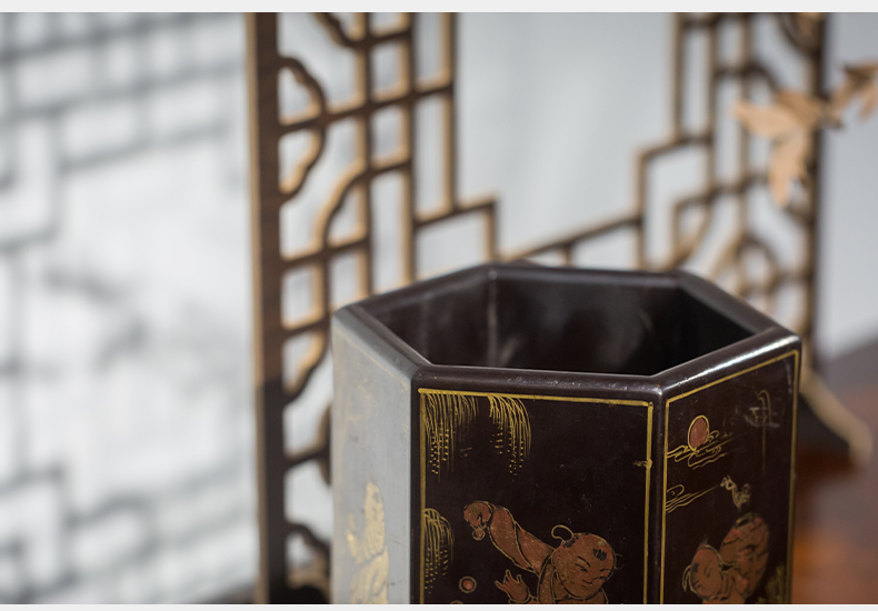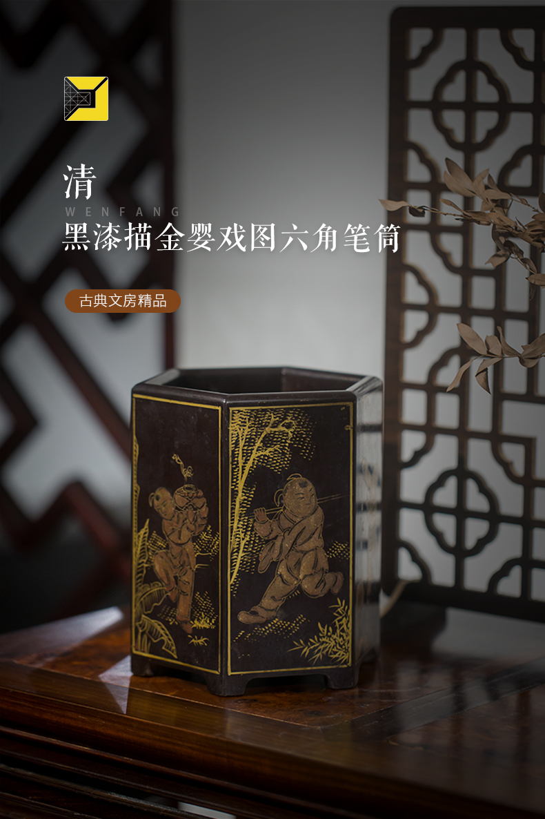 清代 黑漆描金婴戏图六角笔筒