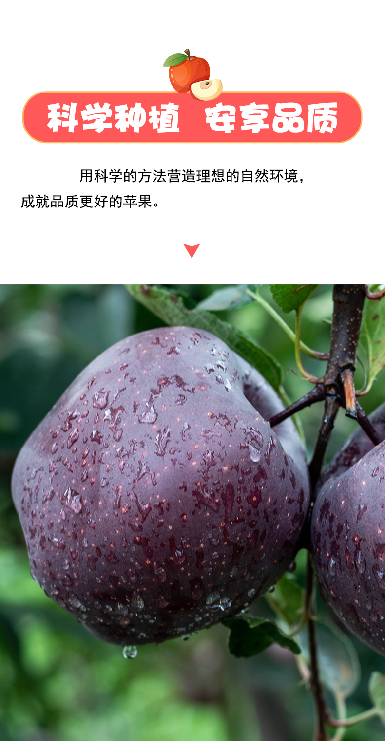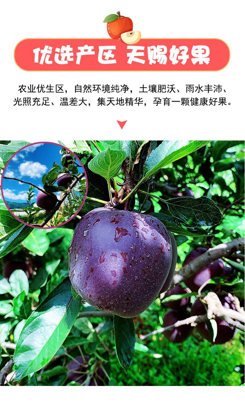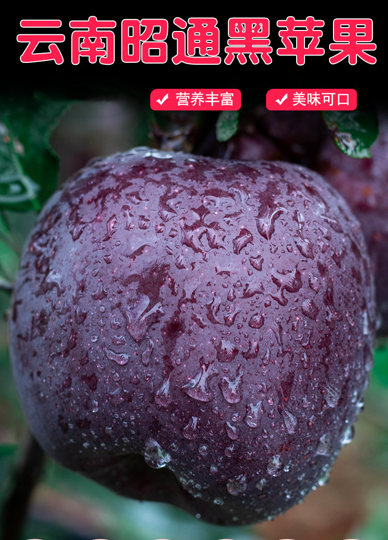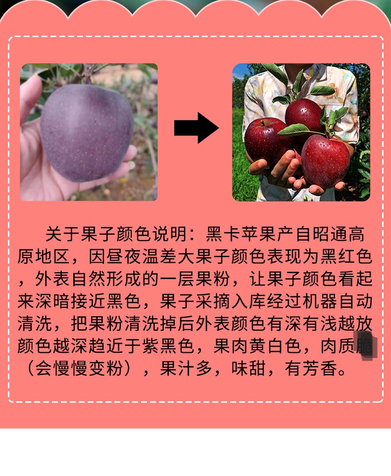 关于果子颜色说明:黑卡苹果产自昭通高原地区,因昼夜温差大果子颜色表现为黑红色,外表自然形成的一层果粉,让果子颜色看起来深暗接近黑色,把果粉擦掉后外表颜色有深有浅越放颜色越深趋近于紫黑色,果肉黄白色,肉质脆(会慢慢变粉),果汁多,味甜,有芳香。果子均自然生长,其表面颜色与日照、生长环境有关,可能会有个别出现颜色偏浅.偏粉的情况,属于正常现象,不影响食用口感