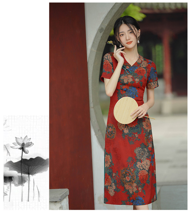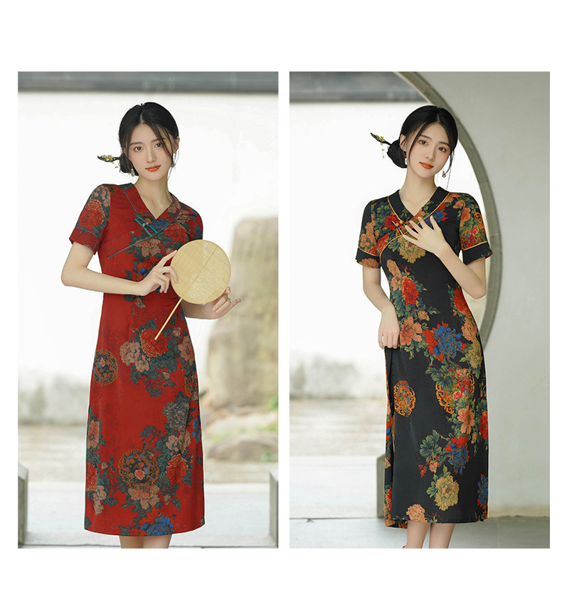 GSJ 558气质减龄旗袍V领连衣裙宽松大码中长款裙