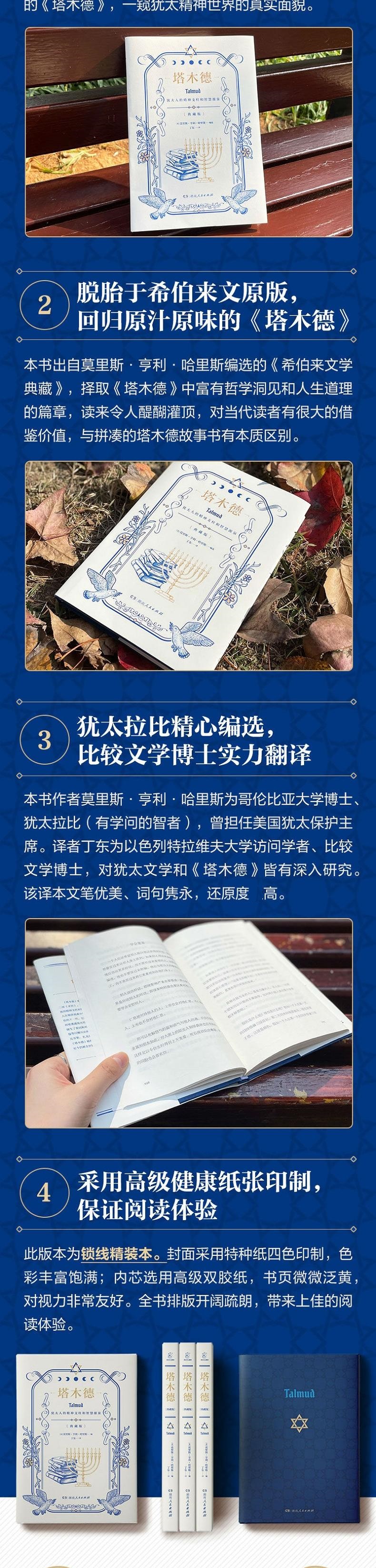 本书由哥伦比亚大学博士、犹太拉比、美国犹太保护协会主席莫里斯·亨利·哈里斯选编,比较文学博士、以色列特拉维夫大学访问学者丁东翻译,大程度呈现了原汁原味的《塔木德》经典要义。