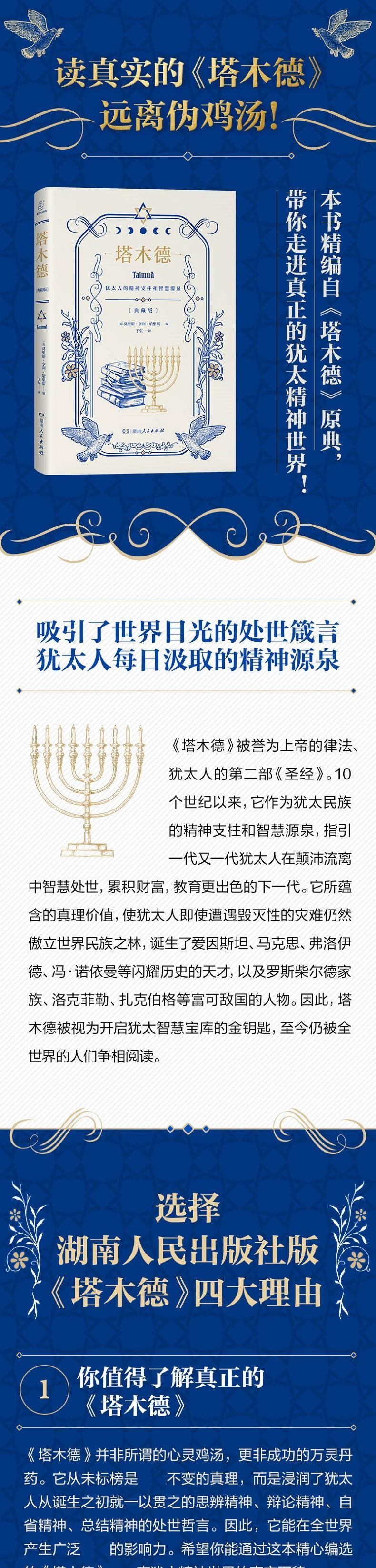 《塔木德》被誉为上帝的律法,犹太民族的第二部《shengjing》,全世界为之惊叹的智慧启示录,犹太人文化、生活的核心,思想和愿望的基础,也是犹太人生存智慧的完整归纳。