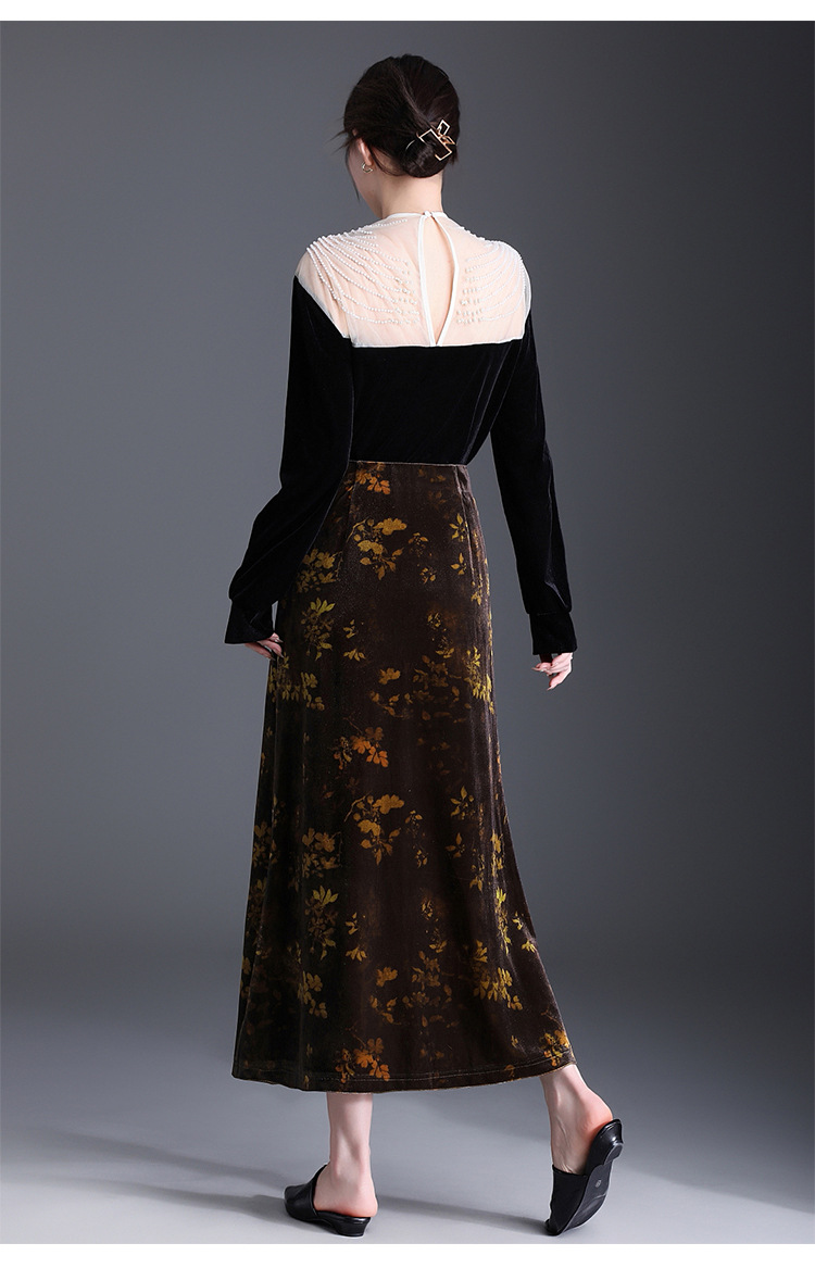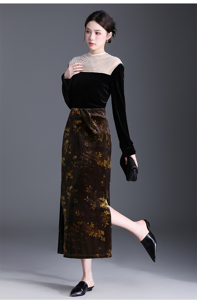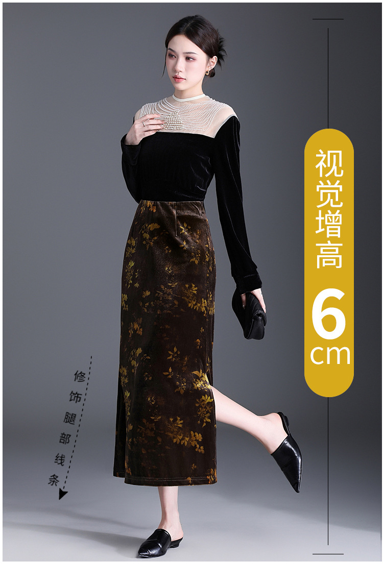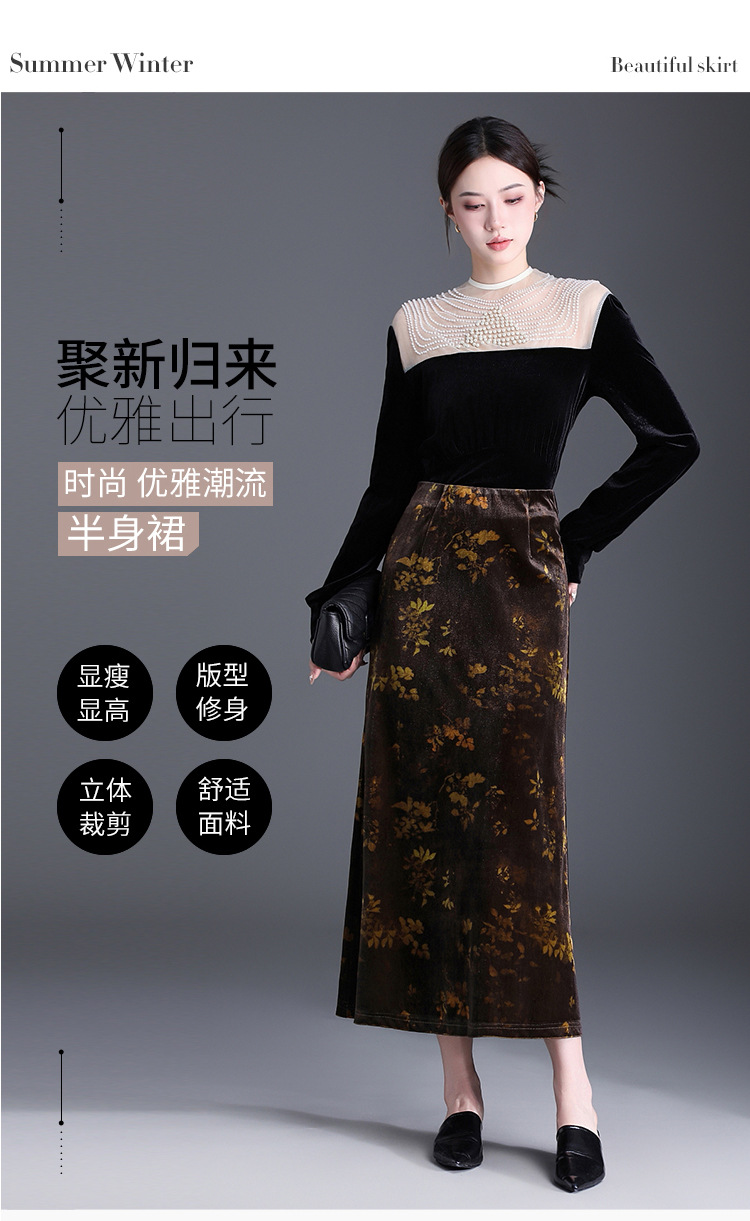 QYM  760-Y金丝绒半身裙印花包臀裙气质复古开衩一步裙 商品图0