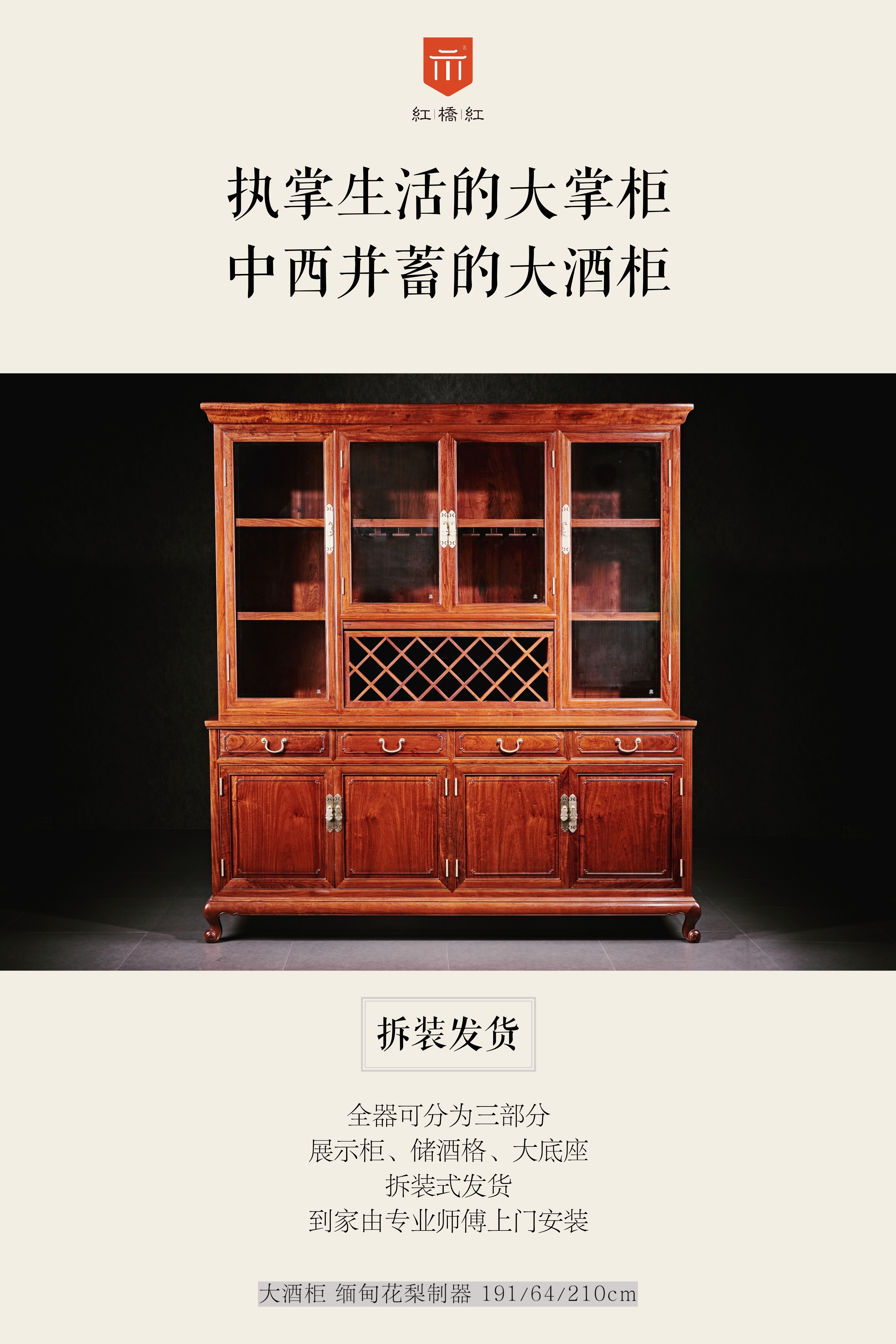 全器可分为三部分:展示柜、储酒柜、大底座,拆装式发货,到家由专业师傅上门安装。