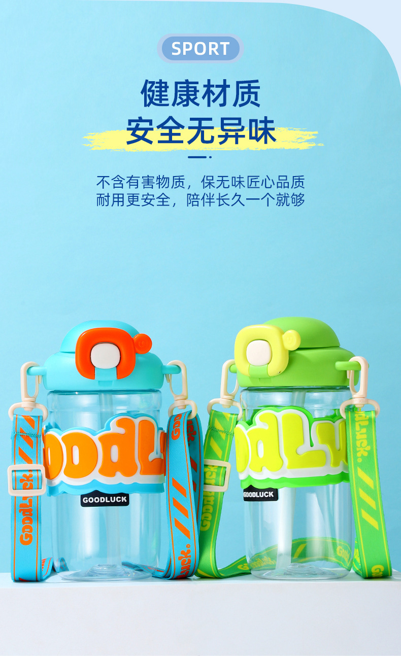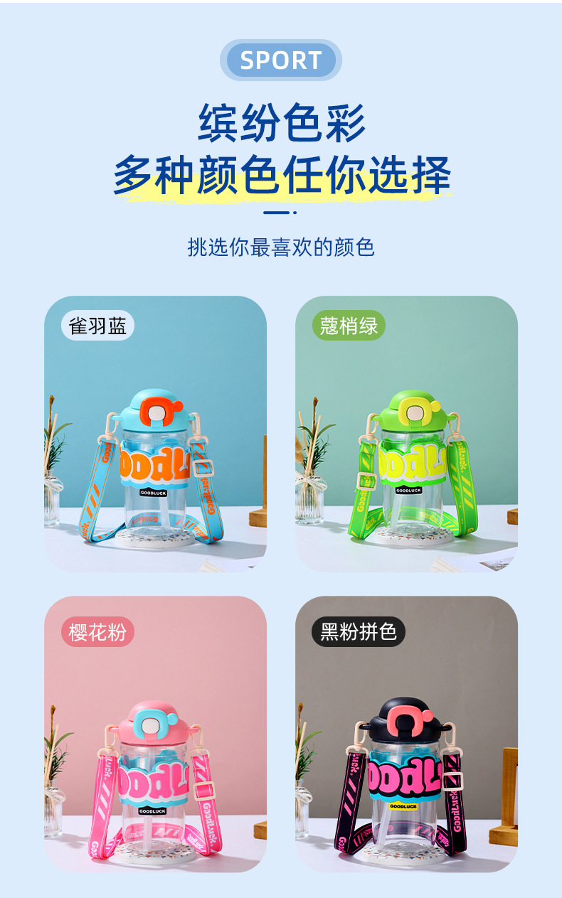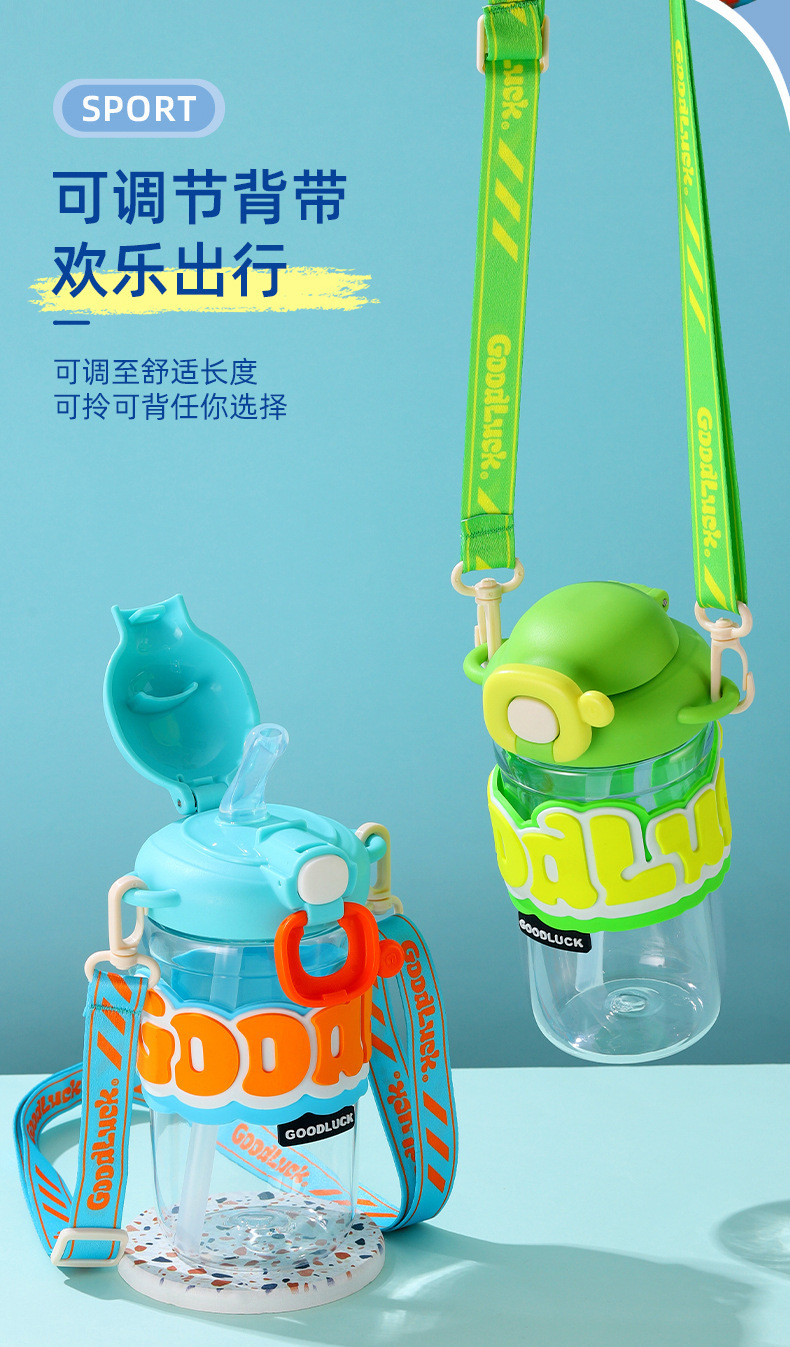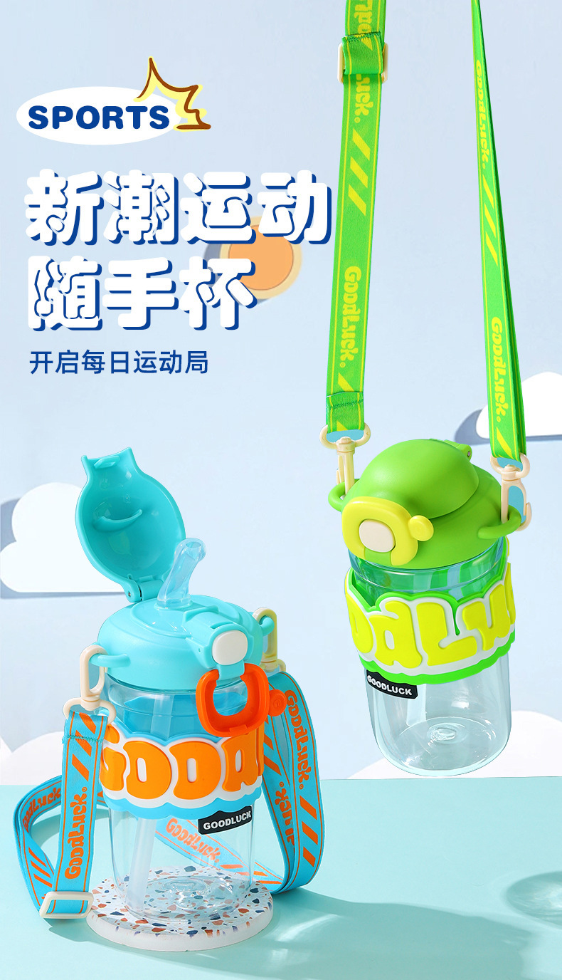 【新潮运动,随手杯 !】新款随手杯夏季大容量塑料水杯,便携高颜值背带儿童带吸管水杯,一键弹盖 方便快捷食用级硅胶吸管 饮用放心-QQ