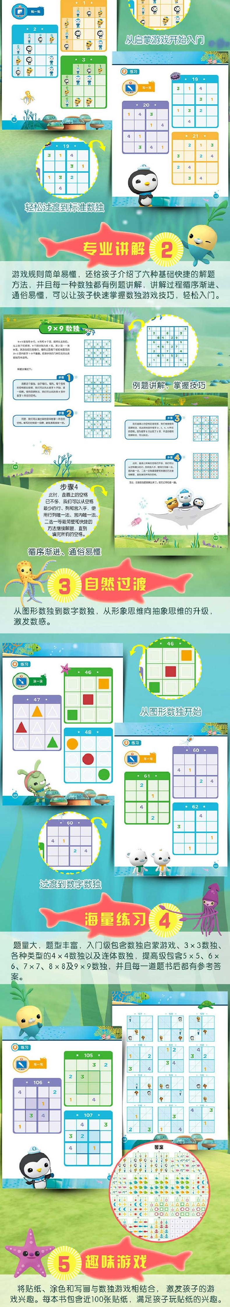 本书针对具备一定基本技巧的数独小读者,能够进一步提高他们的数独解题能力。本书共精选了100多个数独游戏汇编成册,按照难易程度分类,每一章均包含一项数独游戏的专项训练,还包含数独的答题规则和技巧,能很好的调动孩子的积极性。书中还有配有贴纸、游戏棋盘、棋子,书后配有答案,可以让孩子在海底小纵队的陪伴下尽情体味数独游戏带来的乐趣。