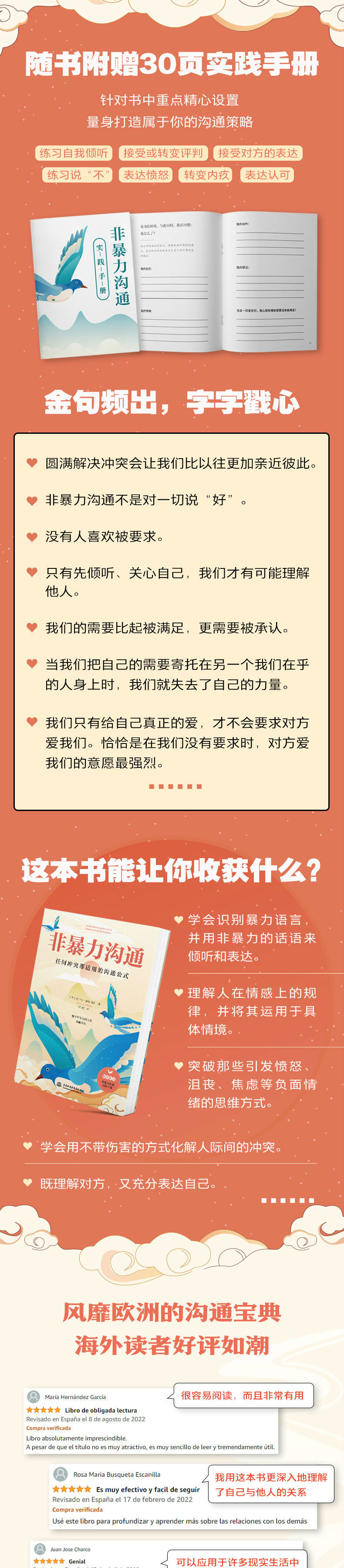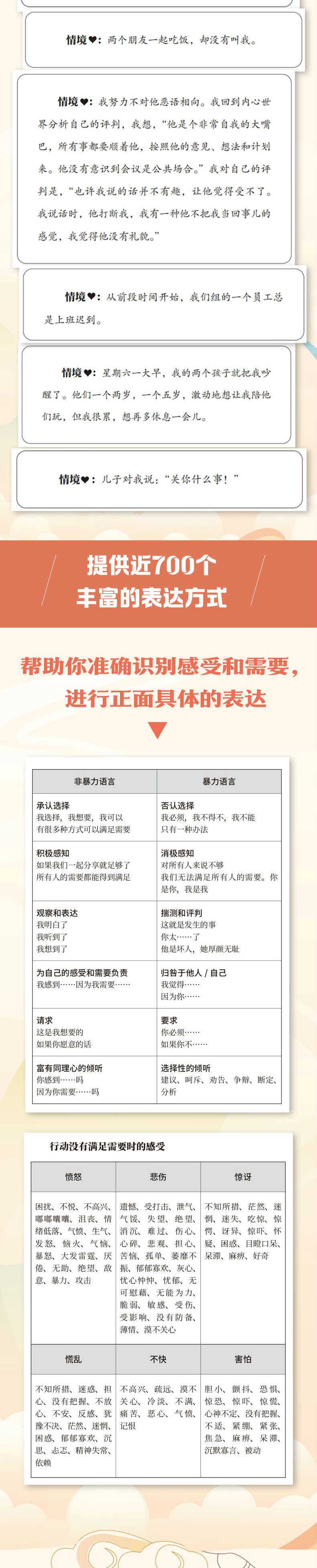 ●丰富实用的表达:提供了近700个在日常生活情境中可能出现的,与言行、情绪、需要相关的词汇和表达方式,帮助读者更好地识别事实、描述感受、表达需求,更好地践行非暴力沟通。
