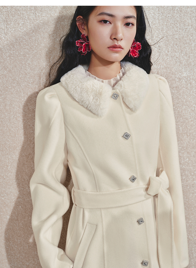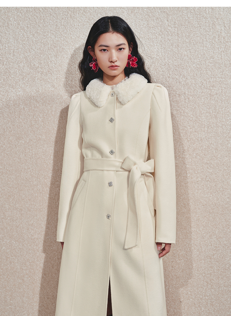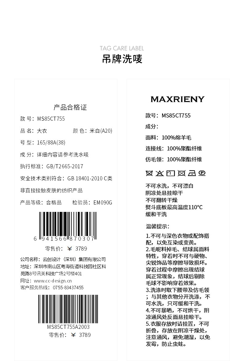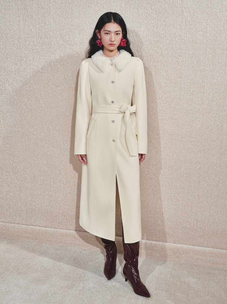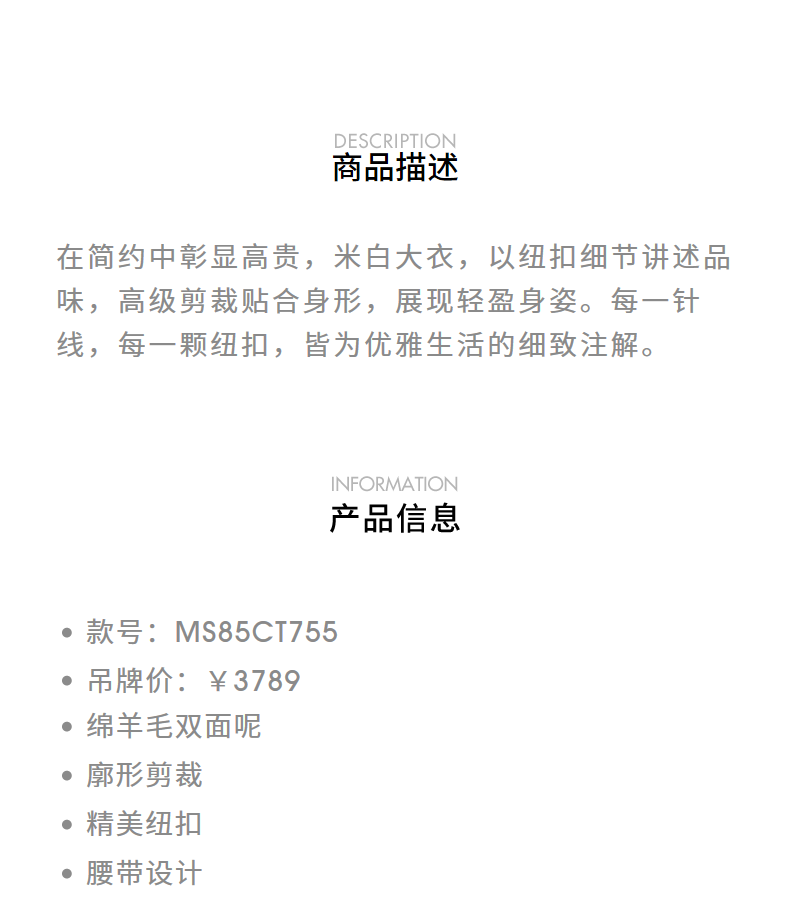 MAXRIENY高级极简米白色绵羊毛大衣中长款24冬新款廓形保暖外套女(货号:MS85CT755)
