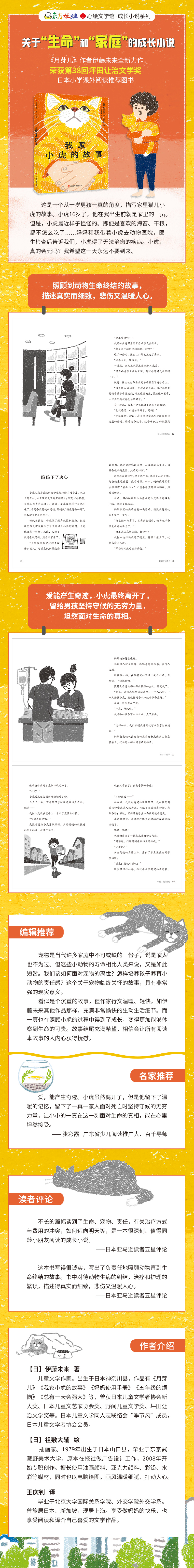 看似是个沉重的故事,但作家行文温暖、轻快,如伊藤未来其他作品那样,充满非常愉快的生动生活细节。而一真也在照顾小虎的过程中得到了成长,变得更加能够体察到生命的可贵。故事结尾充满希望,相信会让所有阅读本故事的人内心获得抚慰。