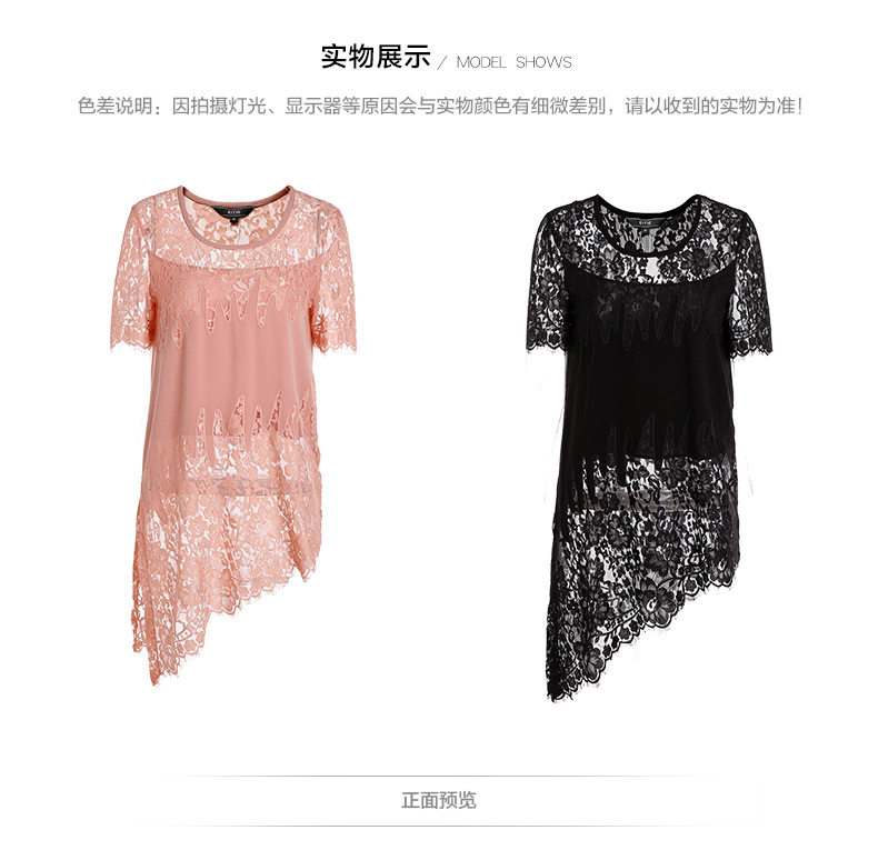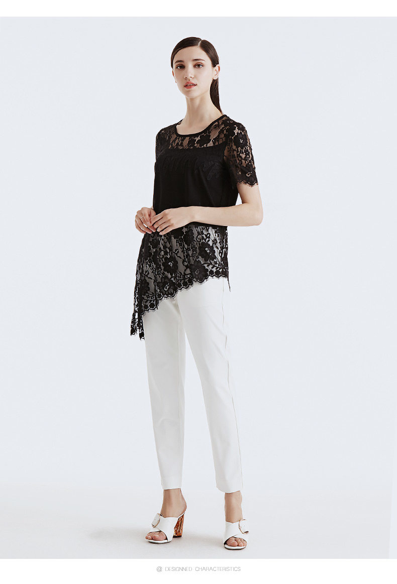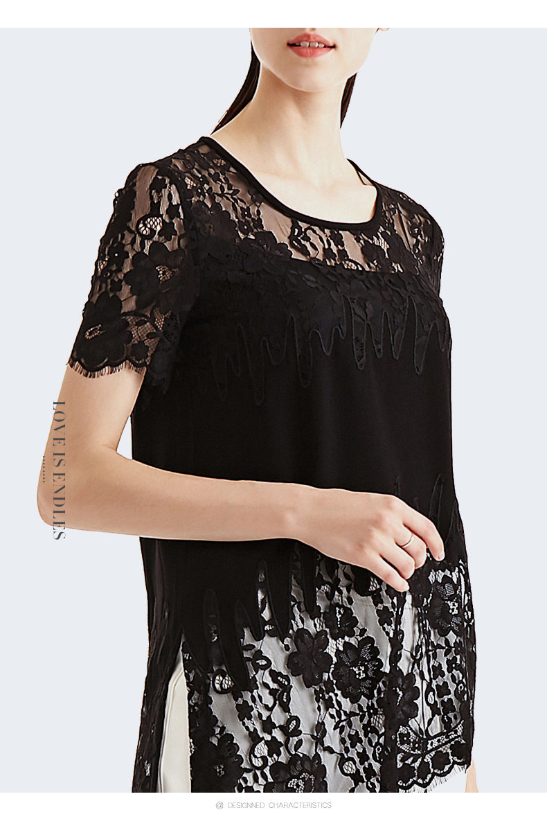 EITIE爱特爱女装夏季新品蕾丝网纱钩花拼接不规则中长T恤上衣5513219