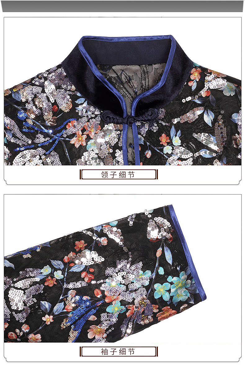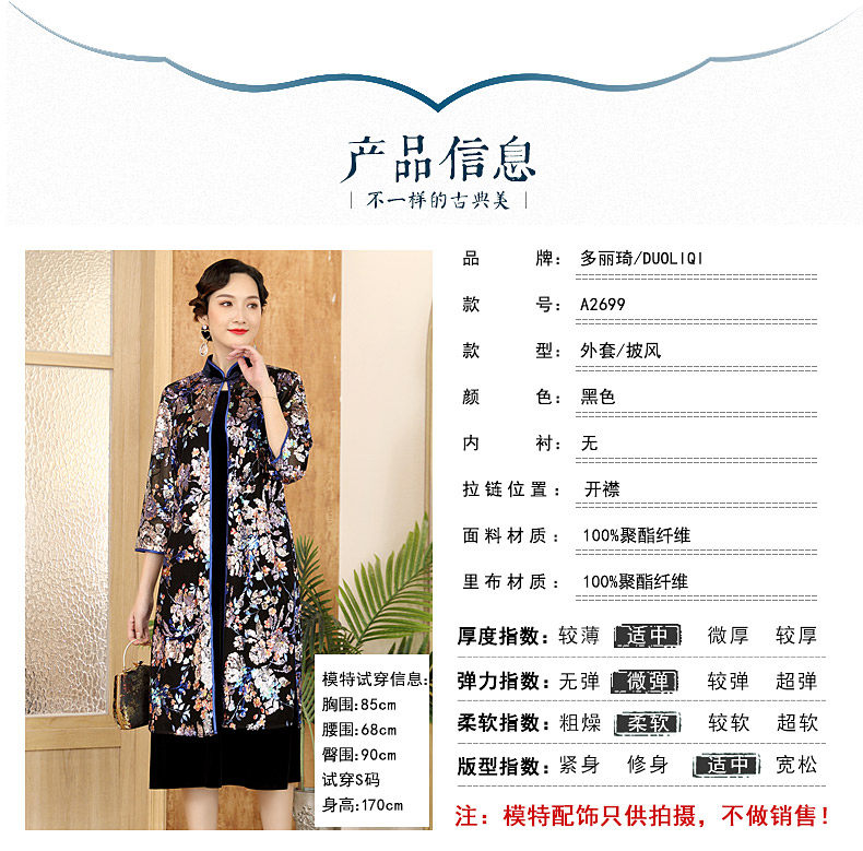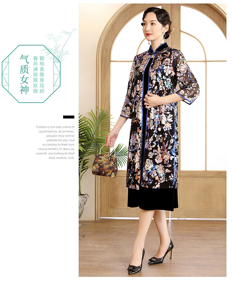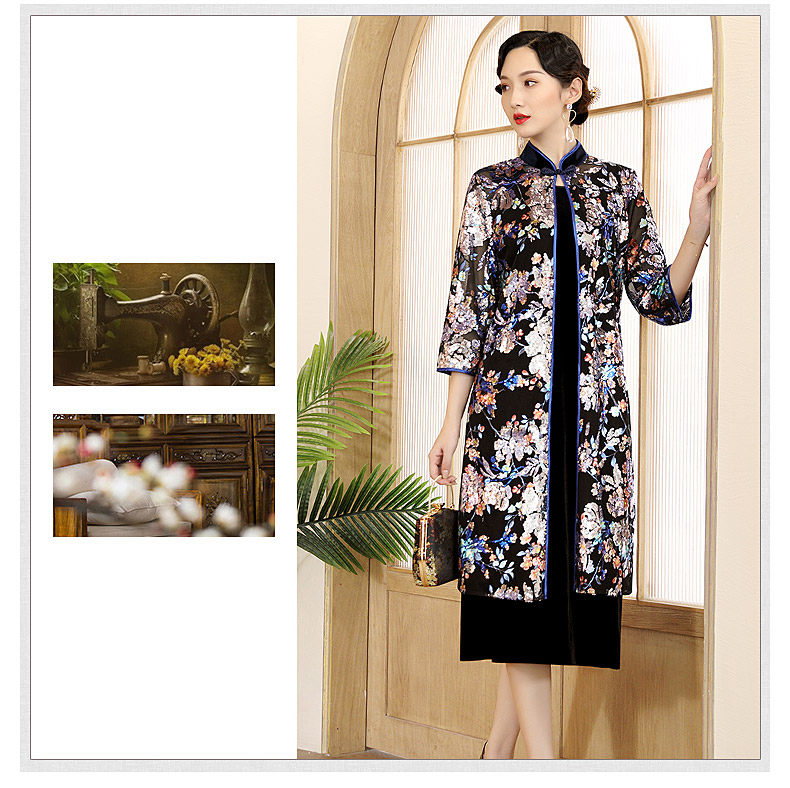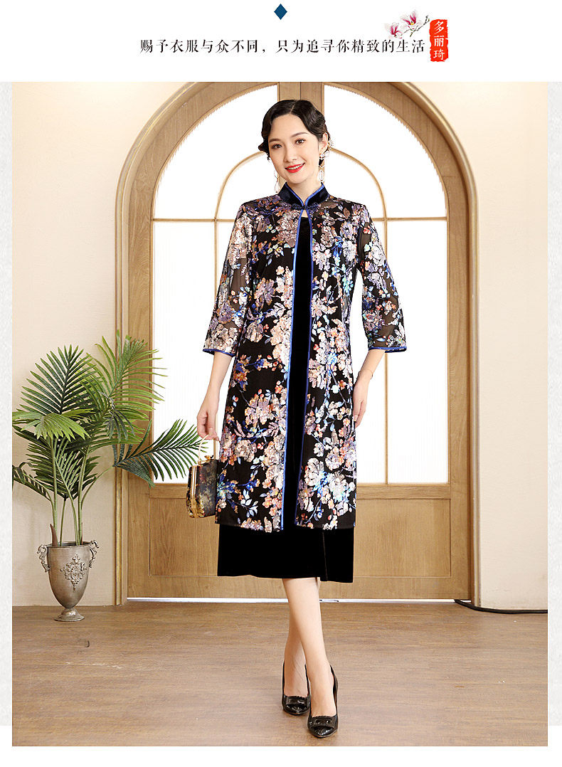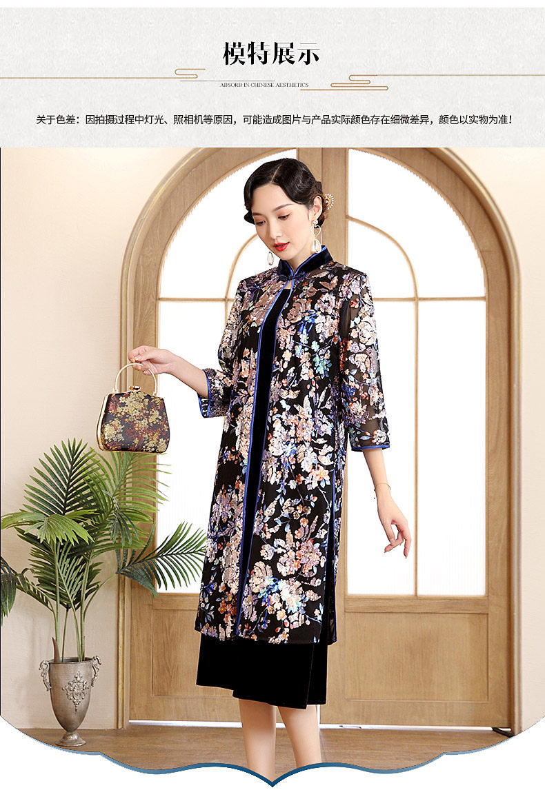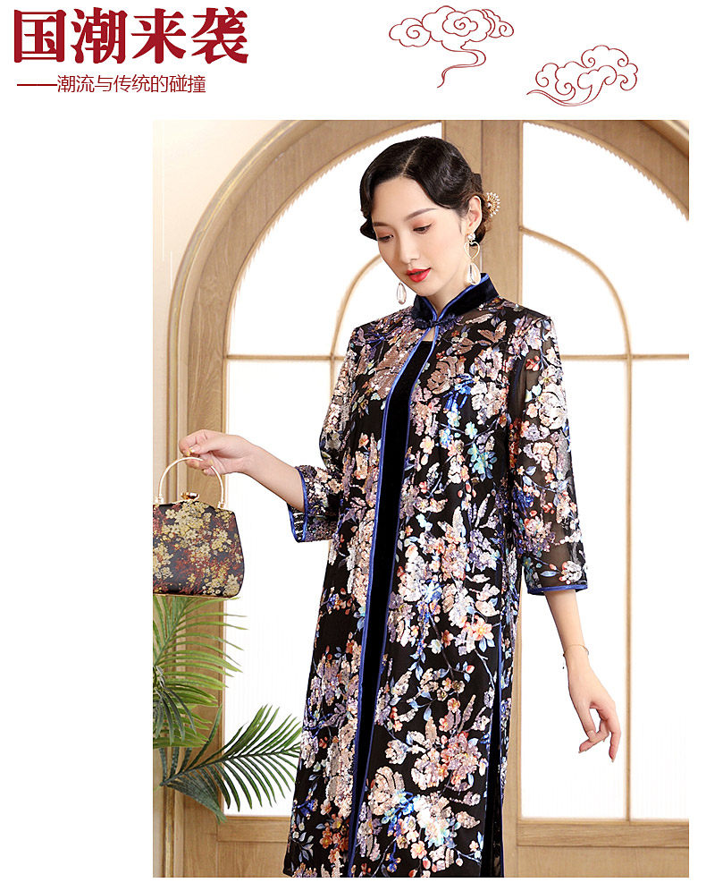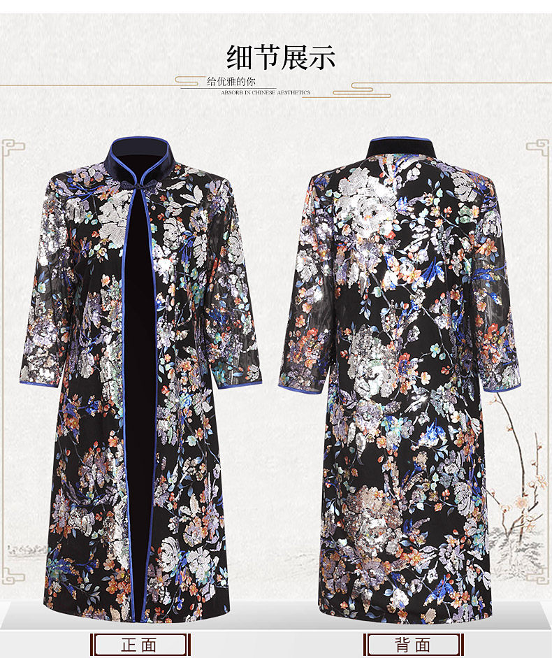 DLQ-A2699新款中国风优雅气质立领七分袖印花亮片长款风衣外套