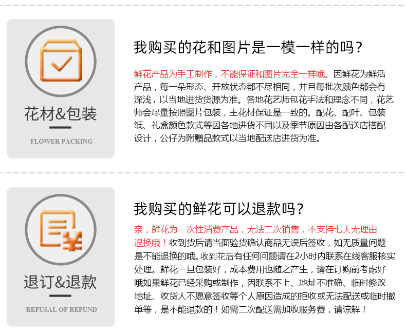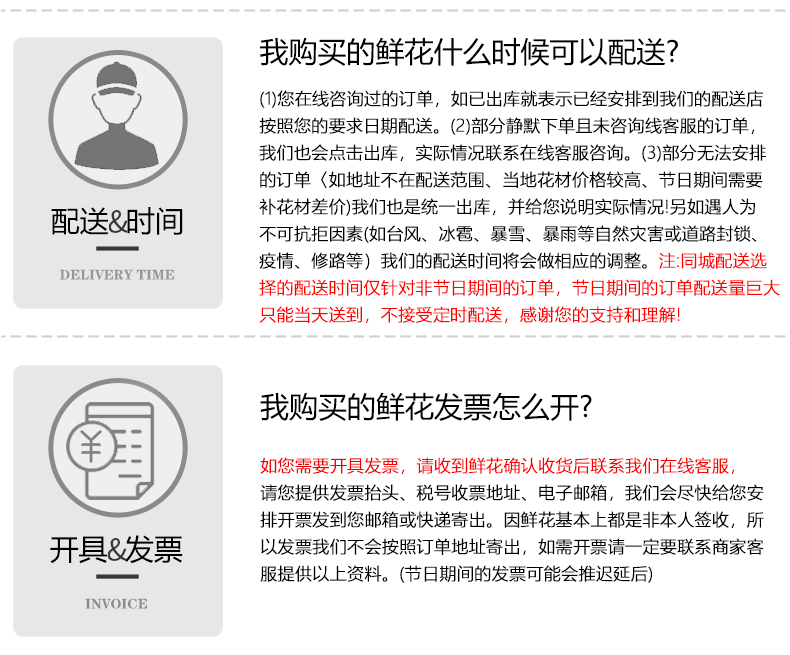 - 本店承接全国市区同城送花服务,同城花店专人专车送花上门。平时下单30分钟至3小时送达! 下单后为了不影响您的订单配送,请在微信公众号上和客服确认,谢谢配合 投诉电话:15815551580