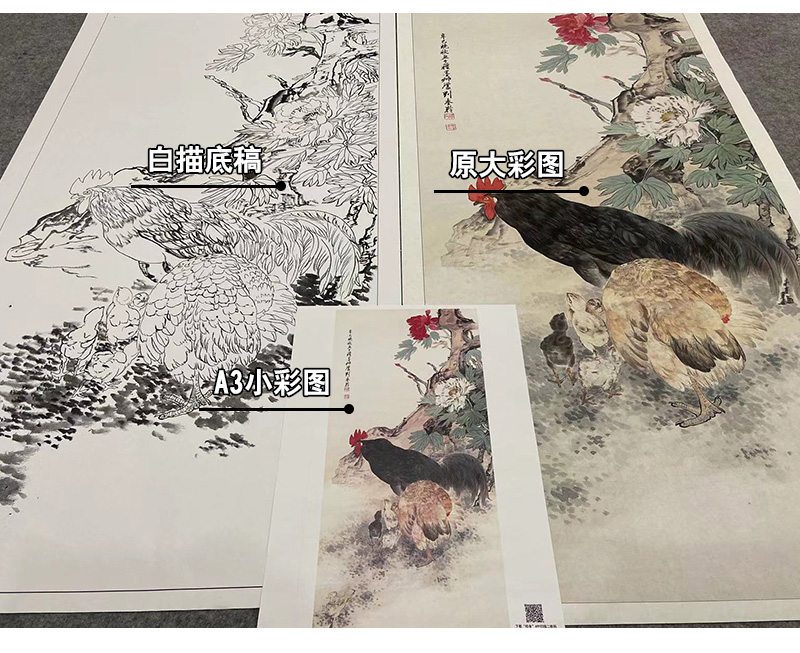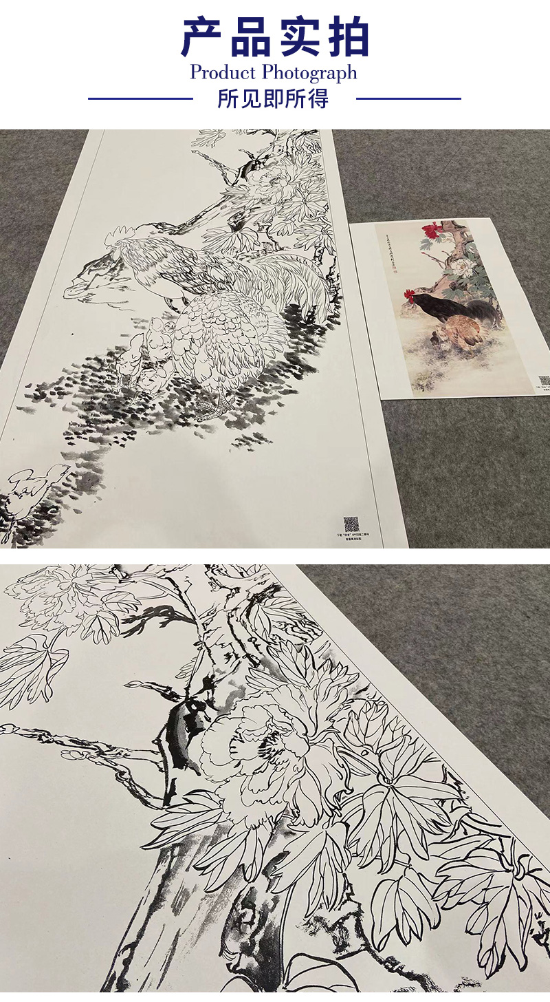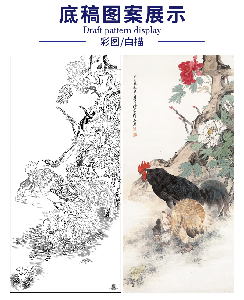 【大彩图】刘奎龄工笔画白描底稿《鸡鸣富贵图》公鸡牡丹临摹勾线花鸟线稿HN22
