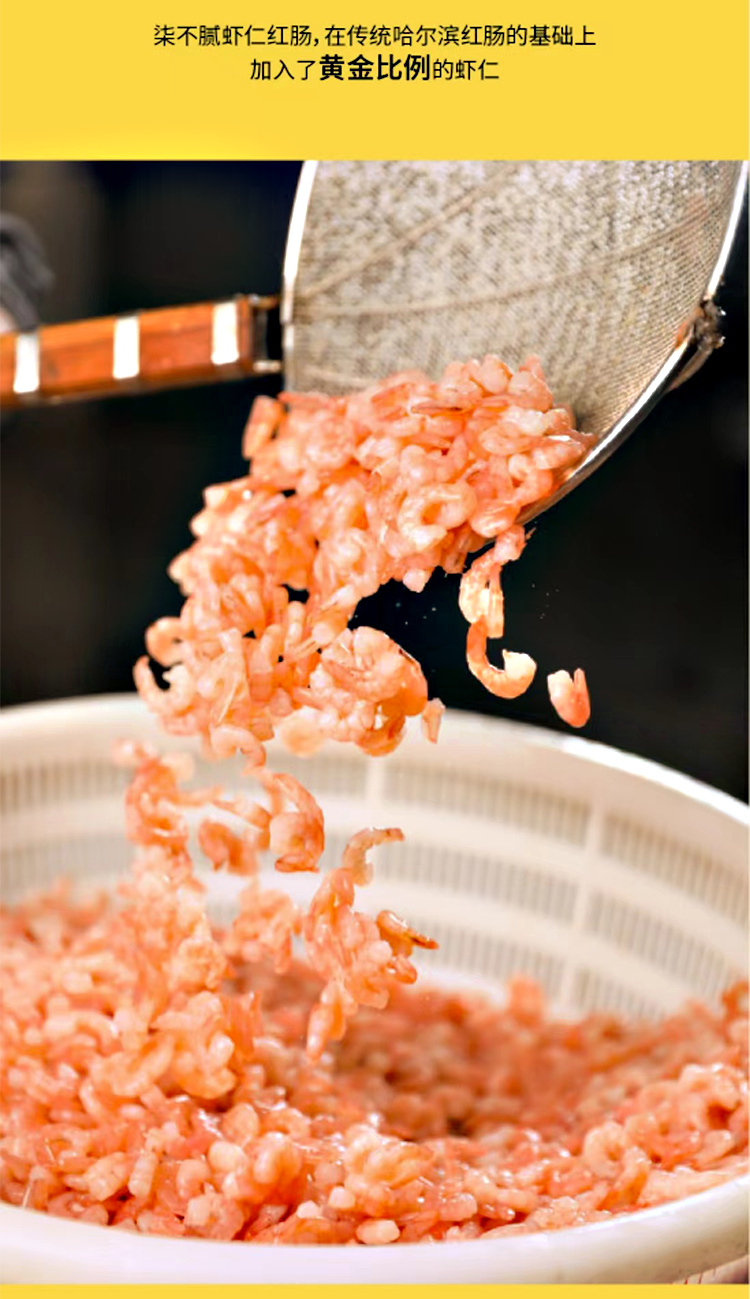 1.红肠添加鲜虾仁制作,海鲜、虾过敏者请勿食用