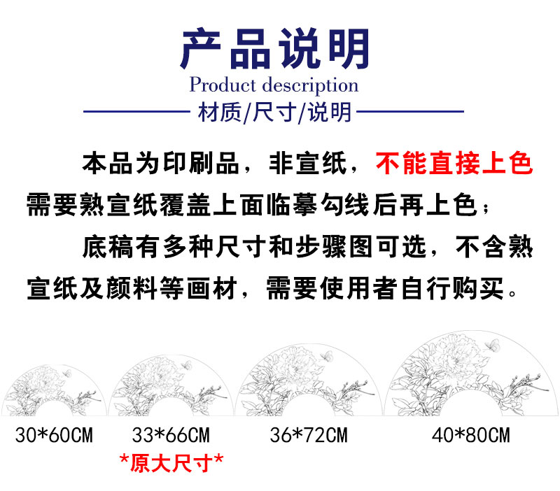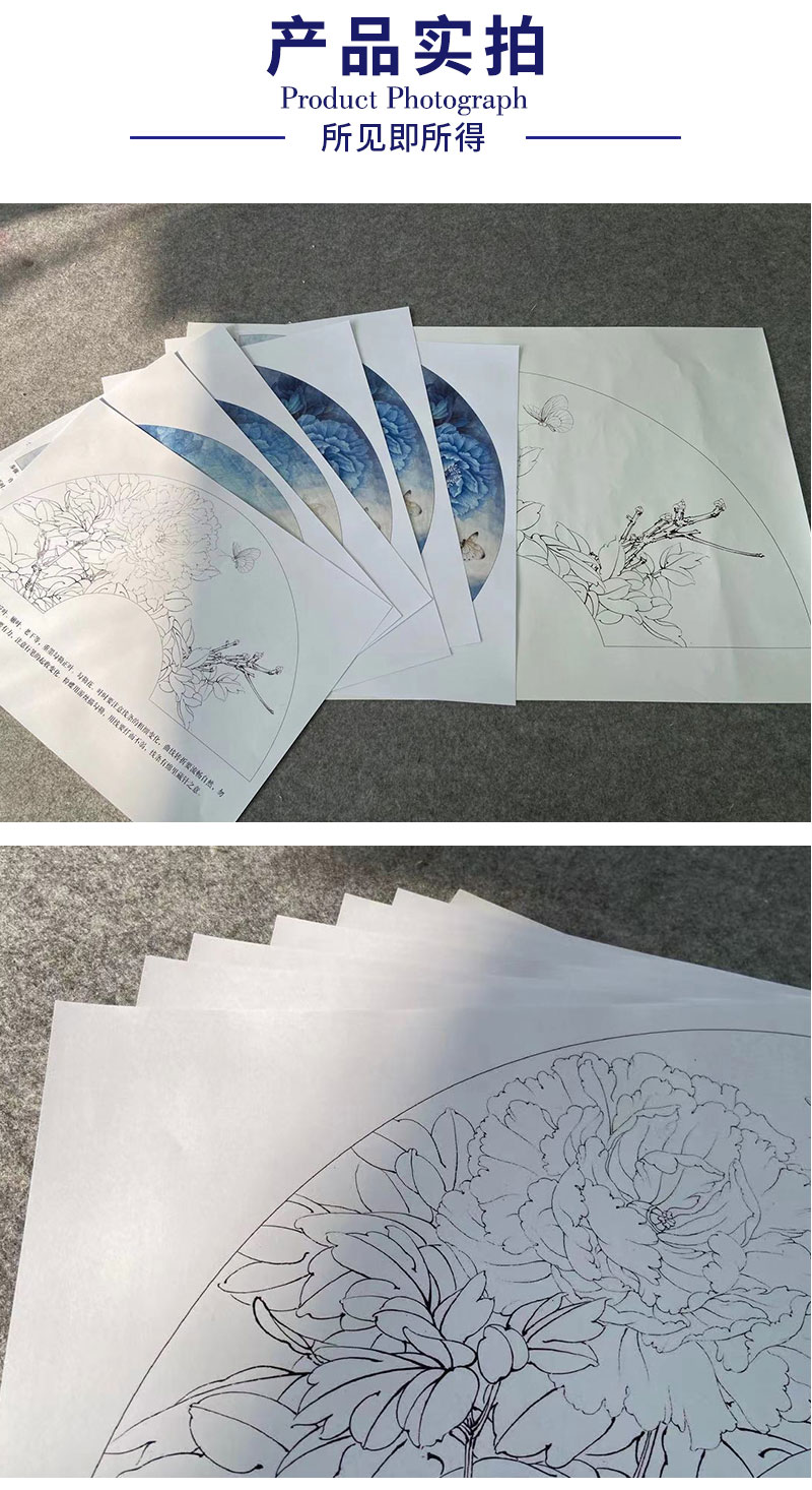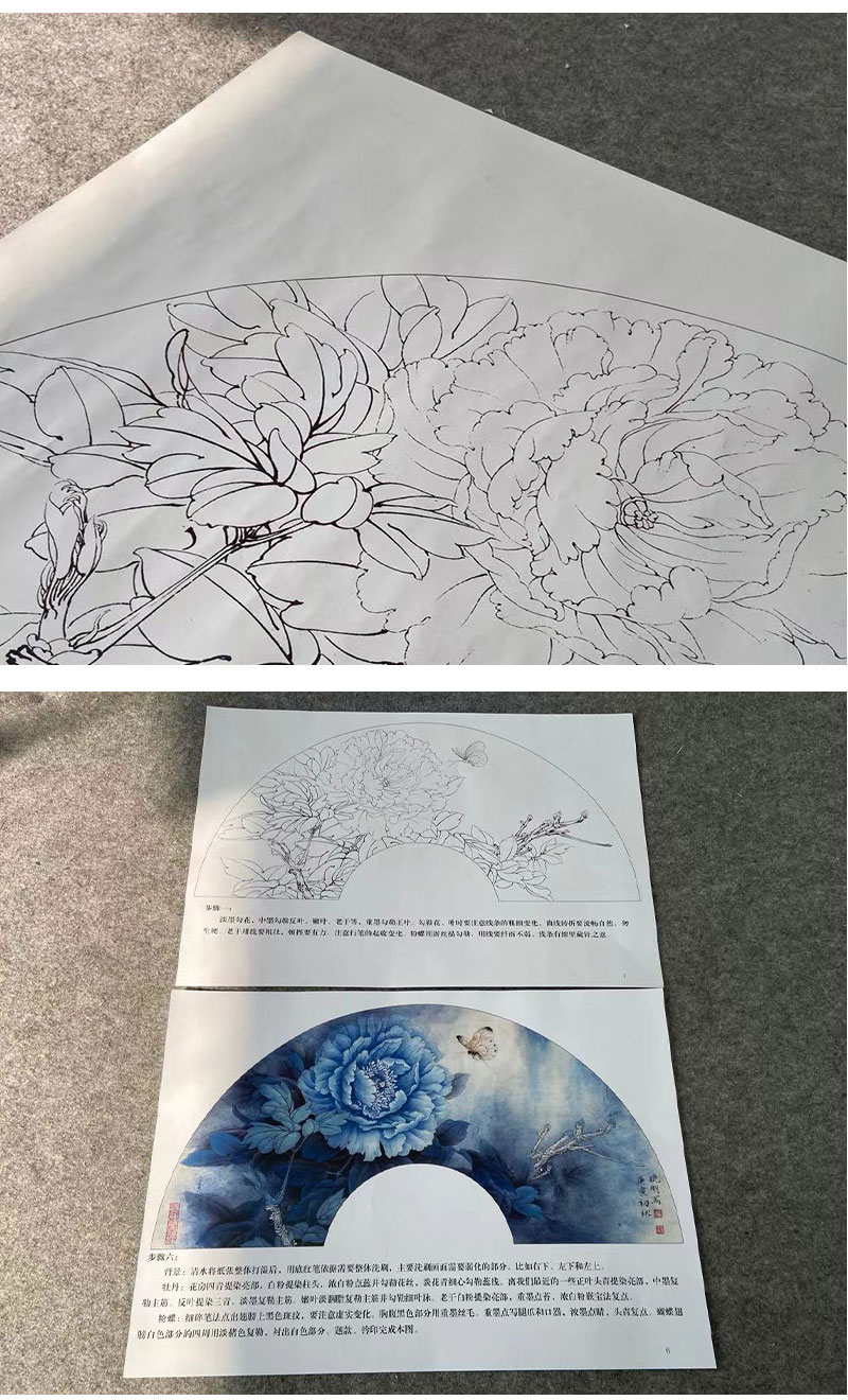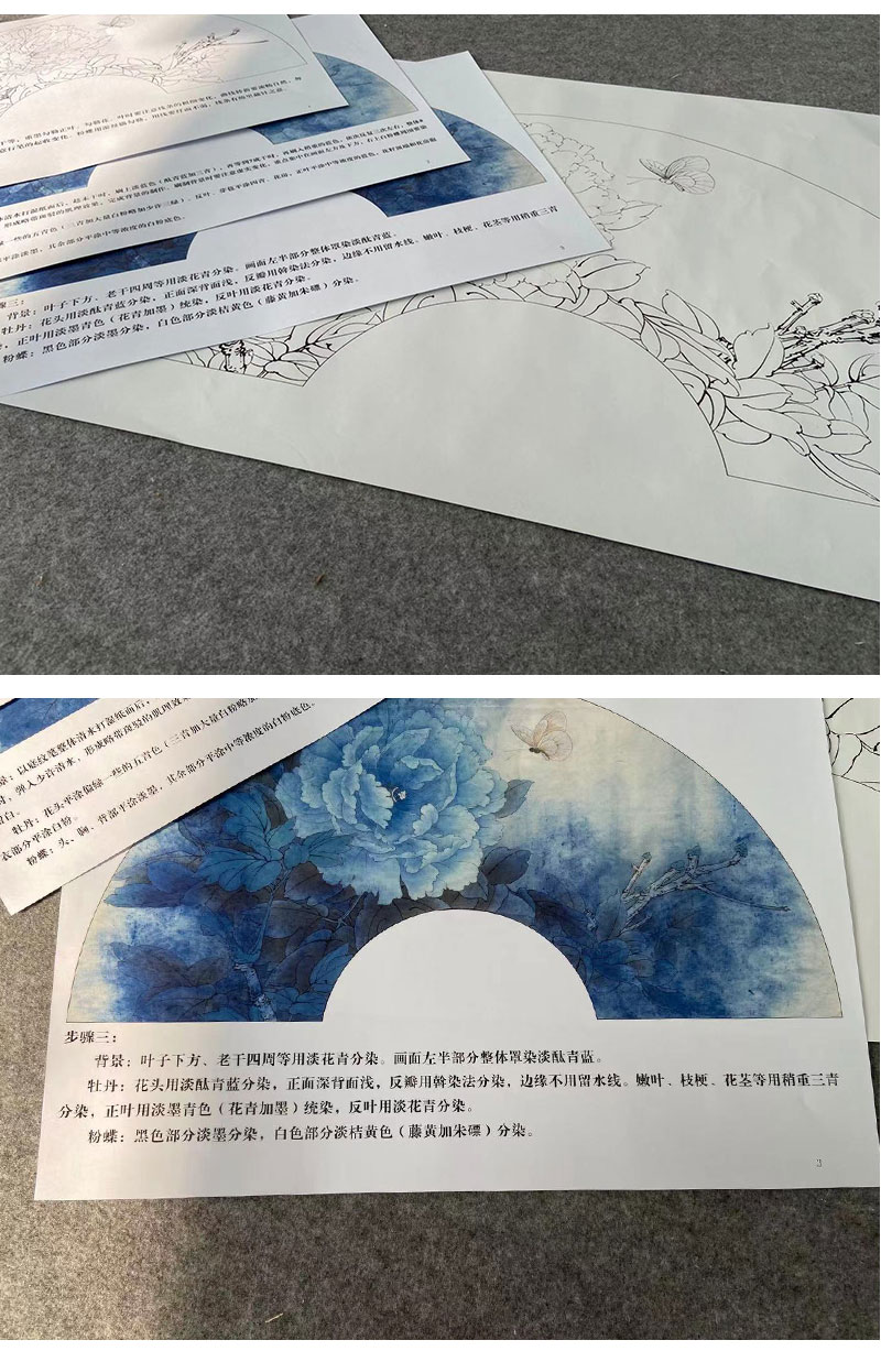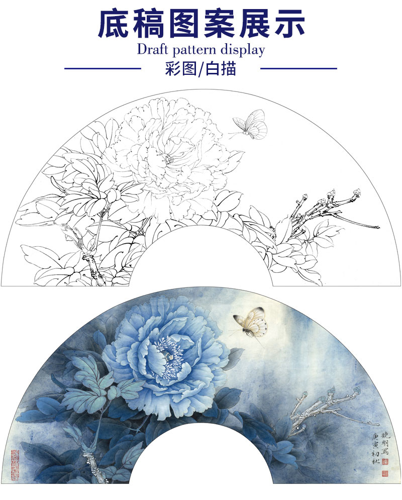 【有步骤、大彩图】李晓明工笔画白描底稿扇面小品《白蝶蓝田玉》牡丹蝴蝶初学者临摹花鸟线稿KD07
