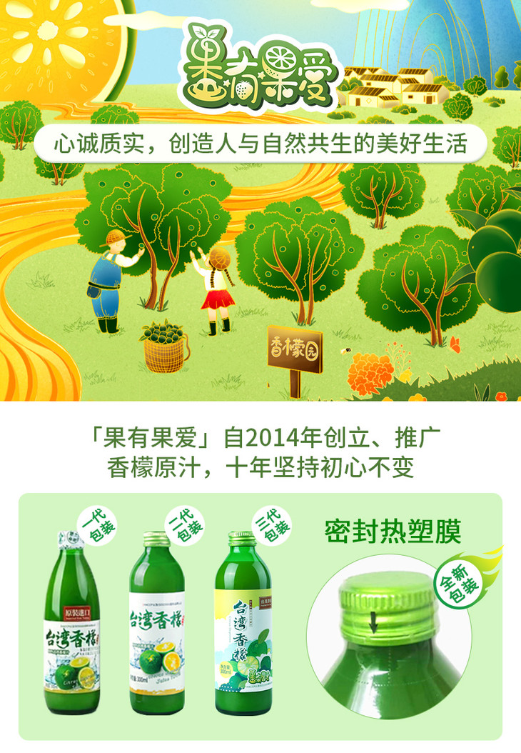 香檬原汁 | 300ml/瓶 台湾香檬原浆 NFC非浓缩还原 果汁饮料 玻璃瓶装 果有果爱