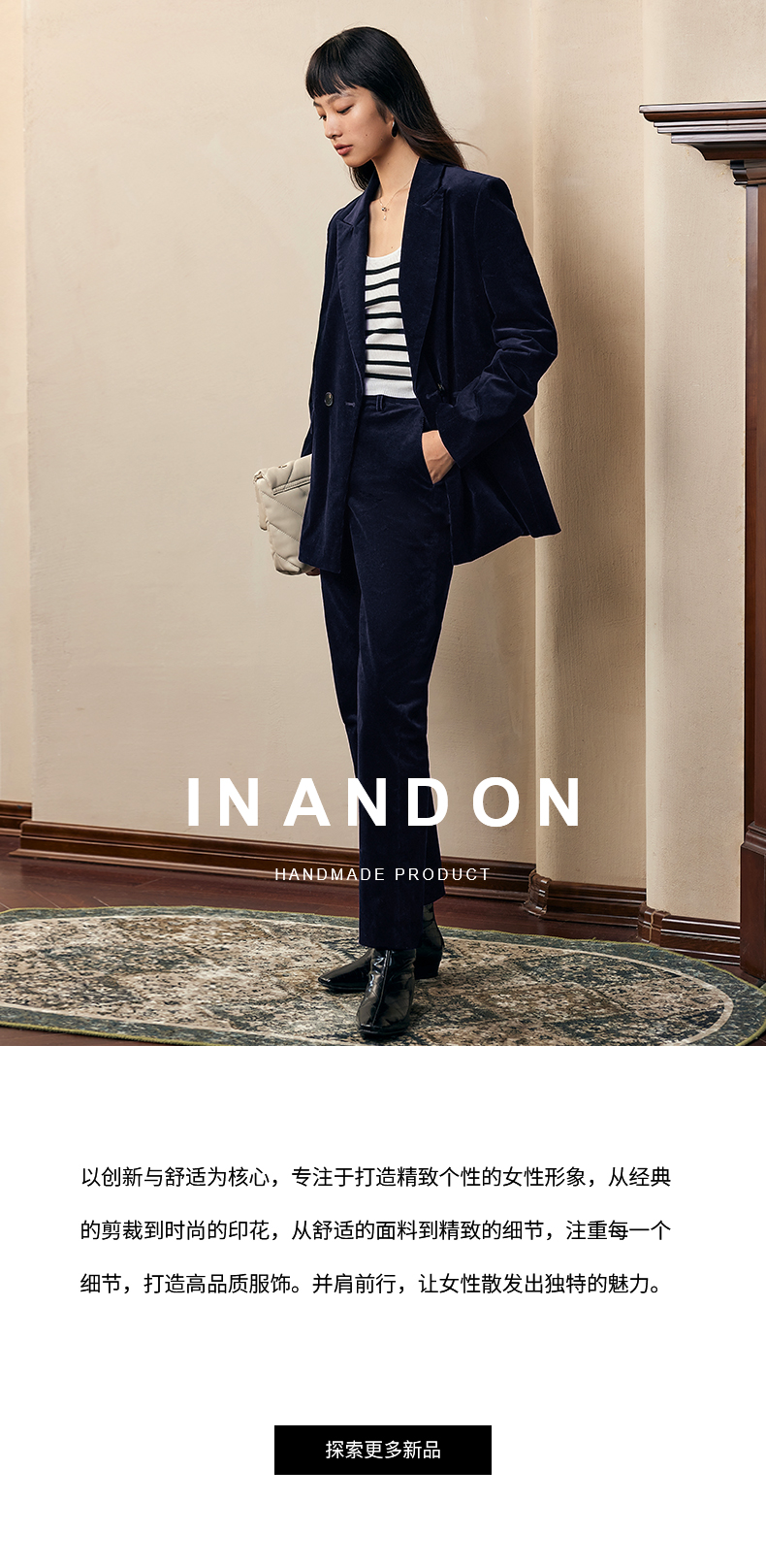 IN AND ON—轻奢时尚品牌,以“致力于做你衣柜永远不肯丢掉的那一件”作为品牌理念,打造“轻奢时尚”的品牌定位。拥有时尚前沿的商品设计能力并将品质与价值进行完美平衡,致力为消费者提供舒适与奢华、创新与智能的完美购物体验。塑造独立自主的女性形象,让每个人都能拥有属于自己的时尚风格。