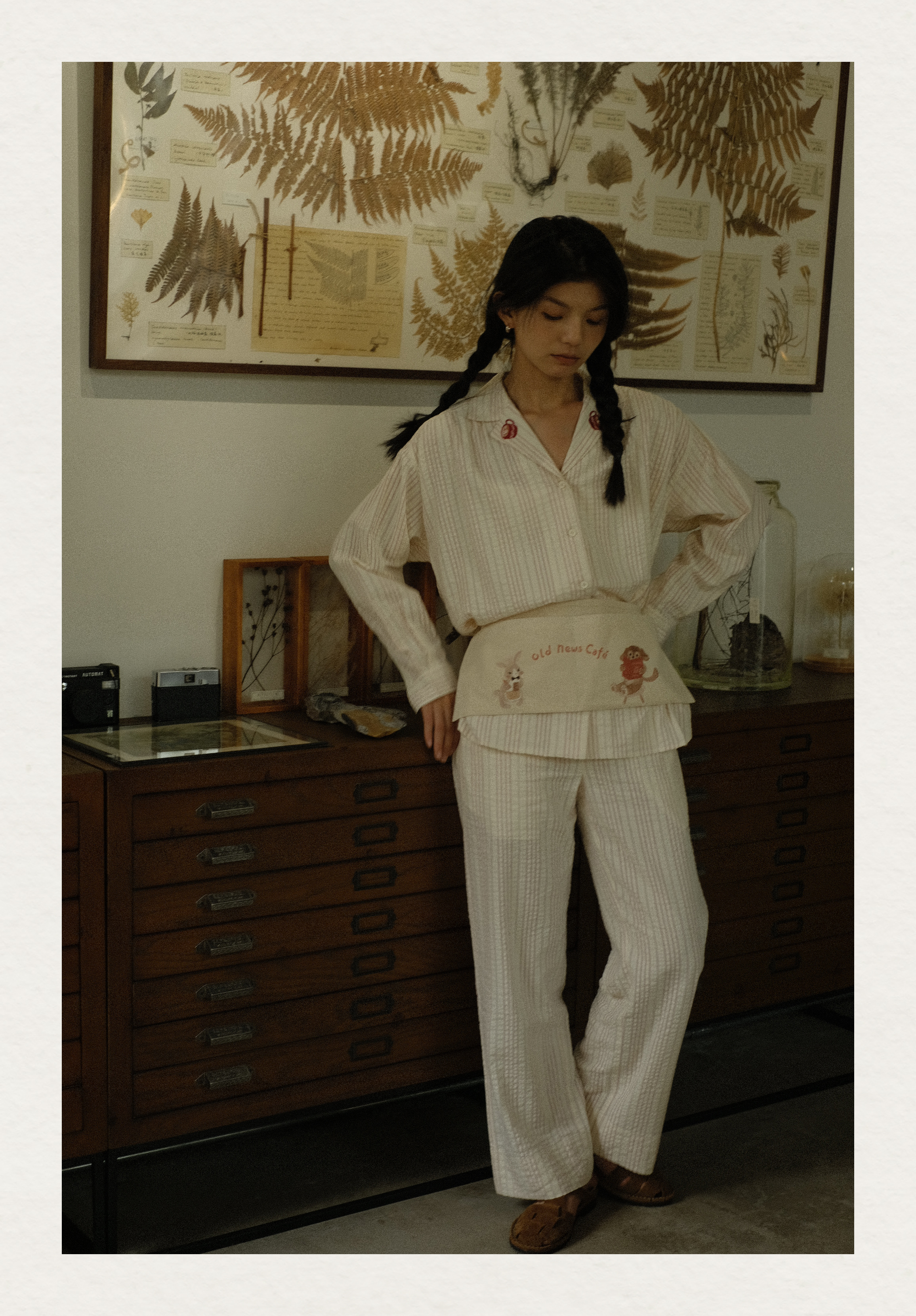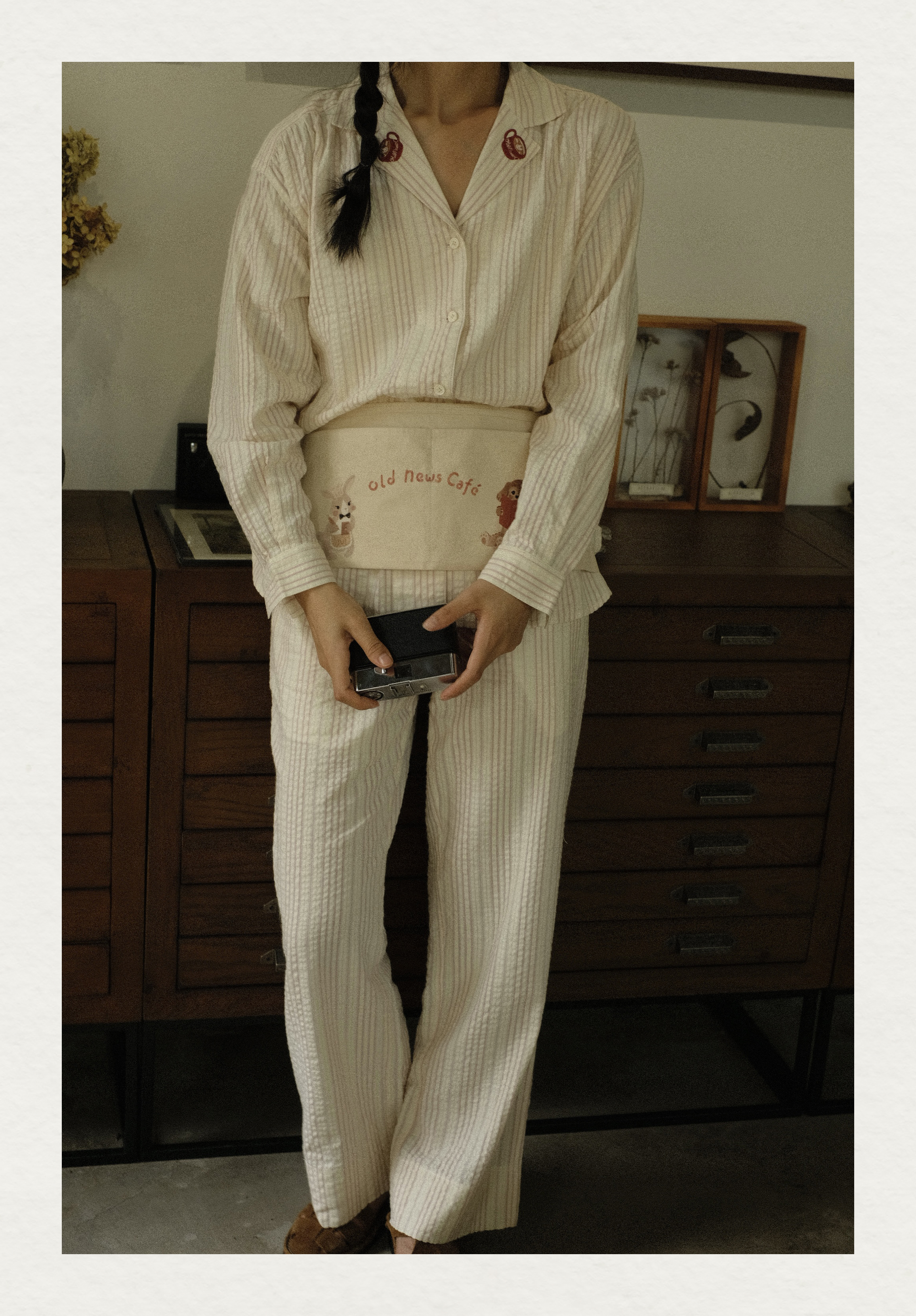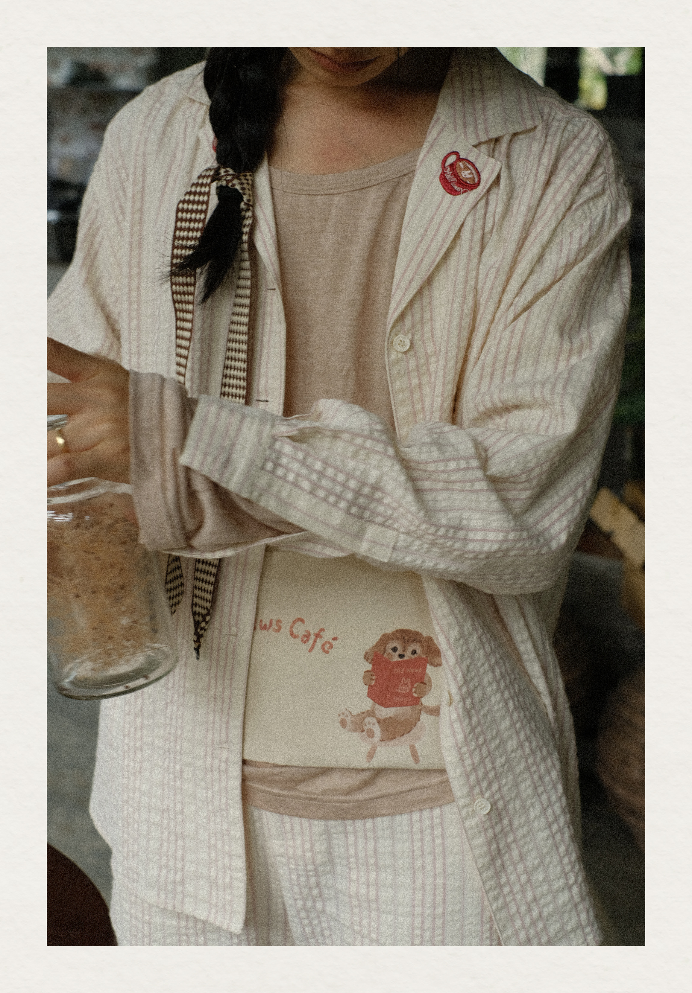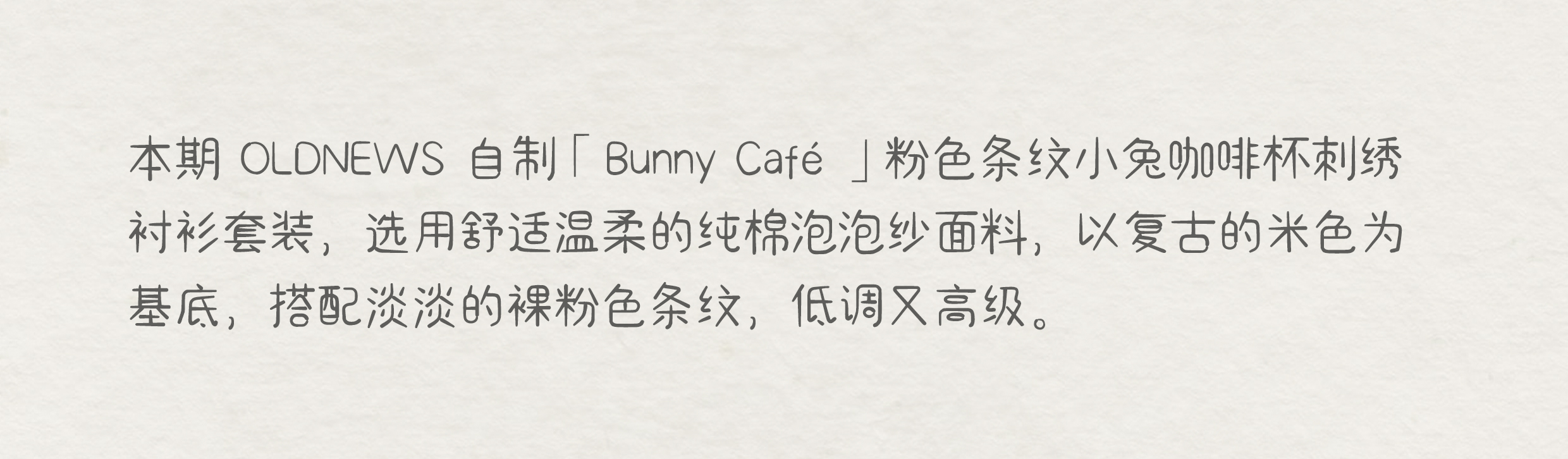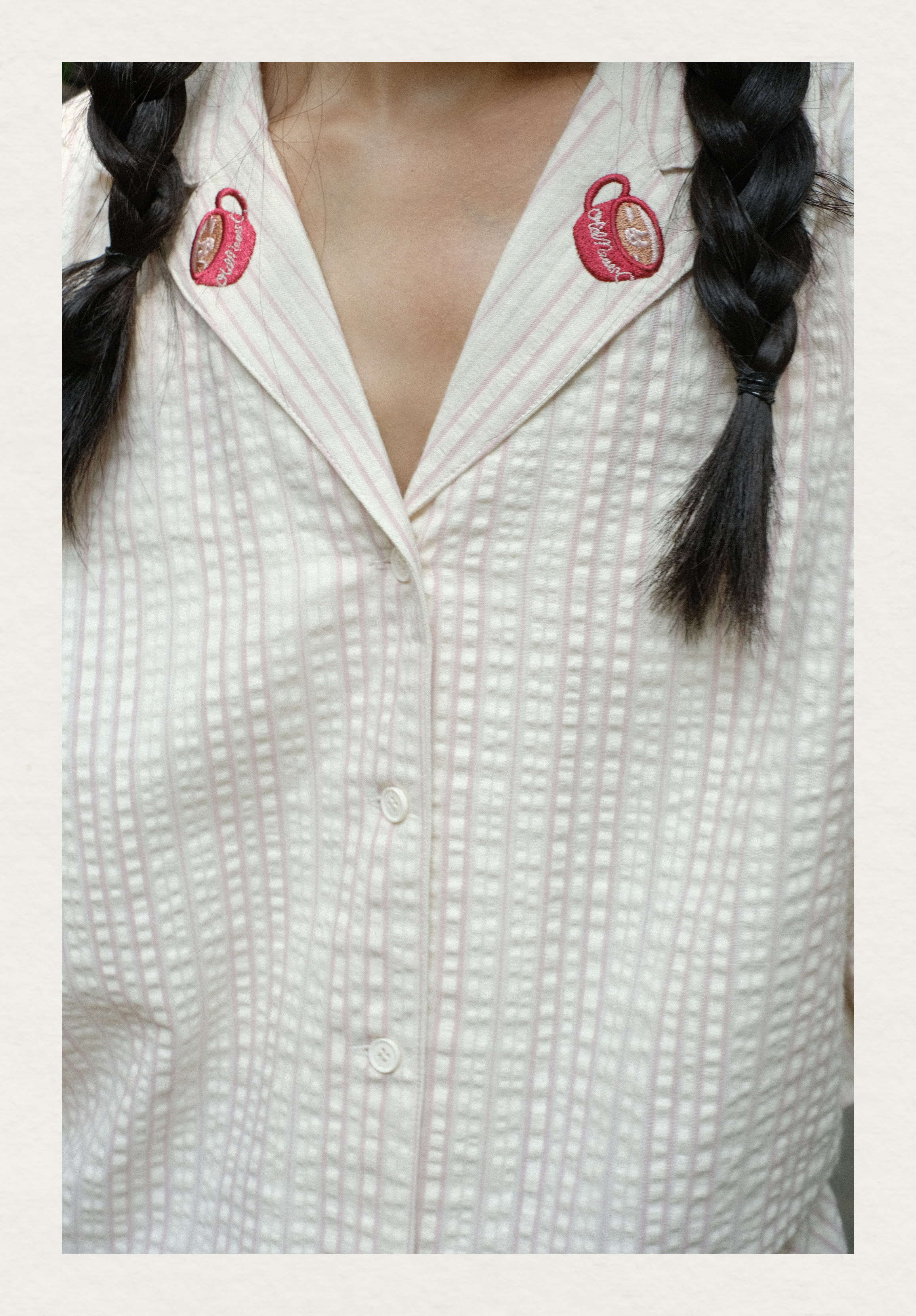 「Bunny Café」粉色条纹小兔咖啡杯刺绣衬衫套装